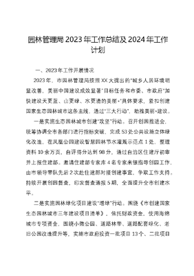 园林管理局2023年工作总结及2024年工作计划 一、2023年工作开展情况2023年,市园林管理局按照XX大提出的城乡人居环境明显改善,美丽中国建设成效显著目标任务和市委、市政府加快建设天更蓝、山更绿、水更清的美丽*具体要求,紧扣创建国家生态园林城市这条主线,通过三大行动,助推美丽*建设。一是实施生态园林城市创建攻坚行动。召开创园推进会,统筹协调全市各部门进行指标突破,完成53处公共设施立体绿化改造,在凤凰公园建设智慧园林节水灌溉示范点1处,整理资料10余万页,自评得分达到98分,通过自治区住建厅初审并上报住建部。邀请住建部专家库4名专家来银指导创园工作,由市领导带队先后2次赴住建部对接创建事宜,争取工作支持。持续开展创园督查,印发督查通报5期,全面提升全市创建水平。二是实施园林绿化项目建设增绿行动。围绕《市创建国家生态园林城市三年建设项目清单》,依托财政资金,使用海绵城市专项资金,围绕小微公园、道路林带、道路配套绿化、老旧公园改造提升等,实施市政府投资一批项目13个、二批项目4个,列入市政府投资第三批项目4个,累计完成投资5712万元。争取社会投资,与13家企业签订认建认养协议14份,企业总投资超3000万元,实现园林绿化政府资金、专项资金与社会投资的三轮驱动。三是实施公共绿地景观品质提升行动。启动实施园林绿化品质提升及精细化管理三年行动,完成11个公园主题风格改造,对1万余株主干道路行道树和综合公园行道树实施深根注水肥复壮;引进天门冬等10余个新优品种,推广种植麦冬、紫花地丁等耐阴植物500余亩;对主干道路3万余株行道树和分车带进行科学修剪,形成色彩分明、线条流畅、层次丰富的绿带空间;对40余处景观节点实施绿地补白和微更新,持续开展便民化微改造100余处。通过39类具体措施,实现园林绿化品质大提升。二、亮点工作(一)小微公园建设2023年政府工作报告和民生十心实事要求,新建8个小微公园。今年以来,市园林管理局深刻践行住建部口袋公园建设理念,接续开展小微添绿,实施大团结广场南侧小微公园等8个小微公园,公园建设上坚持一园一景,融入地域文化、乡土特色植物和海绵城市理念,增加休闲健身、适老适幼等功能设施,让公园更好的服务民生需求。列入市政府第一批投资项目的7个小微公园目前已全部竣工,列入市政府第二批投资项目的黄河路小微公园于6月中旬开工,计划10月底全面完工。完成年初签订的创新突破工作承诺书要求,在全区率先建成百园之城。(二)景观提质增效2023年政府工作报告要求,实施绿地景观提质增效行动。今年以来,市园林管理局依托园林绿化品质提升及精细化管理三年行动,试点开展星级公园评定,制定印发星级公园评定管理办法,7月底对首批星级公园授牌,完成创新突破工作承诺书在全区率先建立星级公园评定体系承诺事项。推广市民园长工作机制,完成海宝公园、览山公园、森林公园市民园长选聘工作。推进诗词文化进公园,选取20余首与银川、黄河、贺兰山相关诗词,采用石刻、木刻等方式在近30个公园广场增加文化景观50余处。(三)绿地开放共享根据《住房和城乡建设部办公厅关于开展城市公园绿地开放共享试点工作的通知》(建办城函〔2023〕31号)、《自治区住房和城乡建设厅关于开展城市公园绿地开放共享试点工作的通知》(宁建(城)发〔2023〕6号),市园林管理局在反复论证基础上,利用现有和在建公园绿地空间,合理规划空间布局,编制《市城市公园绿地开放共享试点工作实施方案》,4月初上报自治区住建厅,成功争取自治区城市公园绿地开放共享试点。首批试点开放529亩公园绿地,均位于城市建成区,形成我市自有特色。三、存在的问题创建国家生态园林城市工作年底前无法完成。按照《住房和城乡建设部关于印发国家园林城市申报与评选管理办法的通知》(建城〔2022〕2号)中的申报条件要求,申报城市近2年内(申报当年及前一年自然年内)未发生重大安全、污染、破坏生态环境、破坏历史文化资源等事件,未发生违背城市发展规律的破坏性建设和大规模迁移砍伐城市树木等行为,未被级以上住房和城乡建设(园林绿化)主管部门通报批评。近期,住建部城建司园林处答复,因发生富洋烧烤店6·21特别重大燃气爆炸事故,市不符合国家生态园林城市评审条件,今年不予评审。市园林管理局将持续对接自治区住建厅与住建部积极沟通,不断推进创建工作,力争明年重新申报。四、2024年工作计划2024年,市园林管理局以XXX新时代中国特色社会主义思想为指导,坚定扛起加快建设黄河流域生态保护和高质量发展先行区示范市使命任务,紧紧围绕园林绿化主责主业,植一城青绿、筑生态屏障、绘满眼繁花、解民心所盼,奋力谱写美丽*建设*篇章,全力提升美丽*新颜值。(一)以绿绘底,谋划好绿染凤城项目