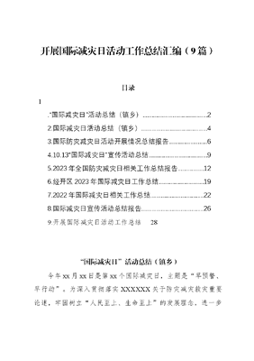 开展国际减灾日活动工作总结汇编(9篇)目录1.国际减灾日活动总结(镇乡).22.国际减灾日活动总结(镇乡)..43.国际防灾减灾日活动开展情况总结报告.64.10.13国际减灾日宣传活动总结95.2023年全国防灾减灾日相关工作总结报告..126.经开区2023年国际减灾日工作总结197.2022年国际减灾日相关工作总结..228.国际减灾日宣传活动总结报告..269.开展国际减灾日活动工作总结28国际减灾日活动总结(镇乡)今年xx月xx日是第xx个国际减灾日,主题是早预警、早行动。为深入贯彻落实XXXXXX关于防灾减灾救灾重要论述,牢固树立人民至上、生命至上的发展理念,进一步强化风险意识,筑牢底线思维,根据国务院、省、市安委会统一部署和富减灾委《关于做好2022年国际减灾日有关工作的通知》(x减委办发〔2022〕x号)文件精神,我镇高度重视,并就相关工作进行了安排部署,现将工作情况总结如下:一、领导高度重视,组织措施到位此次活动,xx镇党委政府高度重视,党委书记闵利强调全镇上下要提高思想认识,切实增强防灾减灾工作的责任,强化防灾减灾宣传,结合全镇实际,采取多种措施,加大防灾减灾工作的宣传力度;开展安全隐患排查,重点做好防洪防汛、森林防火、道路交通等工作。二、周密部署,开展宣传我镇积极发动村社干部和学校通过广播、QQ、微信等开展多样式宣传,发放宣传资料xxx余份,有效提高了干部群众的防灾减灾意识。积极开展进农村、进学校、进企业、进社区宣传活动组织开展宣传进校园活动。在全镇中小学广泛组织开展防灾减灾宣传教育活动,提高广大中小学生的防灾减灾意识和自救互救能力。组织开展宣传进企业活动。结合安全生产检查,组织企业查找灾害风险隐患和防灾减灾薄弱环节,加强员工安全教育培训,提高安全生产和防灾减灾意识。组织开展宣传进农村、进社区活动。通过宣传单、标语、院坝会等多种宣传渠道,开展防地质灾害、防汛抗旱、防震减灾、有害生物防治等防灾减灾知识科普宣传,增强广大镇村居民对防灾减灾的认识,提高了防灾减灾意识。三、工作成效防灾减灾事关广大人民群众的生命财产安全和切身利益,做好防灾减灾工作的关键是要不断提高人民群众的防灾减灾意识。下一步,我镇会继续推进防灾减灾工作,做好防灾减灾知识的普及、宣传,不断唤起全民防灾意识,提高灾害风险治理能力,构建和谐平安社会。通过此次开展国际减灾日宣传活动,进一步增强了群众对防灾减灾的认识,推广普及了全民防灾减灾知识和避灾自救技能,落实了应付突发事件的防范措施,提高了干部群众综合减灾能力,使我镇的安全生产形势得到稳定,为我镇下一步安全生产工作部署打好了基础。国际减灾日活动总结(镇乡)今年xx月xx日是我国第xx个国际防灾减灾日,主题是共同打造有韧性的未来。为广泛宣传和普及灾害知识、防灾减灾知识、应急避险知识,按照xx市减灾委员会的通知要求,我镇通过开展集中宣传和防灾减灾知识进农村的宣传活动,进一步增强了全镇干部群众防灾减灾意识,提高了综合减灾能力。现将活动开展情况汇报如下:一、高度重视,强化领导。成立以政府书记、镇长任组长,主管领导政府副镇长xxx副组长,安监站、综治办、派出所、司法所、水利站、林业站等部门负责人为成员的防灾减灾宣传活动工作领导小组,加大统筹协调力度,细化活动方案,明确职责,落实专人,保障经费,广泛发动群众积极参与,积极开展防灾减灾宣传活动。二、认真组织,开展宣传。我镇在xx月xx日召开了宣传暨培训会议,xx月xx日开始进行下乡入户减灾宣传,同时在集市进行了防灾减灾、救援救助工作宣传,班子成员及多名工作人员参加了本次活动,有效提高了广大群众的防灾减灾意识。三、加大宣传力度,积极开展防灾减灾到每个人宣传活动,提高全民防灾减灾意识。1、组织开展宣传进校园活动。学校利用学生自制海报普及防灾减灾小知识,让学生参与进来。2、组织开展宣传进企业活动。结合安全生产检查,组织企业查找灾害风险隐患和防灾减灾薄弱环节,认真制定整改方案,加强员工安全教育培训,提高安全生产和防灾减灾意识。3、组织开展宣传进农村、进家庭活动。我镇通过下乡干部入户进行防灾减灾知识的宣传,真正做到点对点了解
