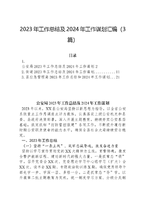 2023年工作总结及2024年工作谋划汇编(3篇)目录1.公安局2023年工作总结及2024年工作谋划22.街道2023年工作总结及2024年工作谋划..113.县应急管理局2023年工作总结和2024年工作谋划21公安局2023年工作总结及2024年工作谋划2023年以来,XX县公安局坚持以新思想为指导,以全省公安系统重点工作月调度点评为载体,认真落实上级公安机关和县委、县政府决策部署,深入开展主题教育,持续夯实公安基层基础,抓实抓细打防管控服建各项工作,不断提升履行新时期公安职责使命的能力水平,确保全县社会大局持续安全稳定。一、2023年工作总结(一)坚持一条主线,筑牢忠诚警魂,激发奋进力量坚持以学习宣传贯彻党的XX大精神为主线,育警铸魂,激发全警护航新征程、建功新时代的强大力量。一是抓常态领学。召开党委会XX次、党委理论学习中心组学习(扩大)会XX次、读书会XX期、专题政治轮训班X期,确保党员领导干部先学一步、学深一层、多悟一分。二是抓常态导学。以开展第二批主题教育为契机,统一制发学习方案、分级分类制定学习计划、征订学习书籍XXX余本。三是抓常态研学。组织全警围绕学习贯彻XXXXXX给中国人民公安大学在读英烈子女回信精神、XXX法治思想等开展交流研讨,举办人民警察节升旗仪式,组织开展祭扫英烈、重温入警誓词、收听收看《榜样》节目及参观XX清廉馆等系列活动,引导全警带着忠诚、带着使命学。(二)坚守两个阵地,扛实政治安全责任,夯实发展根基坚定不移贯彻总体国家安全观,管好网上网下两个阵地,持续巩固涉政安全防线。一是网下夯基础。组织开展各类专项行动及基础调查XX次。捣毁团伙X个、窝点X处,带破案件XX起。二是网上筑屏障。严格落实X×XX小时网络巡查机制,强化网络阵地源头管控。(三)推进三大建设,坚持固本兴新,助推工作高质量发展1.加强智慧公安建设。一是打造视频监控防控体系。雪亮工程二期暨天网四期项目汇聚XXXX余个视频监控,强化系统运用,提供案件线索XXX余条,服务群众XXX余人次。二是完善一张图指挥系统。加速智能设更代和配备,最大限度实现警力、警情、警车等要素可视化呈现、扁平化指挥调度。三是常态开展关城门实战演练。为有效防范沿街店铺侵财案件发生,打造沿街店铺可防性案件主动防御机制。2.推进法治公安建设。一是紧盯主体责任,拧紧四审责任链条。形成一把手亲自抓、分管领导专职抓、法制部门牵头抓、基层所队具体抓的层级责任链条,推动执法事项由事后被动处置向事前业务指导、事中流程把控转变。二是紧盯问题症结,推动执法全流程监督。深度融合接处警系统、执法办案系统,实行日巡查、周通报、月考评制度,截至目前。三是紧盯结果运用,提升执法办案质效。强化执法办案积分制结果运用,落实奖惩措施,开展刑事、行政两个序列开展最优、最差案卷评比,落实执法之星月评比和末位单位黄牌警示、红牌否优制度,通过执法数据日晾晒、周整改、月推进,提升警情处置和案件办结效率。3.努力打造为民公安。一是优化窗口服务。对照省委一改两位要求,持续推进跨省通办、全程网办和延时、错时、容缺办等便民利企服务,办结各类行政审批服务业务XXXXX件,其中签发审核第二代居民身份证XXXX件,户政类审批XXX件,公章准刻制备案XXXX件,民用爆炸物品购买、运输许可证签发XXXX件,边境通行证XX件,居住证XXX件,为其他政府部门提供数据或信息核查XXX件。二是做实指尖警务。以网上警民议事厅微信群为平台,落实便民服务、提醒告知等七大工作机制,发布各类安全防范宣传X万余条,开展便民服务XXXX余次,解决群众具体诉求XXX余件。三是护航企业发展。严格落实一企一警联系机制和助力经济高质量发展XX条措施,通过组建警企微信群、优化园区经侦服务站、设立经济犯罪案件接报案中心,进一步畅通警企沟通渠道,解决企业困难。破获涉企诈骗案件,为企业挽回损失XX余万元。(四)稳固四条防线,打造高效主动警务,提升平安指数1.强化社会面防控。一是常态化开展巡逻防控。持续深化社会面防控四项机制和X、X、X分钟快速反应机制,落实屯警街面和动中备勤要求,通过科技+警力+群防力量立体化巡逻防控,切实提高街面见警率和管事率。二是强化视频巡查防控。指挥大厅专设视频巡查岗的基础上,以派出所勤务指挥室建设为契机,组织警力对重点路段、时段视频监控开展一日三巡查,做到警情第一时间发现、第一时间处置、第一时间反馈,实现工作闭环的同时,提高打击防范质效。三是扎实开展夏季治安打击整治专项行动。夏季行动以来,共组织开展统一宣防行动X次,投入警力XXXX人次,发动社会力量XXX人次,盘查人员XXXX人次、车辆XXXX