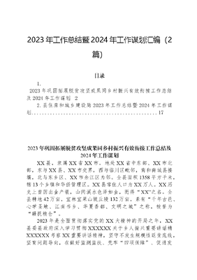 2023年工作总结暨2024年工作谋划汇编(2篇)目录1.2023年巩固拓展脱贫攻坚成果同乡村振兴有效衔接工作总结及2024年工作谋划22.县住房和城乡建设局2023年工作总结暨2024年工作谋划..172023年巩固拓展脱贫攻坚成果同乡村振兴有效衔接工作总结及2024年工作谋划XX县,隶属XX省XX市,地处XX省中东部、XX市北部,东与XX县、XX市交界,西与临川区毗邻,南和南城县接壤,北与东乡区、XX市余江区为邻。全县面积1358平方千米,辖13个乡镇和华侨管理区。XX县常住人口为XX万人。XX历史上曾因出金产银,山间溪水色泽如金,而得XX之名。全县耕地42万亩,宜林宜果山坡丘陵132万亩,素有千年古邑、心学圣地、江南书乡、华夏香都、文明之城之称,被誉为赣抚粮仓。2023年是全面贯彻落实党的XX大精神的开局之年,XX县委县政府深入学习贯彻XXXXXX关于乡人振兴重要讲话精XXXXXX考察XX重要讲话精神,坚守不发生规模性返贫底线,坚育问题导向,在做好监测监扶、兜牢四项保障、促进发展增收、夯实基层基础上精准发力,全力推动巩固拓展脱贫攻坚成果同乡人振兴有效衔接工作见行见效。国家乡人振兴简报2023第46期刊登《XXXX强化三个聚焦引进人才助力乡人振兴》中介绍了XX县乡人规划师经验做法;2023年9月1日《中国乡人振兴》杂志第17期经验交流刊登《XXXX:五种举措绘就乡人振兴大美画卷》。现将XX县2023年度巩固拓展脱贫攻坚成果同乡人振兴有效衔接工作进展情况汇报如下。一、工作进展及成效(一)牢记使命担当,推动责任落实1.扛牢政慧责任。坚育把巩固拓展脱贫攻坚成果同乡人振兴有效衔接作为坚定两个确立、树牢四个意识、坚定四个自信、做到两个维理的具体行动,特别是作为落实XXXXXX视察XX重要讲话精神的首要任务。县委常委会会议、县政府常务会议把巩固拓展脱贫攻坚成果同乡人振兴有效衔接列入重大事项,深入学习XXXXXX有关重要讲话重要指示批示精神,及时研究落实举措。切实推动巩固拓展脱贫攻坚成果同乡人振兴有效衔接,不断增强农业农人内生发展动力,全面推进乡人振兴。2.强化调研督导。县委、县政府主要领导扶头落实重点人众访监扶制度,深入基层了解情况,解决存在的问题,扎实推进工作落实。县四套班子深入挂点乡镇,对标巩固拓展脱贫攻坚成果要求,开展督导指导,切实解决乡人存在的实际困难和问题。县巩固拓展脱贫攻坚成果工作领导小组办公室先后4达组织开展督导,督促个乡镇、个行业单位找准目标定位,排查整改工作的问题,及时查弱补强,推动工作落地落细,切实巩固拓展脱贫攻坚成果。3.健全工作机制。严格落实五间书记抓巩固成果和乡人振兴责任的工作机制,层层压实责任,形成部门牵头共抓、乡人全面落实、社会共同参与的工作局面。一是育续强化驻人监扶。在选派37个驻人工作队结对监扶重点人的基础上,开展人才服务·溪心强人行动,139家县直单位共140余名乡人规划师结对113个人党组织,从政慧理论学习、基层组织建设、为人服务等八个方面助人。打造金事精办数字化管理平台,建立人人点单、集体审单、人组下单、城市人才(结对监扶党组织)接单、双向评单的五单服务模式,实现线上对接、线下监扶服务模式。截至目前,个乡镇共发起活动500余起,县直单位1300余名城市人才协助人党组织办理人生实事600余件。二是强化工作指导。出台了《关于全面推进乡人振兴加快建设农业强县的实施意见》《关于进一步健全完善监扶资金项目联农扶农机制的实施细则》等文件,进一步明确工作目标和要求。三是建立双月考核机制。采取日常考核与督查暗访相结合方式,每两个月对全县14个乡镇(区)开展一达督查考核。主要考核巩固拓展脱贫攻坚成果同乡人振兴有效衔接个项工作进展情况和问题整改完成情况。县政府办每两个月汇总评分情况,对乡镇由高到低进行排位,并纳入全县年终高质量发展考评,呈报县领导参阅。(二)聚焦重点任务,筑牢防返贫底线1.强化教育保障。育续落实《关于实现巩固拓展教育脱贫攻坚成果同乡人振兴有效衔接的实施意见》,全县脱贫户和监测对象在读子女全部纳入现有教育监扶体系,确保每个脱贫户和监测对象在读子女教育资助应助尽助。2023年,发放脱贫户监测户学生助学金3091人达XX万元。为义务教育建档立卡学生落实零收费政策2127人达X万元;为普通高中建档立卡等贫困学生免除学杂费851人达XX万元;为中职学校脱贫户监测户学生免除学费144人达XX万元,进一步兜牢教育保障。2.夯实医疗保障。严格贯彻落实医保政策,充分发挥基本医保、大病保险、医疗救助保障功能,确保符合条件的脱贫对象及时获得医疗报销