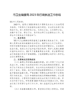 市卫生健康局2023年行政执法工作总结XX市人民政府:2023年,我局以XXX新时代中国特色社会主义法治思想为指导,不断强化卫生监督执法能力建设,依法打击各种卫生违法行为,深入推进学校卫生、饮用水卫生、公共场所卫生、消毒产品卫生、职业卫生、医疗执法等卫生监督执法工作。现将全年行政执法工作报告如下:一、基本情况XX市卫生健康局高度重视卫生健康行政执法工作,为保障人民群众的身体健康和生命安全,维护社会公共卫生职务,预防和控制传染病以及监督食品和药品的质量安全,全面推进依法行政,规范公共卫生和医疗服务秩序,维护人民群众健康权益和生命安全,XX市卫生健康局依法决策、依法管理和依法行政的能力和水平普遍增强,卫生健康事业逐步迈入科学化、法治化管理轨道。二、主要做法及取得成效(一)按照工作方案认真履行职责。深入开展了卫生行政执法工作。加强了与各级政府部门和卫生机构的沟通联系,推进卫生行政执法工作的落实。依法对违法违规的医疗卫生机构进行了查处。同时,我们协同市场监督管理局加大了对药品和医疗器械的监管力度,严格控制了频繁抗生素使用等不合理使用行为的发生。(二)加强依法行政工作的组织领导。以主要领导为组长、分管领导为副组长的依法行政工作领导小组,多次召开班子会议,研究部署2023年度依法行政重点工作,将依法行政工作贯穿于全年工作之中,纳入各医疗卫生单位年终考核。(三)加强普法教育工作。紧密结合系统工作特点,将普法教育工作作为一项重要工作任务,纳入年度工作计划。开展《中华人民共和国医师法》《基本医疗卫生与健康促进法》《中华人民共和国行政处罚法》等法律法规知识学习,落实领导干部带头学法用法制度,局机关领导班子成员集中学法2次以上,建立行政执法人员培训制度,积极参加省、市、县级的各类法律法规知识培训。 (四)积极组织开展法治宣传教育工作。利用职业病防治宣传周、医师节、12.4国家宪法日等重要节日,通过XX市卫生健康局在线微信公众号、业务培训等多种形式开展线上和线下宣传教育,扩大法治宣传覆盖面,有效提高群众法治意识和知晓率。三、存在问题(一)执法人员专业化不高。执法队伍缺乏临床医学、法学专业方面的人员,在执法过程中难以做到精细深入。并且基层卫生监督执法工作眉毛胡子一把抓,而查办医疗卫生违法案件要求办案人员要有较高的专业性和较强的业务能力,因此在办案过程中体现出了执法人员专业素质不强,水平不高,执法过程中对检查的内容、形式及存在的问题分析不够深入,案件质量和水平还有待进一步提升。(二)执法力度不够。今年的处罚案件虽然在数量上有所提高,但是简易程序的案件偏多,一般程序的案件偏少,对被监督对象的违法行为的打击和震慑力度不够。(三)基层综合执法队查处非法行医的创新方式方法不够在查处部分非法行医案件时,会遇到违法人员不配合,不开门、打电话不接、不前来处理的情况,基层综合执法人员没有强制权限,不能及时处理结案,导致极少部分非法行医人员重操旧业。四、下一步打算(一)继续加强队伍建设。深化党风廉政建设,规范执法行为,保障公正、公开、文明执法;加强人员培训,通过请进来、走出去的培训方式,提升监督人员依法行政能力和法律知识的运用水平。(二)加强信息化建设工作。完善全过程执法记录信息管理,争取财政资金进行硬件配置;提高信息宣传报道质量,深入挖掘执法工作中的亮点信息,及时与群众关注的焦点相结合,提升卫计监督机构的社会影响力,积极调动群众的参与度。(三)加强执法力度,积极探索互联网+监督新领域的工作融合。积极拓展案源,强化薄弱领域专项执法尤其要加强医疗卫生行业以及职业病危害领域的安全监管。探索互联网+公共场所卫生监督工作,促进消费者对企业的社会监督,引导企业实施自律来提高卫生执法监督工作的社会效果。(四)是进一步加强统筹协调,充分利用好综合监管的有效机制。进一步积极主动与相关配合单位对接协调,争取得到相关单位的配合和支持,及时解决行政执法过程中遇到的困难和问题。