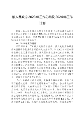 镇人民政府2023年工作总结及2024年工作计划根据《县人民政府办公室文件处理笺(大理白族自治州人民政府办公室关于认真做好2024年<政府工作报告>起草准备工作的通知)》要求,现将XX镇人民政府2023年工作总结及2024年工作计划报告如下。一、2023年工作总结2023年以来,XX镇人民政府在县委、县人民政府和镇党委的坚强领导及县级各部门的大力支持下,以XXX新时代中国特色社会主义思想为指导,深入贯彻落实党的XX大精神,聚焦镇党委第五届第三次代表大会、镇六届三次人代会和镇六届四次人代会确定的目标任务,坚持稳字当头、稳中求进工作总基调,团结带领镇村干部群众,真抓实干、勇于攻坚,扎实推进项目建设、产业发展、生态环保、民生保障、社会治理及自身建设等工作,全镇经济社会取得显著成效,全镇财政拨款预算收入XX万元、财政拨款支出XX万元,完成年初预算XX万元的67%;实现财税收入XX万元,完成固定资产投资XX万元,实现工业总产值XX亿元。(一)扎实推进项目建设,发展潜力不断增强。坚持抓项目就是抓发展,谋项目就是谋未来的理念,全力推进各项建设项目落地。大南高速公路(XX段)征地拆迁各项工作有力推进,截至目前共完成永久征地12.47亩、临时用地6.88亩,迁坟349冢,共完成兑款XX万余元,XX段连接线小围埂至小麦庄道路改移路段路面硬化工程顺利推进。XX镇30户以上自然村通硬化路建设项目,目前已完成蜂子箐岔线1.2公里、大井田岔线2.2公里。完成以工代赈蕨菜坪道路、老关巍公路口至小围埂鸡刺窝村道路、小围埂新农村至小围埂自来水水厂道路、小围埂村大东门至鸡刺窝村道路、晏旗厂村进村道路等路段水泥路项目建设,总里程约4公里。XX镇1号路提升改造项目,历时2年于2023年5月竣工并通过验收,拨付资金XX万元。2022年大理州民族团结进步百村(社区)示范创建行动XX县XX镇永乐村委会白沙村建设项目,于2023年4月通过县镇村组验收;2023年省级十县百乡千村万户示范引领XX县XX镇民族团结发展法治文化广场建设项目,目前已完成招标工作,项目建设资金XX万元;2023年大理州民族团结进步百村(社区)示范创建行动XX县XX镇小围埂村委会晏旗厂村建设项目、XX县XX镇永胜村委会回辉登村建设项目已进入摇号及招投标阶段。东莲花等5个传统村落集中连片保护与利用项目,已完成工程量的80%,已拨付项目资金XX万元。完成永安石灰窑人畜饮水提升改造、小(二)型水库维修养护等水利工程项目7个;滇中引水工程(XX段)完成永久征地5.05亩、临时用地129.4亩,涉及资金兑付140.8万元;锁水阁小流域治理项目已完成工程量的70%,项目投资XX万元;XX县中型灌区节水改造工程一期第一、二、三标段已全面建成,等待上级验收;永安村委会石灰窑、西山村委会鲁古村人畜饮水提升改造项目已竣工验收;XX县2023年农村饮水安全工程维修养护项目正进行招投标工作;积极推进永安村为民服务综合楼建设项目、XX县法治文化主题公园永济河道提升项目、XX镇西山村委会只家村乡村振兴示范村暨绿美乡村建设项目。抓好项目申报及招商引资工作,编报2024年度东西部协作项目7个,编报投资金额共计1586万元,做好2024年度乡村振兴财政衔接资金项目申报工作,召开项目审核会1场次,申报项目17个;永仓农业落户XX,大理时光牧场、永胜西山街各民族交往交流交融示范街集贸市场改造提升、XX县XX镇世纪文旅综合体建设项目等实现有效对接。(二)积极培植特色产业,发展基础不断夯实。积极抓好全镇农业农村各项工作,全面完成全镇粮食播种,2023年完成粮食播种49700亩,预计全年粮食产量达2060万公斤,抓好水稻、玉米、油菜等种植业保险政策落实,及时兑现2023年耕地地力保护补贴。大力推广科技增粮措施,创建水稻、玉米、马铃薯和杂粮等绿色高质高效创建样板10000亩,推广粮果、粮经、粮间套种 1200亩,扩种晚秋作物5000亩,实施大豆玉米带状复合种植示范80亩;抓实抓细夏粮秋粮防灾减灾措施,在永利、永乐和小围埂3个村委会实施玉米重大病虫害防控统防4476亩,补助10%苯醚甲环唑13400袋、12%甲维·虫螨腈13400瓶,发放2023年州级救灾备荒种子80公斤。扎实推进高标准农田建设,加快1.5万亩高标准农田建设进度,对项目区1.5万亩农田增施有机肥,加大农业基础设施投入和建设力度切实提升耕地质量。积极培育家庭农场,引导各类种养大户注册登记家庭农场,XX镇黄永柱家庭农场申报为州级示范农场。规范和提升有实质经营活动的农民专业合作社,积极引导州级示范社—XX县立辉植保农民专业合作社开展土地托管、代耕代种、联耕联种等专业化服务,引导州级示范社XX县红河源茶叶产销农民专业合作社开展农产品质量认证,加强品牌建设,扩大知名度和社会影响