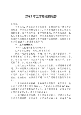 2023年工作总结的报告县委办:今年以来,两当县水务局在县委、县政府的统一领导和省水利厅、市水务局的精心指导下,认真贯彻落实县委工作总体安排部署,及早谋划布局、着力破解难题、加大推进力度,狠抓各项重点工作任务的落实,为全县水利的可持续发展和经济社会的快速稳定发展提供了有力支撑和坚强保障。现将两当县水务局2023年工作总结汇报如下:一、工作开展情况(一)认真贯彻落实河长制工作1.严格落实责任,构建工作推进体系按照建立管理机构、明确工作目标、落实管理责任、严格管理考核的要求,进一步完善了区域与流域相结合的以县、乡、村三级河长为主要内容的河长制组织体系,全面更新了县、乡、村三级河长名录。2.强化生态问题排查,规范全方位监管。按照属地管理原则,及时将问题反馈到当地乡(镇)人民政府,督促及时整改销号。定期不定点开展巡查与执法行动,加强对重点水域、重点河段、重点工程的监控力度,对河道四乱违法行为从严查出,依法打击,确保我县河湖四乱问题专项整治取得实效。3.多措并举夯实基础,强势推进问题整治。截至目前,县乡村三级河长累计巡河7808次,已完成全年巡河率143.3%。排摸整改完成河湖整治问题4个。多方筹措资金,在重点河道设置河道监控4处,语音提示设备4处。4.部门联动全面治理,提升河湖保护能力。河湖长制各成员单位各司其职、齐抓共管,立足生态战略大局,实施最严格水资源管理制度、加大节水管理力度,强化水污染治理、水生态修复等措施,积极推进河湖水系综合整治,开展联合执法。5.强化宣传教育,营造良好氛围。在第三十一届世界水日和第三十六届中国水周期间,开展了以强化依法治水携手共护母亲河为主题的节水、普法宣传活动。共开展普法宣传活动5次,发放各类节水、普法、河长制、清四乱宣传单1.5万余份。6.强化公众监督,更新监督信息。共更新县级河长制公示牌8个,乡级河长公示牌14个,村级河长公示牌83个,做到了河长公示牌更新全覆盖。全面更新了县、乡、村三级河湖名录,覆盖了全县所有的河流、洪水沟道、湖库等。对两当县辖区内的嘉陵江(两当段)、两当河、红崖河、三渡水、云屏河、张家河和汉江流域的广金河、冷裕河等 8条河段进行全面摸底,编制完成了《两当县一河一策实施方案编制项目》报告。7.常态执法检查,重点问题打击。两当县水务局执法人员持续采取白天常态化+晚上突击化方式,定期不定点开展巡查执法行动,加强对重点水域、重点河段的监控力度,对破坏河道采砂违法行为从严查处。(二)加快推进重点水利工程建设1.嘉陵江干流两当县西坡桥至中坝河口段防洪治理项目,工程批复投资XX万元。于2022年3月25日开工,2023年2月底完工。2.加快推进徐杨河引水二期工程建设,目前正在有序进行中。3.两当县两当河堤防维修治理工程,批复总投资XX万元,于2022年8月3日开工,2023年5月底完工。4.嘉陵江干流两当县边山村至棉花滩段河道治理工程,总投资XX万元,于2023年11月1日开工,目前完成投资XX万元,现在正抢抓非汛期,紧密安排工序施工,预计明年6月底前建成投入使用。5.争取实施政府专项债券两当县农村安全饮水巩固提升工程,总投资XX万元,已于2023年10月11日完成招投标工作。待政府专项债券资金到位后抓紧施工。(三)切实抓好水旱灾害监测预警工作1.及早谋划,加强汛前检查。根据省市汛前大检查工作通知的有关要求,2023年3月初我局邀请第三方专业维修人员对全县43套雨量站和106套广播站进行了巡检。全县12个乡镇、2个工作站共计落实山洪灾害防御四级包抓责任人165人,排摸山洪沟道灾害危害区161处,发现工程实体隐患0处,度汛管理隐患1处,重大安全隐患0处。2.加强领导,健全了防汛值班各项制度。自4月15日汛期以来,成立了以负责人为总指挥、相关负责人为副总指挥,各站队股室及干部职工为成员的两当县水务局防汛抢险救援队。建立完善了领导值班制度、水旱灾害预警内部响应制度等各项值班制度。从4月15日开始进入24小时由局长总负责,科级领导干部带班的24小时值班制度,及时、准确发布雨情、汛期、水情,认真做好防汛预警信息的上传下达,确保工作不断档,预警信息发布到位。3.加强防汛宣传,及时发布预警信息。自4月15日入汛以来,我局积极加强防汛工作宣传,通过微信等平台发布汛期避险知识、中小学生河道防溺水知识等,累计发放宣传手册2000余份。及时更新预警平台信息,短信信息接收相关责任人共计155人,确保预警信息第一时间通知到乡镇和村组。(四)水政水资源工作1.落实最严格水资源管理工作。对全县6家重点用水户以及1家公共供水管网用水大户下达了2023年用水计划。2.持续推行取水许可证电子证照办理。水务局窗口不断推进互联网+政务服务改革、实行一网通办的深入实践,提高营商环境