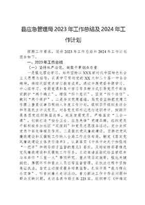 县应急管理局2023年工作总结及2024年工作计划按照工作要求,现将2023年工作总结和2024年工作计划报告如下。一、2023年工作总结(一)坚持从严治党,凝聚干事创业力量一是强化理论学习。始终坚持以XXX新时代中国特色社会主义思想为指导,认真学习贯彻党的XX大和二十届一中全会精神,持续巩固党史学习教育成果,通过开展党委专题学习、中心组学习、专题党课和集中学习等多种方式引导党员干部自觉拥护两个确立,增强四个意识,坚定四个自信,做到两个维护。二是夯实党建基础。局党委坚持把党建工作摆上重要议事日程纳入年度工作计划,组织召开组织生活会和开展民主评议党员,对各党支部书记进行述职考评,按期开展基层党组织换届选举,规范发展党员,严格落实三会一课,创新打造安全卫士、应急先锋党建品牌,组织党员干部积极参加社区双报到和党员志愿服务活动,充分发挥党员干部先锋模范作用。三是狠抓党风廉政建设。坚持把党风廉政建设和反腐败工作纳入全局工作总体布局,制定《落实党风廉政建设主体责任清单》,认真落实《中共中央关于加强对一把手和领导班子监督的意见》要求,及时安排部署推进党风廉政建设和反腐败工作任务。主动邀请派驻纪检监察组参与本单位三重一大事项研究、重点项目实施等,强化关键岗位、薄弱环节和重点人员日常监督管理。在执法过程中坚持亮证执法,自觉主动接受服务对象监督。扎实开展我为群众办实事、听音问廉大走访活动,着力解决工作中存在问题和群众反映问题,走访各类市场主体225家,组织学习《忏悔实录》等警示教育题材,做到谈心、提醒、教育、疏导并举。四是坚守意识形态阵地。局党委开展中心组(扩大)集中会议10次,专题研究部署意识形态工作4次,以防灾减灾宣传周、安全生产月等主题宣传活动为契机,广泛组织观看《生命重于泰山—学习XXXXXX关于安全生产重要论述》电视专题片4次,积极在网络专栏、广播、微信多种媒体平台宣传新《安全生产法》、群众自救互救知识和依法行政理念等,展示应急工作新成效和应急改革新进展,同时严格做好网络舆情导向,牢牢把握网络意识形态工作的主导权和话语权。(二)防范化解风险,守牢安全红线底线今年以来,全县共发生各类生产安全事故3起,死亡3人,事故起数和死亡人数分别同比下降62.5%、72.7%,安全生产形势总体稳定向好。一是强落实,监管体系逐步健全。认真落实全国、全省有关安全生产工作电视电话会议精神和安全生产十五条措施,完善县级领导干部安全生产包保责任清单和对口联系责任清单,召开县安委会全体(扩大)会议4次、安全生产形势会商研判会议4次,开展安全生产专项督查4次,累计发出《约谈通知书》《督促限期整改通知书》《提醒敦促函》130余份,约谈有关部门、单位和企业负责人8次,有力推动安全生产责任压紧压实。二是抓检查,问题隐患整治有力。扎实推进安全生产大检查,全县317家企业主动排查上报问题隐患606个,已整改问题594个,整改率达98%;组织各乡镇、有关部门综合检查企业487家,发现隐患和问题1023个,已整改972个,整改率达95%;成立督查组,邀请省级专家对48个乡镇和部门、146家重点企业安全生产大检查开展情况进行综合督查,发现隐患439个,已整改402个,整改率达92%。通过企业自查、综合检查和督查,切实消除了一大批安全隐患。三是盯重点,打非治违成效突出。扎实推进自建房、城镇燃气、道路交通、水电站、危险化学品、烟花爆竹、非煤矿山等重点领域专项整治,排查城镇房屋建筑2.46万栋,农村房屋29万余户,评估CD级农村危房853户,对存在问题隐患的房屋一房一策落实处置措施。完成全县24.8万户天然气用户排查工作,700余家重点单位安装可燃气体报警装置。排查道路安全交通隐患809处,投入整改资金248万元。对全县216家零售户、3家烟花爆竹批发公司进行全覆盖检查,发现问题470个,已整改完毕。紧盯汛期安全生产风险和隐患,对全县19家小水电企业、67家加油站、24家重点工贸行业企业、27家非煤矿山(页岩砖厂)、200处油气井矿开展全覆盖检查,对10家重点建设项目工地、18家游泳场(馆)和3家涉有限空间作业场所的企业进行专项督导,发现隐患和问题922个,已整改883个。四是严执法,监管水平不断提高。聚焦监管执法重点检查事项清单和重大事故隐患,运用专家+执法互联网+执法等新模式开展专业化、解剖式执法,出动执法人员540人次,聘用安全专家46人次,下达执法文书137份,处罚款47.3万元,责令停产整顿生产经营单位5家,缴纳行政处罚罚款128.88万元,上报2例行政处罚案例,被应急管理部评为行政执法典型案例。五是广宣传,安全氛围逐渐浓厚。深入开展安全生产月、安全生产五进等宣传教育活动,依托农村应急广播终端、车载广播、流动宣传车和直