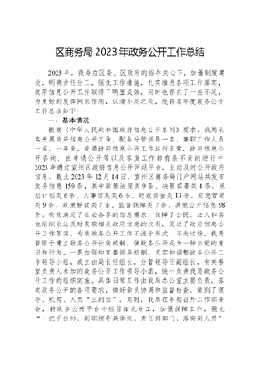 区商务局2023年政务公开工作总结2023年,我局在区委、区政府的指导关心下,加强制度建设,明确责任分工,强化工作措施,扎实推进各项工作落实,政府信息公开工作取得了明显成效,同时也存在了一些不足,为更好的发挥网站作用,认清不足之处,现将本年度政务公开工作总结如下:一、基本情况根据《中华人民共和国政府信息公开条例》要求,我局认真开展政府信息公开工作,配备分管领导一名,兼职工作人员一名。一年来,我局政府信息公开工作运行正常,政府信息公开咨询、依申请公开等以及答复工作都有条不紊的进行中2023年通过宣州区政府信息公开网站平台,主动及时公开政府信息。截止2023年12月14日,宣州区商务局门户网站共发布政务信息159条,其中政策法规类9条、决策部署类4条、规划计划类6条、人事信息类6条、财政资金类13条、应急管理类9条、政策解读类7条、监督保障类7条、其他公开信息98条。有效满足了社会各界的信息需求,保障了公民、法人和其他组织依法及时获取相关政府信息的权利,促进了政府信息公开工作落实。为使政务公开工作不流于形式,不走过场,我局着眼于建立政务公开长效机制,使政务公开成为一种自觉的意识和行为。一是加强和完善领导机制。充实和调整政务公开工作领导小组,成立由局长任组长,分管领导任副组长,有关科室负责人参加的政务公开工作领导小组,统一负责我局政务公开工作的组织实施。具体日常工作由我局办公室主要负责,落实政务公开的各项要求,做好牵头协调和监督检查。做到了领导、机构、人员三到位,同时,我局在年初召开工作部署会,将政务公开平台中栏目细化分工,加强保障工作,强化一把手挂帅、副职领导具体抓、责任到部门、落实到人员的工作机制。二是建立健全制度。我局通过建立健全政务公开审查制度,促进政务公开工作走上制度化、规范化的轨道。二、目前存在问题和不足虽然我局在政务公开上做了一些工作,政务公开执行情况有了较大改善,但我们认为仍然存在许多不足之处,主要表现在:一是因人员编制少,无专人专职负责政务公开工作,如遇中心工作,有的事项未能及时公开。二是有的公开内容不规范、不具体,重点不突出,许多应事前公开的内容变成了事后公开。三、下一步工作打算我处始终坚持把政府信息公开工作的时效性、准确性、连续性和透明化作为前提。在今后工作中,我们将始终如一不断改进和完善工作机制,努力提高政府信息公开的质量和水平。1、高度重视政府信息公开工作,将政府信息公开工作纳入年度工作重点,建立健全信息发布机制、畅通渠道,专人负责收集、整理、上报、回复、发布等一系列工作;2、规范公开信息内容,扩大政府信息公开范围,提高公开政府信息质量,保证信息公开的时效性、连续性,全面提高商务工作透明度,接受人民群众监督;3、继续完善制度、规范信息公开程序。认真学习和贯彻落实《中华人民共和国政府信息公开条例》,不断提高业务水平;坚持提高政府信息公开的时效性、连续性和信息质量;4、加强工作人员的业务知识培训,不断提高业务素质,把政府信息公开贯穿于我处工作的全过程。加强管理,落实责任制。进一步规范工作流程,认真梳理和细化信息公开类别,强化制度执行,组织开展定期检查和接受社会监督,充分发挥政府信息公开制度的社会效益。