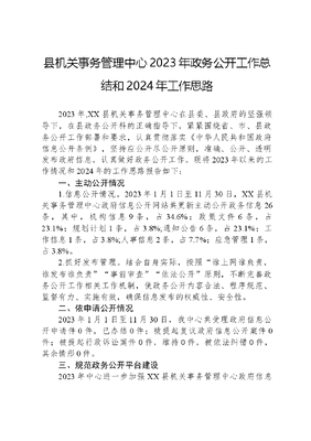 县机关事务管理中心2023年政务公开工作总结和2024年工作思路2023年,XX县机关事务管理中心在县委、县政府的坚强领导下,在县政务公开科的正确指导下,紧紧围绕省、市、县政务公开工作部署和要求,认真贯彻落实《中华人民共和国政府信息公开条例》,坚持应公开尽公开原则,准确、公开、透明发布政府信息,认真做好政务公开工作。现将2023年以来的工作情况和2024年的工作思路报告如下:一、主动公开情况1.信息公开情况。2023年1月1日至11月30日,XX县机关事务管理中心政府信息公开网站共更新主动公开政务信息26条,其中,机构信息9条,占34.6%;政策文件6条,占23.1%;规划计划1条,占3.8%;通知公告6条,占23.1%;工作信息1条,占3.8%;人事信息2条,占7.7%;应急管理1条,占3.8%。2.抓好发布管理。结合自身实际,按照谁上网谁负责,谁发布谁负责事前审查依法公开原则,不断完善政务公开工作相关工作机制,使政务公开内容合法、程序规范、监督有力、实施有效,确保信息发布的权威性、安全性。二、依申请公开情况2023年1月1日至11月30日,我中心共受理政府信息公开申请件0件,已办结0件;被提起复议政府信息公开案件0件;被提起行政诉讼案件0件,维持0件,被依法纠错0件,其余情形0件。三、规范政务公开平台建设2023年中心进一步加强XX县机关事务管理中心政府信息公开网站的建设管理,组织有关人员学习《中华人民共和国政府信息公开条例》等文件,及时做好信息发布更新等工作。四、监督保障中心严格按照政务公开有关要求,定期开展自查工作,发现问题,及时整改。五、工作中存在的困难和问题2023年我中心在政务公开工作中虽然取得了一定的成效,但也存在不足之处。主要表现在少数工作人员对政务公开工作的重要性认识不足,工作的积极性仍需进一步加强。六、2024年工作思路2024年我中心将从以下几方面继续深化政务公开工作:一是进一步做好培训工作,加强对《条例》等内容的学习培训,把《条例》学懂、吃透,以适应新形势下信息公开和依申请公开工作的要求,进一步强化中心人员对政务公开工作重要性的认识。二是继续做好日常管理,严格贯彻落实政务公开的各项要求,抓好日常检查,及时做好问题整改,持续提升政务公开工作水平。