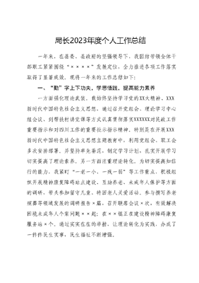 局长2023年度个人工作总结一年来,在县委、县政府的坚强领导下,我团结带领全体干部职工紧紧围绕××××发展定位,全力推进各项工作落实取得了显著成效。现将一年来的工作总结如下:一、勤字上下功夫,学思悟践,提高能力素养一方面强化理论武装。我始终坚持学习党的XX大精神、XXX新时代中国特色社会主义思想,通过召开党组会、理论学习中心组会议、到帮扶村讲党课等方式认真贯彻落实XXXXXX对民政工作重要指示和对四川工作的重要批示指示精神。特别是在开展XXX新时代中国特色社会主义思想主题教育中,利用党组会、职工会多次安排部署。并坚持率先垂范,制定学习计划,扎实开展学习切实提高了理论素养。另一方面注重理论转化。为切实提高知信行的能力,我紧盯一老一小、一残一弱等工作重点,积极组织开展精神康复障碍站点建设、互助养老、未成年人保护等方面的调研,带头参加留守儿童、特困老人关爱活动。参与撰写养老殡葬等领域发展的调研报告×篇,召开联席会议×次,有效解决困境未成年人个案问题××起;在××镇正在建设精神障碍康复服务站×个。通过实实在在的举措,让理论转化为实践,办成了一件件民生实事,民生福祉不断增强。二、干字上谋提升,脚踏实地,勤勉履职尽责一是基本民生保障精准精细。序时推进×件省定民生实事,发放残疾人两项补贴×××万人次××××万元;适度提高城乡低保、特困供养等救助保障标准低线,发放困难群众救助补助资金×亿元。常态化开展低收入家庭动态帮扶工作,及时为××××名低收入对象主动给予临时救助××××万元。二是基本社会服务普惠可及。成功召开全市养老服务工作现场会,农村互助养老、智慧养老、15分钟养老服务圈等方面的工作经验获得市县领导肯定。开展未成年人关爱活动××余场次、宣传教育×××余场次。落实困难重度残疾人集中托养照护服务××人,为××名残疾人实施康辅工程。办理婚姻登记×××对,开展婚姻辅导×××余人次,兑现惠民殡葬补助资金×××万元。三是基层社会治理出新出彩。全面完成全省第三批城乡社区治理示范县创建,我县被评为优秀等次。开展慈善社区和五社联动示范社区创建,接收捐赠物资约××××万元,惠及群众×万人次,链接东西部协作物资××万元。×个村(社区)入选全市十佳优秀村规民约(居民公约);××个村(社区)一次性高标准通过市级道德银行示范创建验收;我县被确认为全省婚俗改革实验优秀县,其经验做法被省厅专刊印发,获市县领导肯定性批示。三、严字上见真章,严于律己,锤炼工作作风一是坚持严于律己。作为局党组书记,我把权力当作责任,坚持依法用权,坚守廉洁底线,自觉用党纪、政纪、法纪严格约束自己。始终坚持以身作则、严以修身,带头遵守《中国共产党廉洁自律准则》《中国共产党纪律处分条例》和各级关于改进工作作风、密切联系群众的规定,时刻做到自重、自省、自警、自励,做到慎权、慎欲、慎微、慎独,科学谨慎地行使自己的职权。二是坚持集体决策。进一步完善了《党组会议事规则》,严格执行民主集中制和分工负责制,严格执行三重一大事项集体决策制度,对重要人事任免、重大项目安排和大额资金使用,按规定程序运行,坚持集体研究决定。切实以制度管权、管人、管事,绝不搞一言堂。三是坚持廉洁从政。严格按照《中国共产党廉洁自律准则》要求自己。从未出现过瞒案不报、私自处理案件、举报材料;从未接受管理对象的宴请、礼金礼品以及安排娱乐、旅游等情况。遵守组织人事纪律,严格按照干部选拔任用条例办事,时刻严格规范自己的行为。多年来,我严格按照要求如实填报个人有关事项报告表,不存在隐瞒不报、少报或弄虚作假、欺瞒组织的情况。一年来,虽然在工作上取得了一定成绩,但还存在许多不足主要是学习的广度深度有待加强、工作的创新力度有待加强。今后我将在以下几个方面继续努力。一是坚持不懈抓学习。把开展XXX新时代中国特色社会主义思想主题教育同贯彻落实党的XX大精神和党中央决策部署结合起来,同民政工作结合起来,推动主题教育走深走实。通过向书本学习和参加培训等多种方式,不断强化理论学习教育。二是坚定不移抓发展。紧紧围绕县委×××目标,扑下身子抓落实。在完善一老一小、一残一弱救助帮扶和关爱服务体系、大力发展慈善事业、提高婚姻殡葬服务质效、深化基层治理等方面实现创新突破。三是筑牢屏障守底线开展好经常性的廉政教育和廉政谈话,落实好重要节点和关键岗位的警示教育。坚持和完善重大事项决策报告制度,把全面从严治党贯穿于民政工作的全过程。以开展××××作风建设为抓手,加强对党员干部的日常监督管理,全面整治行业风气,以干部的辛苦指数换取群众的幸福指数。