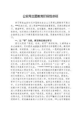 公安局主题教育阶段性总结学习贯彻A新时代中国特色社会主义思想主题教育开展以来,迅速行动,深入贯彻**党委的部署要求,坚持把理论学习、调查研究、推动发展、检视整改、建章立制贯通始终、一体推进,切实推动主题教育各项工作在全局走深走实走细,为全面推进公安工作高质量发展贡献力量。现将有关情况汇报如下:一、以学为基,抓深做实理论学习深化运用好党组、支部、党员联学机制,认真研读4本必读教材,及时跟进AXXX的重要讲话和重要文章,做到学懂并通、学深悟透、入脑入心,见行见效。一是局党组带头做好领学。局党组采取党组扩大会、理论学可中心组扩大学习、举办读书班等形式,组织全局处级以上领导干部开展集中学习和专题研讨。党组书记、局长带头为全局党员讲党课,以普通党员身份参加所在支部专题学习交流,为全局领导干部做好示范引领。二是认真开展集中学。各支部依托三会一课、主题党日开展集中学习交流,**等专案组充分发挥战时党支部战斗堡垒作用,利用办案间隙组织民警开展学习交流、开展青年学习月活动,组织青年民警开读书会和座谈会,进行专题培训,引导青年下部民警坚定不移听党话,跟党走。三是丰富形式和内容推动全员深入学。利用好学习强国、钉钉等学习平台以及微信学习群等载体,组织全体民警深入开展自学。在自学的同时邀请专家授课,充分统筹公安专家资源,切实提升学习质量。四是按照主题教育中干部队伍教育整顿要求,深入开展党性教育和警示教育。通过观看主旋律影片、到红色教育基地实地研学,组织感党恩、听党话、跟党走系列活动等方式,引导民警筑牢忠诚信念;通过**廉政文化教育基地现场学习、观看廉政教育片以及学习公安部、**公安厅通报的违规违纪案例等,引导民警以案为鉴,知戒惧,守规矩。二、以真开路,聚焦短板调查研究一是问题导向选题。坚持问题出现在哪里,调查研究跟进到哪里。针对队伍建设中存在的短板弱项开展党的建设调研、干部队伍状况调研,围绕新型诈骗等新形势新任务开展调研,共开展座谈调研**次,发放调查问卷*份,收集问题线索和意见建议**条,努力做到把矛盾聚焦找准、把问题研究透彻,把措施提准提实、把难堵点厘清化解。二是一体部署推进。将调研选题纳入主题教育任务清单,一体谋划、整体推进。做好调研人员、时间、地点协调工作,避免扎堆调研、多头调研,重复调研。同时,各调研组通过对需要解决的问题进行调研梳理,抓住关键,精准发力。三是抓好成果转化。对调研过程中发现的问题与问题整改、建章立制相结合,将比较成熟的对策举措及时研究部署,及时转化为改进工作的具体措施,推动矛盾和问题解决。比如针对*中心的数据壁垒问题,与*等多家单位签订数据共享联合研判机制等。三、以勇破局,全面检视整改问题充分发扬刀刃向内、刀刃向已的勇于自我革命精神,围绕主题教育6个方面、干部队伍教育整顿9个方面,真刀真枪地把自己摆进去,把职责摆进去、把工作摆进去,结合调研中发现的问题,全面检视思想队伍建设、公安业务中存在的突出问题,坚持从小切口入手,保证问题与工作实际的咬合紧密,共整合确定问题6项,制定整改措施38个,确保整改整治的措施具有可操作性,整改的时限和效果切合实际。同时按照将问题整改贯穿主题教育始终的原则,建立动态调整机制,坚持在全面查摆问题、制定整改措施,督促整改落实上精准发力,形成《问题整改推进表》,进行挂图销账,全力破解工作中的堵点难点痛点。四、以实谋新,推动各项工作发展坚持边学边干,切实把主题教育成果转化为推动发展实效一是维护稳定树形象。坚持落实AXXX指示批示精神,始终将人民的期待作为打击违法犯罪的出发点和落脚点,积极打击盗抢骗、黄赌毒、食药环等突出违法犯罪,集群打击电信网络诈骗等多发性侵财犯罪,强力整治黑车黑摩的、医托号贩等治安顽疾,持续净化社会治安环境。二是为民担当办实事。坚持人民至上,真心诚意为民办实事解难事。**交警支队累计更换各类交通标志**套,调整道路交通信号灯**处,排查整治道路交通隐患点**处,进一步提升城市道路交通通行效率,有效缓解市区交通压力。电信诈骗犯罪侦查大队积极向群众宣传诈骗犯罪危害、传播反诈知识技巧,切实提升群众防骗意识。累计接待群众咨询1000余人次,发放宣传单4种2000余份。三是强化党建筑警魂。深入推进基层党建年工作,以成立机关党委为契机,形成局党组、机关党委、党支部职能联动,推动一级抓一级,环环抓落实工作责任制,对机关党委工作者进行集中培调,提升履职能力开展强化支部建设,擦亮党建品牌活动,进一步夯实基层党建基础工作,持续深挖基层党建热源,推动机关党建工作水平整体提升。五、以立筑效,建章立制稳固成果坚持把建章立制作为治本之策,着力在常抓长治上下足功夫,切实推动主题教育见行见效、走深走实。主题教育开展以来,围绕进一