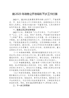 镇2023年政务公开总结和下步工作打算2023年,XX镇在县数据资源局的精心指导下,严格按照省、市、县关于政务公开工作相关规定,坚持把政务公开作为服务人民群众、推进乡村振兴的一项重要内容,认真对照考评细则开展自查、整改,现将工作总结汇报如下:一、政务公开工作总体情况2023年以来,我镇坚持以公开为常态、不公开为例外和公正、公平、合法、便民的原则,严格遵守保密审查和三审制要求,全面提高政务公开质量。进一步完善政务公开制度,深入推进重点领域信息公开,及时准确地公开政府信息,不断提高我镇各项工作透明度,切实保障群众知情权、参与权和监督权。截至目前,主动公开信息发布总数量为1050条无依申请公开办理事项。政策文件3件,政策解读3件,重大决策预公开3件,回应关切12件。(一)加强组织领导。XX镇高度重视政府信息公开工作,把此项工作纳入到年度工作计划,摆上重要议事日程,切实加强组织领导。成立了由镇党委书记、镇长任组长、分管领导任副组长的工作领导小组,明确了一名信息公开工作责任人。(二)加强制度规范。XX镇进一步健全完善了相关配套制度。进-步明确信息公开的内容、形式、时限、范围、程序及责任部门和责任人,细化各项工作措施,保障人民群众的知情权和监督权,形成良好的舆论监督氛围。(三)加强专区建设。我镇选择政务服务大厅一楼,打造XX镇政务公开专区,利用政务服务办理事项契机,为全镇居民做好政策咨询、电脑查询、事项代办等服务,推进政务公开平台的规范化。专区内展示包括政策宣传单、办事指南等在内的宣传材料。同时,新的XX镇便民服务中心即将投入使用。二、下一步工作思路2024年我镇将加大力度推进政务公开各项工作,始终秉持以人民为中心的理念,采用更加优化的公开形式,拓展更多的公开渠道,把握正确的公开方向,确保多举措提升政务公开质量与效果,推动政府信息公开工作规范化、秩序化、健康发展。突出做好重点领域公开。按照重点领域,按时公开;群众关心,及时公开的原则,对涉及广大群众切身利益的食品安全、养老社保、生活救助等重要领域信息进行全方位的公开,实现基层政务公开为民服务的实际效果。