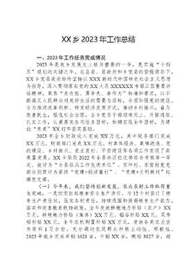XX乡2023年工作总结一、2023年工作任务完成情况2023年是我乡发展史上极为重要的一年,是实施十四五规划的关键之年。在县委、县政府和乡党委的坚强领导下,XX乡党委政府始终坚持以XXX新时代中国特色社会主义思想为指导,深入贯彻落实党的XX大及XXXXXX考察江西重要讲话精神,聚焦走在前、勇争先、善作为标准和要求,以不断满足人民群众对美好生活的需要为目标,全面加强党的建设、全力推进改革创新、转变经济发展方式,推动乡村振兴,着力改善民生,强化社会治理,全乡党员干部迎难而上、开拓进取、扎实工作,认真落实各项任务目标,如期实现全年目标,为建设秀美XX打牢坚实基础。2023年全乡财政收入完成XX万元,其中税务部门完成XX万元,财政部门完成XX万元。村集体经济、集镇改造、党的建设、乡村振兴、农业农村、平安建设等各项工作实现了高质量发展。XX乡荣获2022年全县非区位优势综合考核第一等次、被评为全县征兵工作先进单位。东坪村、东营村党支部分别获评为县级党建+经济富村、党建+文明新村红旗党支部。(一)今年来,我们坚持创新发展,农业农村工作取得重大突破。一是切实扛起粮食安全生产责任。与12个村签订了粮食生产责任状,压实各村责任,持续巩固和提高粮食生产能力,落实和完善粮食扶持政策。全年发放耕地地力补贴(农户)XX万元,耕地地力补贴(集体)XX万元。稻谷补贴XX元,双季稻补贴XX元,全年农机购置补贴XX万元,发放各类农业宣传资料1万余份,充分调动农民群众种粮主动性、积极性。2023年我乡完成早稻1621亩,中稻XX亩,晚稻3027亩,超额完成县政府下达的粮食生产任务。二是切实做好耕地非粮化非农化。严守耕地红线,与12个村签订了耕地保护责任状,乡纪检联合国土、派出所等部门加强巡逻,常态化执法,进一步压实XX乡水投公司维养中心五位一体管护责任,持续做好XX乡高标准农田建设建后管护工作,切实做好耕地非粮化非农化整改工作,耕地保护深入农民群众心中。三是加强农业种植指导督导。邀请县农业农村局农业技术推广专家来我乡指导水稻种植10余次,召开农业技术培训会20余次,组织种粮大户学习现代农业知识10余次,乡农技组每天奔波于田间地头,及时解决了种植过程中的技术问题。针对源头村和东山村早稻种植问题,由挂点班子提前介入,帮助村两委谋划好明年水稻种植计划,县农业农村局和乡农技站提供技术指导等一系列扶持,保证种植粮食面积只增不减。(二)今年来,我们坚持齐抓共管,乡村振兴交出完美答卷。一是紧绷预警监测工作之弦。全乡集中开展防止返贫动态监测工作1次,对脱贫户及监测户进行入户实地走访摸排,重点监测收入支出状况、两不愁三保障一安全。二是凝聚精气神实现开门红。争取上级危改资金10余万元,危房改造新建3户,维修4户,16人住房安全得到保障。饮水管护移交润田公司实行更专业化运营,全乡49个统筹整合财政涉农资金项目均高标准实施、验收,52户农村户厕整改完成。乡村基础设施更加完善,村民天天看的到变化,12个村和集镇人居环境在改善基础上进一步提升,全乡居民的幸福感和安全感进一步增强,乡村振兴工作成绩斐然,多次获得县领导及上级部门的高度认可。(三)今年来,我们兜牢民生底线,人民福祉显著提升。一是高位部署推进常态化扫黑除恶斗争。多次召开党政班子会研究部署推进常态化扫黑除恶斗争工作,强化宣传、线索摸排,扎实推进中央扫黑除恶回头看反馈问题的整改落实。二是民生保障的幸福底色更加鲜亮。抓好养老保险、医疗保险两大保障,完善社会救助体系,做到低保评定公平、公正、公开、应保尽保。全年共新增低保户63户,117人,9户15人因经济状况改善自愿取消低保,特困供养对象15人集中在乡敬老院安享晚年。三是安全生产工作警钟长鸣。持续扎实推进安全生产专项整治行动,建立完善的风险防控体系和隐患排查治理体系。积极开展安全宣传月和安全宣传周活动,全力做好防火防汛工作。四是党建引领乡村治理显成效。乡党委政府始终坚持党建引领,通过三长联动工作举措,着力筑牢我乡基层治理根基,提升基层治理能力,不断强化基层治理成效,群众小事不出村,大事不出乡,矛盾不上交,乡村治理显成效。(四)今年来,我们增强自我革新本领,政治建设走深走实。一是五型政府建设为抓手,助推政府形象大提升。全乡范围内设立了13个举报箱,充分发挥基层小微权力监督一点通平台作用,全年共受理纪检信访20件。强化案件审查,全年共办理党员违纪案件3件,其中自办案件1件。坚持把纪律和规矩挺在前面,突出抓早抓小,上半年运用第一种形态处理6人。二是政务服务提质增效,营商环境不断优化。持续深化放管服改革,着力优化我乡营商环境,码上办让数据多跑腿,群众少跑路,走好服务群众最后一公里,助推经济高质量跨越式发展。三是