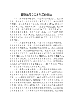 县财政局2023年工作总结(一)财政运行平稳有序。一是千方百计抓收入。截止10月底,全县地方一般公共预算收入完成XX万元,占年初预算的XX%,超时序进度8个百分点,同比增长XX%,预计全年可完成XX万元,增幅为XX%。二是厉行节约优支出。截止10月底,全县一般公共预算支出完成XX万元,同比下降XX%。三是统筹兼顾保重点。守牢三保底线,全年三保预算执行进度平稳,截止10月底,民生支出完成XX万元,占一般预算支出XX%;中央直达资金指标XX万元,支出XX万元,完成XX%。(二)助力经济稳进提质。一是不折不扣落实减税降费。跟进落实今年新增、延续、优化的减税降费政策,减轻市场主体税费负担XX亿元,有力提振市场主体信心。二是全力以赴优化营商环境。加大金融助企纾困力度,截至10月底,新增发放担保贷款XX万元,税融通在保余额XX万元,续贷过桥周转金额XX万元,各项贷款余额达XX亿元,新增贷款XX亿元,较年初增长18.12%。三是精准高效推进惠企助企。及时兑现招商引资政策资金XX万元,拨付首位产业、工业、商贸流通和现代服务业等政策奖补资金XX万元。1-10月共通过皖企通平台兑现57家企业奖补资金XX万元。(三)改革创新深入推进。一是财政改革发展蹄疾步稳。出台《宿松县零基预算改革方案》,聚焦全县中心工作及社会关注度高的民生项目,提前启动对9个县直单位2022年度部门预算、4个乡镇财政运行情况、13类专项资金进行重点绩效评价,为推进零基预算改革、编制2024年部门预算打下基础。二是财政管理水平稳步提升。稳步推进2023年财政重点绩效评价涉及26个项目、评价金额XX亿元,乡镇财政运行综合绩效评价试点工作成功入选全省预算绩效管理典型案例。三是国资国企改革落地见效。扎实推进国企改革深化提升行动,成立财政国资机关党委,推动国有企业将党的领导融入公司治理各环节;促进各县属国有企业突出主业、错位发展,积极推进国有资产资本化证券化;探索推进政府公物仓共享共用,将闲置资产缴入公物仓相互调剂使用,提高国有资产使用效益。(四)风险防范有力有效。一是加强和规范政府债务管理。严格政府债务限额管理,加强日常监测和风险评估,编制防范化解地方债务风险具体方案;建立三保事项优先支出的库款保障秩序,全面做好三保资金拨付工作,坚决防范支付风险。二是金融风险化解有力。常态化开展防范和打击非法金融活动,牵头组织县防范处置非法集资领导小组成员单位,深入推进扫黑除恶专项斗争,强化金融知识宣传普及,不断增强群众防范和打击非法集资、养老诈骗等违法犯罪活动意识。