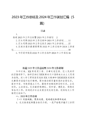 2023年工作总结及2024年工作谋划汇编(5篇)目录1.街道2023年工作总结暨2024年工作谋划22.区水利局2023年工作总结和2024年工作谋划.113.区水利局2023年工作总结及2024年工作谋划.274.区政务服务数据管理局2023年工作总结和2024工作谋划..385.市行政审批局2023年工作总结和2024年工作谋划46街道2023年工作总结暨2024年工作谋划今年以来,XX街道党工委、办事处在区委、区人民政府的坚强领导下,始终坚持以XXX新时代中国特色社会主义思想为指导,深入学习贯彻落实党的XX大精神和XXXXXX视察河北重要讲话指示批示精神,紧扣推动高质量发展的首要任务,紧扣市委、市政府重点工作,围绕年初制定的目标任务,立足实际,主动谋划,扎实做好稳增长、促和谐、惠民生、保稳定等各项工作,街道经济社会发展呈现良好态势。现将有关工作情况总结如下:一、2023年工作总结(一)筑基赋能,聚焦发展,党的建设取得新成就1.扎实推进党群服务体系升级。一是严格程序履行工作职责。街道党工委召开专题会议研究基层党建工作12次,党支部开展主题党日活动107次。严格发展党员程序,增设人选推荐环节,2023年共发展党员5名,新增入党积极分子9名,确保党组织新鲜血液的高质量。二是聚焦日常筑牢党建基础。切实抓好三会一课、组织生活会等党内制度落实。组织机关全体及各社区书记参观涉县八路军一二九师司令部旧址的所在地,开展重温光辉历程,赓续红色基因迎七一爱国主义红色教育主题活动,深刻感受爱国主义情怀,缅怀先革命先烈们的丰功伟绩。举办党建引领聚合力,团结奋进开新局重点工作擂台赛,展示基层党组织风采,提升社区两委班子政治素质、业务能力和履职水平,积极营造比学赶超、争先创优的浓厚氛围。三是强化两新组织党建向心力。今年两新组织单独组建10家,率先完成工作任务。四是扎实推进主题教育工作开展。深入贯彻落实XXX新时代中国特色社会主义思想主题教育,全力做好动员部署、理论学习、调查研究、检视整改等工作,着力解决群众急难愁盼问题,确保主题教育各项任务落实落地。2.扎实做好新时代意识形态工作。今年共开展理论中心组学习12次,意识形态专题研讨4次、分析研判2次。举办惠民实践团理论宣讲70余次、欢乐城乡群众文化大舞台活动60余次、强国复兴有我百姓故事汇活动20余次。大力推广《学习强国》APP,下载注册12755人,达到辖区常住人口33%。街道今年共刊发新闻96篇,中央级媒体6篇,其中人民日报2篇,新华网1篇,中国新闻网3篇;省级媒体河北新闻网1篇;市级媒体74篇。永华新城、常兴里社区被评为省级文明社区优秀志愿服务社区,飞燕高翔和红帽一刻钟志愿服务队被评为优秀志愿组织,31人和被评为丛台区道德模范、优秀志愿者、丛台区文明市民。3.坚持党建带群建,提升各项工作水平。一是党管武装责任落实有力。今年兵役登记适龄青年167人,100%完成任务数,应征报名30人全部参加体检,入伍新兵5人,全部为大学毕业生,抓好人员编组、训练管理、检查考评,有效提高民兵应急处突的能力。二是共青团工作全面活跃。积极开展五四入团宣誓仪式、寸草心志愿服务、防溺水知识宣讲等活动,2023年五月被评为邯郸市五四红旗团委。三是进一步做好民族宗教领域工作,全年排查整改阿文标识2处,纠正广场舞宗教音乐2次深入排查沙化阿化清真泛化、非法聚会点、外部宗教渗透情况,民族领域矛盾纠纷、非法宗教活动各11次,切实防范化解宗教领域各种风险隐患。(二)抢抓机遇,精准发力,经济工作实现新提升今年,街道保持项目建设强劲态势,为经济高质量发展持续注入新动能。一是稳步推进固定资产投资。截至11月五下项目1个,五上项目7个,亿元以上项目5个,投资额共计XX万元,上报平台数据共计XX万元,筹划房地产万浩天福苑项目;二是扎实开展全国第五次经济普查工作。通过前期摸排,划分普查区和普查小区,现阶段完成清查法人单位1230家,个体经营户1421家,出色的完成了清查工作,为下阶段经济普查打下夯实的基础。三是全力做好招商引资工作。今年上报落地项目8个,共完成招商引资XX亿元,共办理个体工商营业执照438个。在街道的大力支持与协助下,卓邦公司立足于棉三工业遗址与河北卓尔公司合作开发的文创商业项目时光公园,计划投资5000万元,打造成集餐饮、娱乐、休闲、购物、书画、健身夜市于一体,新旧印象融合的文化生活圈,迅速成为青年人新的休闲打卡热地,凝聚起了时光公园浓郁的烟火气,时光公园文创商圈氛围初步显现,商业街区夜经济引领城市新活力。该项目已顺利获评第二批省级夜间文化和旅游消费集聚区、邯郸市