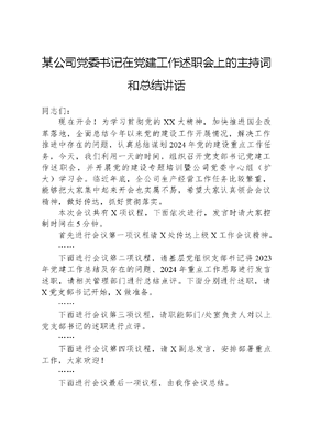 某公司党委书记在党建工作述职会上的主持词和总结讲话同志们:现在开会!为学习贯彻党的XX大精神,加快推进国企改革落地,全面总结今年以来党的建设工作开展情况,解决工作推进中存在的问题,认真总结谋划2024年党的建设重点工作任务,今天,我们利用一天的时间,组织召开党支部书记党建工作述职会,并开展党的建设专题培训暨公司党委中心组(扩大)学习会。临近年底,全公司生产经营工作任务比较繁重,能够把大家集中起来开会也实属不易,希望大家认真领会会议精神,做好传达,抓好贯彻落实。本次会议共有X项议程,下面依次进行,发言时请大家控制时间在5分钟。首先进行会议第一项议程请X处传达上级X工作会议精神。……下面进行会议第二项议程,请基层党组织支部书记将2023年党建工作总结及存在的问题、2024年重点工作思路进行发言述职,请相关管理部门进行总结点评。下面分别进行述职,请X党支部书记开始,X做准备。……下面进行会议第三项议程,请职能部门/处室负责人对以上党支部书记的述职进行点评。……下面进行会议第四项议程,请X副总发言,安排部署重点工作,大家欢迎!……下面进行会议最后一项议程,由我作会议总结。同志们!我们召开党建工作述职会,目的是及时总结今年党建工作中存在的问题,以起步即决赛的状态尽早谋划开展2024年工作。刚才,围绕会议主题,X副总、各职能部门负责人进行了工作部署,分管领导都讲了很好的意见,我完全同意,会后请大家认真抓好贯彻落实。2023年是一个非常特别和具有重要战略意义的年份,今年以来,公司所属各级党组织自觉扛起政治责任,坚持和加强党的全面领导,扎实开展主题教育,精心组织开展了X等系列活动,意识形态工作责任制有效落实,基层党组织和党员干部队伍建设水平有效提升,群团工作继续保持集团公司系统前列,进一步凝聚起全公司上下爱党爱国爱企热情和推进企业改革发展的奋进力量。一体推进不敢腐不能腐不想腐机制,进一步健全党委巡察、纪检监督等党内监督体系,以开展以案促改为契机,动真碰硬解决整治整改整顿问题、查处违纪违法案件,企业政治生态持续好转。成绩的取得离不开大家的辛勤付出,在此,我代表公司党委,向大家表示衷心的感谢。下面,围绕会议主题,结合工作实际,我讲四个方面意见:一、旗帜鲜明讲政治,认真落实党中央决策部署讲政治这三个字,我逢会必讲。我们所在的单位是党领导下的国有企业,所以讲政治绝不能是一句空话,特别是我们的党群干部和党群工作者,讲政治一定是摆在第一位的,要时时刻刻做到在党言党。要持续抓好政治理论学习,始终将学习贯彻XXX新时代中国特色社会主义思想摆在重要位置,要以开展主题教育为契机,通过第一议题、中心组学习、三会一课、主题党日活动、学习讲堂等多种形式,围绕受众群体,紧密结合工作实际,分层分类开展学习研讨,更加注重成果转化,确保准确把握党中央的精神和大政方针政策在我们基层一线执行的不偏离,确保政治理论学习听得懂、学得进、用得上、落得实。公司所属各级党组织特别是各相关牵头部门要进一步统一思想步调、提高政治站位、加强组织领导、压紧压实责任,把党的领导融入企业治理各个环节,促推改革工作制度化、规范化、程序化,确保改革方向正确、落实有力,改革任务按期完成、取得实效。各级党组织要认真对照坚持党对国有企业的全面领导情况、做强做优做大国有企业的工作成效、是否落实破解难题补齐短板的要求等方面,深入细致开展自查检视,认真总结贯彻落实形成的典型经验和做法,全面查摆贯彻落实存在的差距和不足,深刻反思基层党组织作用是否发挥到位,以开展四强四优和星级党支部、最强党支部创建为契机,进一步统一思想认识、提高政治站位、切实履行主体责任,动真碰硬抓不足,有的放矢抓整改,做到始终坚持党的全面领导,加强党的建设,以高质量党建引领企业实现高质量发展。二、守正创新抓宣传,营造浓厚稳定的舆论氛围宣传思想工作做的是人的工作,而人的工作是最难做的工作。今年下半年,集团公司宣传工作导向转为了全面提升对外宣传工作水平,对宣传质量和刊稿平台都提出了更高要求,相应的业绩考核标准也作了新的调整,宣传工作的任务也随之加大。我也和宣传部的同志们做了交流,要创新宣传工作方式方法,建立完善新的新闻宣传工作机制,出台鼓励政策,站在基层角度进一步强化宣传工作。宣传工作是粮草,是喉舌,是利剑,是我们党的优良传统和政治优势。通过宣传工作,可以及时实现上传下达和下情上达,将一个单位所做的实事告知于广大客户和干部职工,使员工能够最大程度地参与到企业改革发展中来。而且越是面临重大挑战,越需要强有力的思想保证、舆论支持和精神动力。各部门、各基层党组织要走出宣传工作是负担的认识误区,多鼓励本单位、本部门员工参与到宣传工作中来,营造人人都是宣传工作者的氛围,既要把宣传工作作为总结工作成效、展示本单位本部门业绩的舞台,又要把宣传工