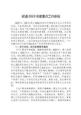 街道2023年度重点工作总结2023年,XX街道以XXX新时代中国特色社会主义思想为引领,认真贯彻区委、区政府决策部署,紧扣现代化新普陀建设主线,锚定现代海洋城市后花园发展定位,大力推进全市农业发展看XX、农村游学逛XX、农民创客聚XX,先后获评全国乡村特色产业超十亿元镇、省级和美乡村示范乡镇、全省推动农民农村共同富裕成绩突出集体和省农村工作指导员先进单位等荣誉,入选全省首批乡村振兴示范镇创建单位,产村融合的乡村振兴XX模式获省部级领导批示肯定。一、实干攻坚,经济发展提质增效(一)聚力产业赋能,提振综合经济。2023年,累计实现财政收入XX0万元,同比增长54.7%;完成固定资产投资XX亿元,同比增长21.4%;实现规上工业产值XX亿元,同比增长16.9%;实际利用市外资金XX万元,同比增长15.8%;实际利用外资XX万美元,同比增长72.45%。加快渔业转型升级,新成立XX海辰渔业公司,压实企业安全责任主体,打造全市首个产供销一体化的国内捕捞现代渔业企业,目前渔船规模50艘。全年实现渔业产量2.3万吨,同比增长43.8%。大力推进农田集中整治和流转,整治非粮化非农化1100亩,改造提升粮食功能区1200亩,实现4000亩良田连片经营。实施农业双强行动,打造现代农业科创园、蘑菇方舱、农灿都市农业、梯田鱼稻共生效益农场和游戏交互智享农场等五大未来农场。(二)聚力品质提升,深化产村融合。建立专人统筹、班子包村、干部联村工作机制,专班化推进环境综合整治,顺利举办市、区两级环境整治现场会。坚持微改造、精提升,完成螺门片区风貌提升工程,创成晓辉省级美丽宜居示范村、黄杨尖省级卫生样板村、茅洋市级花园村庄和螺门、梁横市级精品村。深化没有围墙的海岛创业园,获评全市唯一乡村类市级创业孵化基地,聚集乡创客200名,带动老兵客栈等10余家本土创业典范,《匠心筑梦 乡创XX》短视频入选全国乡村振兴你我同行典型案例。创新村集体+公司+业态的利益共享机制,新盘活农房30余套,招引乡井食府、禾屋咖啡等特色业态20多家,业态年总收入超XX0万元。常态化打造路下市集,先后举办全市首届乡村智享生活节、全市党建引领共富工坊大市集等主题活动,荣获首批省级重点培育文旅市集和省级精品乡村市集。构建村播达人+农产品+流量带货的村播营销体系,直播带货年销售额约2000万元,获省商务厅电商直播式共富工坊专项激励项目。打响海稻音乐节、乡村咖啡生活节等IP品牌,带动旅游年收入超1亿元。建成省级研学实践教育基地和省级生态文明教育基地,打造农事体验、非遗制作等研学特色品牌,年接待学生超3万人,乡村儿童研学乐园XX案例获全市一等奖。深化村集体经济113工程,实施强村公司飞地抱团项目,招引落地元棋体育综合体、乡村808Bass、月亮湾生态采摘园等一批共富项目,带动村集体经济年总收入和经营性收入同比分别增长23%和18.2%。(三)聚力民生保障,增进群众福祉。坚持教育优先,启动XX中心学校拆扩建工程,XX中心幼儿园获省一级幼儿园。实施一老一小一病帮扶行动,改造提升敬老院,开展养老送餐服务,救助各类困难群众529人,对29名困境儿童进行动态管理,定期开展圆梦微心愿等活动。完成螺门36户D级危房解危工作,保障群众生命财产安全。晓辉村开通微公交,解决群众出行最后一公里难题,XX实现村村通公交。实施全域生活污水改造提升工程,受益居民2600户。完成翁家岙美丽山塘等一批水利工程,有效提升蓄水、防汛能力。举办农民丰收节、520邻里文化节、回乡过大年、舟山乡贤周、展BA、乡村好声音等特色活动,建成13个15分钟品质文化生活圈,浓厚乡村文化氛围。坚持移风易俗,实施茅洋小坑公墓建设,举办全国婚俗改革现场会。创新滴滴用工模式,促进低收入农户灵活就业100余人,带动农民年均增收2万元。(四)聚力除险保安,强化社会治理。严格落实逢一进格制度,常态化开展领导接访和干部夜访民情活动,全年共化解矛盾纠纷113起,调解成功率100%,涉及金额260余万元。接待反映问题群众300余人次,书面答复率为100%。紧盯渔业船舶、安全生产等重点领域,开展风险隐患大排查大整治工作,全年共出动检查人员745人次,检查单位、场所353家,排查整改一般问题隐患188条,责令停止作业60条,立案查处30次,行政拘留4人,确保社会安全生产形势稳定。发挥乡贤、渔嫂力量开展理论宣讲、平安巡防等活动,提高基层自治能力。组织开展邻里之星、孝敬媳妇、妈妈的味道、美丽庭院评比,选树一批先进典型,营造向好向善浓厚氛围。二、党建统领,战斗堡垒坚强有力(一)坚持大抓基层,夯实组织基础。建立村书记擂台比拼机制,通过基层专题培训、村书记揭榜挂帅、现场擂台等形式,提升村干部工作能力。多途径充实基