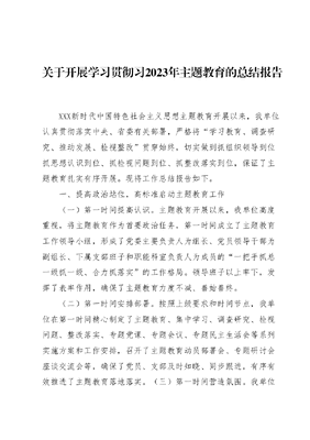 关于开展学习贯彻习2023年主题教育的总结报告XXX新时代中国特色社会主义思想主题教育开展以来,我单位认真贯彻落实中央、省委有关部署,严格将学习教育、调查研究、推动发展、检视整改贯穿始终,切实做到抓组织领导到位抓思想认识到位、抓检视问题到位、抓整改落实到位,保证了主题教育扎实有序开展。现将工作总结报告如下。一、提高政治站位,高标准启动主题教育工作(一)第一时间提高认识。主题教育开展以来,我单位高度重视,将主题教育作为首要政治任务,第一时间成立了主题教育工作领导小组,形成了党委主要负责人为组长、党员领导干部为副组长、下属支部班子和职能科室负责人为成员的一把手抓总一级抓一级、合力抓落实的工作格局。领导班子以上率下,发挥了表率作用,确保了主题教育力度不减、善始善终。(二)第一时间安排部署。按照上级要求和时间节点,我单位在第一时间精心制定了主题教育、集中学习、调查研究、检视问题、整改落实、专题党课、专题会议、专题民主生活会等系列实施方案和工作安排,召开了主题教育动员部署会、专题研讨会座谈交流会等,确保了党员、支部及时知晓、同步跟进,有序有效推进了主题教育落地落实。(三)第一时间营造氛围。我单位充分利用内网、官网、微信公众号等载体,及时推送重要学习内容和宣传信息,广泛宣传先进人物典型事迹和身边优秀榜样,加强正面引导,强化舆论影响,营造出良好氛围,干部职工对标先进、见贤思齐,以饱满的政治热情投入到主题教育中来,推进了主题教育往深里走、往心里走、往实里走。二、强化使命担当,高质量推进主题教育工作(一)理论学习认真扎实、收获明显。一是集中学习扎实深入。主题教育开展以来,严格制定学习计划表,将《工作方案》中学习内容作为重点学习目录,先后开展中心组集中学习研讨X次,党委(支部)书记讲党课X次,发放学习资料X余份。党员干部在交流研讨学习中感触深刻、反响热烈、收获显著,达到了触动思想、振奋精神、凝心聚力的良好教育效果。二是自主学习氛围浓厚。党员干部坚持自觉主动学、联系实际学、深入思考学,每天利用空闲零碎时间,精读《选编》、通读《纲要》、逐段逐句学习党章《准则》《条例》;利用学习强国党员e家等网络平台,学习时事政治,笃信笃行学、及时跟进学、抓紧空闲学成为自觉并形成风气。三是学习成效充分体现。通过强化学习教育,党员干部普遍反映,沉心静气学习收获很大、主题教育让灵魂受到触动、思想政治受到了一场深刻洗礼;进一步加深了对初心和使命的认识,坚定了坚守初心、勇于担当的信念,切实增强了树牢四个意识、坚定四个自信、做到两个维护的政治自觉、思想自觉和行动自觉。(二)调查研究对表对标、精准深入。单位认真落实主题教育关于调研的工作要求,组织引导全体党员干部,以一竿子插到底的精神,用望、闻、问、切四诊法深入开展调研,真正做到把情况摸清、把问题找准、把对策提实。一是望实情领导干部带头深入一线,突出重点望问题、望不足。截至X月X日,领导深入基层X人次。二是闻民意。党员领导干部以四不两直方式深入一线,综合运用座谈访谈、随机走访、问卷调查、统计分析等多种形式,做好倾听者,架起连心桥,确保有多样的渠道、足够的样本数据、广泛的覆盖面。三是问良策。紧紧围绕主题教育,认真开展三问,即问计于民、问需于民、问效于民,广泛汲取群众智慧,认真收集梳理意见建议。(三)检视整改对表对标、自觉深刻。一是自我剖析深刻。班子成员、支部及党员充分发扬自我革命精神,聚焦工作短板和具体问题剖析反思,坚持把自己摆进去、把责任担起来、把问题查出来、把症结找出来,以正视问题的自觉、刀刃向内的勇气和高度负责的态度,充分利用批评和自我批评这一锐利武器,实事求是、坦诚交心,咬耳扯袖、动真碰硬,真刀真枪解决问题二是整改力度加强。班子坚持把改字贯穿始终,建立起三张清单,对查摆出的问题实施对账销号管理,做到当下改的,立行立改、即知即改,一时解决不了的,紧盯不放、持续整改,确保真改实改、应改尽改,切实做到了件件有回音、事事有着落。三、坚持标准不降,高效率巩固主题教育成果主题教育开展以来,我单位严格按照上级要求,高度重视、积极推进、狠抓落实,取得了一定的成效。但全面评估,离高标准、严要求还存在一些差距和不足。一是执行决策、从严落实上有差距。任务繁重时存在对上级决策部署理解不够深、落实不够细等问题。二是学深悟透、学用结合上有差距。有时存在理论学习计划性不强,各支部学习深浅不一、进展不平衡等问题。三是严格标准、狠抓落实上有差距。存在从根上解决问题的办法思路不够多,个别问题整改不彻底等问题。针对这些问题,下一步我们将保持目标不变、压力不减,持续巩固好主题教育成果。(一)在学深悟透上保持热度。建立健全每周一学系统学习体系,形成学习长效机制,推