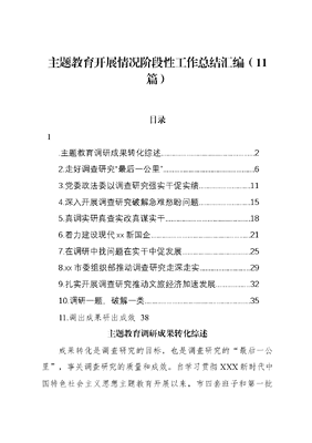 主题教育开展情况阶段性工作总结汇编(11篇)目录1.主题教育调研成果转化综述22.走好调查研究最后一公里..63.党委政法委以调查研究强实干促实绩.114.深入开展调查研究破解急难愁盼问题.155.真调实研真查实改真谋实干.186.着力建设现代xx新国企217.在调研中找问题在实干中促发展.258.xx市委组织部推动调查研究走深走实299.扎实开展调查研究推动文旅经济加速发展3210.调研一题,破解一类3511.调出成果研出成效38主题教育调研成果转化综述成果转化是调查研究的目标,也是调查研究的最后一公里,事关调查研究的质量和成效。自学习贯彻XXX新时代中国特色社会主义思想主题教育开展以来,市四套班子和第一批参学单位精准选题,夯实调研成果转化基础;着力破题,强化调研成果转化管理;研以致用,注重调研成果转化实效,在推动问题解决上下功夫,做好调查研究后半篇文章,让调研成果切实转化为解决问题、改进工作的具体举措,以实际行动助推xx高质量发展。一、精准选题夯实成果转化基础选题是实现成果转化的前提和基础。自开展主题教育以来市四套班子和第一批参学单位紧紧围绕全面贯彻落实党的XX大精神,XXXXXX对xx、xx工作的重要讲话重要指示精神,党中央决策部署和省委、市委工作要求,有针对性地研究确定调研课题,夯实了我市主题教育成果转化的基础。市委政研室对照市委大兴调查研究实施方案xx个方面的调研方向,紧扣努力率先实现社会主义现代化目标任务,聚焦全面深化改革、打造新发展格局节点城市、科技创新引领等中心工作,确定年度重点课题xx个。市政集团聚焦集团民生主业,根据全市为民办实事工作计划,筛选城市提升、教育扩容、生态保护等xx件我为群众办实事项目,由集团领导挂钩推进。市文旅局则紧扣文旅工作实际和工作中的重点难点问题、当前迫切需要解决的问题、长期待解决的疑难问题以及人民群众的急、难、愁、盼,确定xx个调研课题,局党组成员每人牵头负责x个调研课题。二、着力破题强化成果转化管理聚焦破解难题、强化整改落实是调研成果转化的重要一环市四套班子和第一批参学单位始终坚持主动担责履责尽责,对整改落实全程跟进、跟踪督促,推动资源下沉、力量下沉,做到矛盾面前不回避、困难面前不绕行,确保调研成果转化过程有深度有力度。聚焦服务企业推动经济发展,市领导带头开展蹲点式沉浸式调研,梳理排查企业发展难题。开展益企服务专项行动,安排千名处级干部挂千企,协调解决企业供电保障、员工子女入学等问题xxx个。坚持开门搞调研,采取个别谈话、座谈了解、实地调研等方式,既看高楼大x,也看背街小巷,市执法局到基层一线掌握一手资料、听取一线声音,截至目前,全局处级以上领导干部先后开展调研xxx次,查摆问题xx个,解决问题xx个,制订针对性措施xx条。针对国资国企改革、提高防范经营风险能力、增强基层党组织政治功能和组织功能发挥等工作中的重难点问题,市轨道集团党委结合巡视巡察、审计监督、自我剖析等发现的问题,形成xx项问题清单,制定xx条整改措施并紧锣密鼓推进整改。同时,持续开展我为群众办实事活动,梳理为民办实事清单xx项,已完成x项,在主题教育中不断强化国企责任担当。三、研以致用注重成果转化实效调研成果转化要力戒形式主义、官僚主义,要着力打通从知易行难到知行合一的关节梗阻,坚决防止调而不研、研而不究、究而无果,要做到研以致用。市四套班子和第一批参学单位始终重视调查研究的质量和成效,把调研成果转化为解决问题、改进工作的实际举措。市医保局坚持研以致用,拓宽成果应用,主动优化升级xxxx版惠x保医疗保障服务功能,不断兜牢民生底线,切实将调查研究成果转化为惠民生暖民心顺民意的实际举措,如取消以往设定的部分参保条件限制,最大限度扩大可参保对象的覆盖面,让更多人民群众享有惠x保带来的医疗服务保障。市