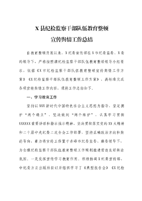 X县纪检监察干部队伍教育整顿宣传舆情工作总结自教育整顿开展以来,X纪委宣传部在X市纪委监委、X委的领导下,严格按照旗纪检监察干部队伍教育整顿领导小组要求,依据《X市纪检监察干部队伍教育整顿宣传舆情工作方案》《X纪检监察干部队伍教育整顿工作方案》,高标准完成各项宣传舆情工作内容,现将工作总结如下。一、学习教育工作坚持以XXX新时代中国特色社会主义思想为指导,坚定拥护两个确立、坚决做到两个维护,认真学习贯彻XXXXXX重要讲话和指示批示精神,坚决贯彻落实党的XX大精神和二十届中央纪委二次全会工作部署,坚持正确政治方向和舆论导向,着力将宣传工作置于赤峰市纪委监委、旗委领导下,为全旗纪检监察干部队伍教育整顿工作顺利推进营造良好舆论氛围。一是发挥宣传学习教育作用。积极协调X纪委宣传部、中纪委方正出版社征订并组织学习了《典型报告会》《X纪检监察干部违纪违法典型案例警示录》和X部警示教育片。二是发挥各单位信息联动联结工作合力。协调法院调取庭审实况视频X部,进行剪辑整理并组织观看,协调X纪委监委宣传部参观敖汉旗新时代廉洁文化教育基地。三是发挥本地案件警示性力量。编印《应知应会手册》X册,《违纪违法典型案例汇编》X册。围绕《关于微信群发布涉政有害言论案件教训警示的通报》等内容召开警示教育会议X次,组织开展意识形态专题培训X场次。二、宣传工作准确把握《中共中央关于开展全国纪检监察干部队伍教育整顿的意见》(以下简称《意见》)精神,宣传阐释全X纪检监察机关将党的领导贯彻到教育整顿全过程,强化组织领导,精准对标对表《意见》精神和部署要求,切实发挥宣传工作引领作用,始终绷紧舆论导向这根弦,提高政治敏锐性,把握好宣传报道的力度、温度和尺度。一是充分利用网络平台。线上及时转发上级纪委监委有关教育整顿的新闻报道和专题栏目,截至目前微信公众号推文X篇,网站发布文章X篇。二是主动整合宣传资源。线下制作教育整顿宣传展架X块。拍摄纪检监察干部先进事迹宣传片X部、教育整顿阶段性专题片X部。三是保障信息向上传递。向X教育整顿领导小组办公室报送信息X篇。内网网站发布信息X篇。在宣传工作上真正做到让党中央和XXXXXX放心、让人民群众满意的高度政治自觉和有力有效行动,为全旗纪检监察干部队伍教育整顿工作顺利推进营造良好舆论氛围。三、舆情应对处置工作积极主动加强舆论引导,着力展现纪检监察队伍廉洁形象宣传纪检监察队伍中涌现出的先进典型,全面展示党的纪律部队刀刃向内、解决问题的坚定决心和纯洁思想,切实做好舆情应对处置工作,激发纪检监察干部履职担当的实际行动。持续加强与市纪委监委宣传部、网信办、公安局的日常沟通协作。教育整顿开展以来,收到网信办推送的舆情提示X次,截至目前该条舆情平稳,未发生大面积传播和舆论炒作。四、存在的问题和不足教育整顿工作过程中,纪委宣传部始终把教育整顿宣传舆情工作作为一项重大政治任务,坚持正确政治方向,强化组织领导,精准对标对表《意见》精神和部署要求,切实发挥了宣传工作引领作用。但仍存在一些不足:例如宣传舆论创新动力不强,创新思想有待进一步挖掘提升。五、下一步工作计划(一)严明纪律要求,强化管理责任。严格遵守保密要求和宣传纪律,切实强化底线思维和管理责任,未经批准不得擅自对外发声。严格落实意识形态工作责任制,强化阵地意识和安全意识,严把政治关、政策关、业务关、技术关,防止引发负面炒作。(二)加强系统指导,严格请示报告。坚持纪检监察系统媒体为主、各级党报党刊媒体为辅,相关新闻报道严格参照中央纪委国家监委教育整顿宣传安排,加强与当地新闻媒体的沟通联系,一般只在当地新闻媒体发布权威信息、开展总结性报道等,确保宣传报道既坚定有力,又稳慎有序。坚持规定动作统一部署、自选动作严格审批原则,相关宣传稿件按程序送旗教育整顿领导小组办公室审核把关,拿不准的及时请示。(三)形成工作合力,扩大宣传效果。认真落实中央纪委国家监委、自治区、市纪委监委教育整顿期间舆情应对处置工作要求,结合实际修订完善旗纪委监委有关舆情工作预案。统筹X纪委监委和X监测力量,加强与市纪委监委宣传部、网信办、公安局等部门的日常沟通协作,运用好专业舆情监测机构力量,形成信息共享的工作合力。