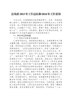 县残联2023年工作总结和2024年工作谋划今年以来,在县委县政府的坚强领导下,在省、市残联的精心指导下,县残联坚持以XXX新时代中国特色社会主义思想为指导,深入贯彻落实党的XX大精神,紧紧围绕年初既定目标任务,认真履行代表、服务、管理职能,聚焦省委六破六立,主动作为、对标推进,整体工作有序向好发展。现将2023年工作总结和2024年工作谋划报告如下。一、2023年工作总结(一)重点工作任务完成情况1.转作风提状态,持续锤炼过硬队伍。坚持把理论学习摆在重要位置,将其作为筑牢领导干部理想信念、凝聚强大精神力量、研究拓宽工作思路、推动工作创新发展的一项基础性工作抓细抓实。一是常态化抓好系统学习。抓好关键少数,召开党组理论学习中心组学习会12次,民主生活会1次,进一步树牢四个意识、坚定四个自信,坚决拥护两个确立,始终做到两个维护。精心组织对标沪苏浙、XX县残联见行动舍我其谁、由我负责、到我为止解放思想大讨论活动,先后16人作交流发言,撰写个人心得体会16篇,打破思想壁垒。组织开展以案为鉴警钟长鸣专题警示教育活动,进一步严明政治纪律和政治规矩,持续推进全面从严治党向纵深发展。二是精细化抓好主题教育。坚持把开展好主题教育作为首要政治任务,围绕学思想、强党性、重实践、建新功总要求,精心组织,统筹推进,制定印发主题教育工作方案,细化理论学习、推动发展、检视整改等各项重点任务,健全学习机制,做到规定动作一个不少、自选动作务实管用,确保主题教育各项工作环环相扣、无缝衔接,推动残疾人事业更好发展。三是长效化抓好机关党建。紧紧围绕发展抓党建、抓好党建促发展指导思想,严格落实三会一课制度,不断创新内容与方式,通过QQ群、微信群开展微党课、微学习。组织党员干部前往岳西县参加追随红色足迹厚植革命情怀主题党日活动,引领广大党员回顾党的辉煌历史,永葆党员本色,忠于初衷、牢记使命。2.稳就业保民生,不断提升帮扶质量。一是悉心贴心当好服务员。开展惠残政策宣传6场次、发放宣传材料XX余份,登记就业阶段残疾人XX名。积极搭建交流平台,征集、开发电商客服、统计员、网络主播等适合残疾人岗位,今年以来,举办专项招聘会4次,累计邀请25家企业参与,74名残疾人达成就业意向。二是细致周密当好培训员。开办残疾人职业技能和农村实用技术培训班,结合产业优势、残疾人具体需求,通过现场业务培训+实地技能教学方式,开设稻虾共生技术、茶树(油茶)种植技术、蓝莓种植技术、手工技术、缝纫机操作等培训课程,着力提升残疾人技能水平。今年以来,共组织残疾人培训3期,累计培训达XX人次。三是纾忧解困当好帮扶员。分门别类、量身定制,为有创业意向的残疾人落实资金扶持和技术指导,拓宽残疾人就业渠道,今年以来,共扶持XX名残疾人就业创业,发放扶持资金XX万元;聚焦助残设施农业、阳光助残扶贫等项目,按照规模对照标准,审核发放资金补贴,今年以来,共扶持阳光大棚项目19个,助残基地2个,共计发放扶持资金XX万元。对照要求给予家庭困难残疾学生高等教育资助,今年以来,共资助残疾学生71名,发放补助XX万元。3.按标准重质量,稳妥推进康复工程。一是找准需求点。全面了解持证残疾人基本信息、基本医疗与康复服务等方面的状况与服务需求,建立康复需求台账,收集康复需求2141条,其中基本医疗需求2113条、辅助器具需求28条。实行集中+常态+下乡评残模式,坚持过程监督+结果审核相结合,今年累计开展集中评残12次,上门评残28次,累计办、换证达2000余份,未出现一例违规评残事件,未发放一份人情证。二是延伸服务线。将康复服务延伸至村(社区)卫生室,通过签订家庭医生签约服务协议书,由家庭医生为XX名残疾人提供上门康复服务。按照一对一评估、个性化适配原则,为残疾人提供量身定制服务,今年以来,帮助残疾儿童适配假肢矫形器14例,适配辅助器具X例,发放辅助器具XX件、人工耳蜗补贴XX万元。三是扩大受惠面。制定出台县困难残疾人康复实施方案,对困难精神残疾人药费补助、6类残疾儿童抢救性康复扩面提标,做到应补尽补、应救尽救。今年以来,共救助困难精神病患者XX人,发放补助资金XX万元,安置转介残疾儿童XX人到定点康复机构进行康复训练。4.讲原则看实际,健全社会保障体系。一是对标对表高要求。严格对照规定,配合民政部门推进两项补贴应补尽补。今年以来,发放重度残疾人护理补贴XX人次,累计资金XX万元,发放困难残疾人生活补贴XX人次,累计资金XX万元。出台《关于进一步规范残疾人机动轮椅车燃油补贴发放工作的通知》文件,规范资金监管、确保合理合规,今年以来,共发放补贴XX万元。二是统筹推进高质量。出台《XX县困难重度智力残疾人托