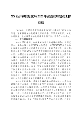XX经济和信息化局2023年法治政府建设工作总结 2023年,我局认真贯彻落实党的XX大精神及XXX法治思想,紧紧围绕法治政府建设目标任务,压紧压实责任,细化推进措施,扎实推进法治政府建设各项工作,取得了一定成效。一、工作开展情况(一)深化学习,加强党对法治政府建设的领导。利用党组会、局务会深入学习XXX法治思想,对XXXXXX关于法治政府建设的重要论述开展了交流发言,做到了有记录、有纪要。要求全局上下将XXX法治思想贯彻到法治政府建设全过程和各方面。加强党对法治政府建设的领导,严格落实党政主要负责人履行法治建设第一责任人职责,成立了以局党组书记、局长为组长,局班子成员为副组长,相关科室负责人为成员的法治政府建设领导小组,下设办公室于政策法规科,负责处理法治政府建设日常事务。制定《XX法治政府建设全面提速年工作方案》责任细分方案,进一步压实各科室责任。将法治建设工作任务、目标分配到各科室,并将工作任务完成情况纳入年度考评。按要求向州委、州政府报告重大法治工作落实情况,向州人大报告履行法治政府建设第一责任人情况。(二)优化服务,营造了良好的法治营商环境。一是动态调整行政权力清单。根据四川省2023年行政权力事项清单,形成本单位行政权力事项清单,动态完成四川省一体化平台3.0版本事项更新和四川省一体化政务服务平台4.0事项认领、编辑、上报。二是提升政务服务水平。积极配合州发改委、州市场监管局完成2022年度营商环境数据收集。完成政务服务事项目录编目80条,完成互联网+监管平台行政许可、行政处罚数据采集185条。做好12345热线平台回复和全国投资项目在线审批监管平台的操作解释答疑。三是积极开展营商环境提升行动。认真贯彻落实党中央、国务院和省委、省政府关于清理拖欠中小企业账款的决策部署,将清欠工作作为做好六稳工作、落实六保任务的重要举措,将增强民营企业中小企业获得感作为清欠工作的着力点和出发点,坚决维护市场主体的合法权益,坚持问题导向,压紧压实责任,强化督促督导,扎实开展防范和化解拖欠中小企业账款专项行动。先后印发《XX减轻企业负担领导小组办公室关于做好深化放管服改革优化营商环境2023年重点任务相关工作的通知》《XX减轻企业负担领导小组办公室关于做好防范和化解企业账款工作的通知》等文件,对加快推进欠款清偿工作、落实逾期未支付中小企业账款强制披露制度情况、审计发现问题、虚报还款金额、故意拖欠等情况提出了明确要求,全面压实属地管理,分级负责,谁主管谁负责责任。四是严格落实公平竞争审查制度。建立健全公平竞争审查机制,印发了《XX经济和信息化局公平竞争审查制度实施方案(试行)》,进一步明确了各科室审查责任和审查内容,坚决不允许出现影响企业公平竞争的限制性措施。今年,共审查规范性文件5件,均未出现影响公平竞争的相关措施。加强对妨碍统一市场、不正当竞争等问题整治,全面落实市场准入负面清单制度。五是持续提升监管效能。全面推行监管执法一目录,五清单制度,积极配合州交通局开展双随机一公开工作,加强机动车违规改装的监管工作。(三)健全体系,全面推进政府治理规范化程序化法治化一是加强规范性文件清理。全面落实规范性文件合法性审查制度,制定单位规范性文件备案审查程序,未经合法性审查或审查不合法的,不予审议印发。及时制定《州经信局关于开展州政府规章、行政规范性文件清理工作方案》,明确了清理范围、清理标准、方法和责任主体,全面清理了2013年1月1日至2022年12月31日以阿府发、阿府函、阿府办发、阿府办函、阿府规、阿府办规等6种字号印发的州政府文件,共清理非涉密文件80件,经合法性审核、集体审议,建议废止3件、失效56件、拟修改1件,继续有效20件。二是充分发挥法律顾问作用。聘用四川思勉(阿坝)律师事务作为常年法律顾问,充分发挥法律顾问作用,有效防范和规避法律风险,保障各项工作依法管理、依法运行。今年对《XX留存电量管理和使用办法》《XX支持市场主体纾困解难若干措施》等6个材料进行了合法性审查。邀请四川思勉(阿坝)律师事务所法律专家刘斌勇授课,对全州工业企业开展了工业企业法律风险规避及防范专题法律培训。(四)严格决策程序,切实提升决策合法性和公信力。一是常态化推进会前学法制度。严格落实《领导干部学法用法制度》,坚持推动会前学纪学法,制定年度学法用法计划,常态化推进党组会、局务会、职工会会前学法,组织干部职工集中学习与业务相关的法律法规。今年组织全体干部职工学习了《四川省行政调解工作暂行办法》《黄河保护法》等12部法律法规,进一步提升了干部职工法律意识。二是严格依法决策依法行政。全面落实三重一大制度,针对重要决策、重要文件、框架协议等主动听取合法性审查机构的意见,有效规避违法行为。对重大决策提前广泛征求建议意见,实