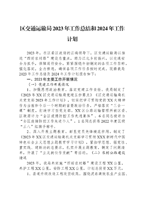 区交通运输局2023年工作总结和2024年工作计划2023年,在区委区政府的正确领导下,区交通运输局以推进四好农村路建设为重点,助力江北乡村振兴,以交通安全为抓手,保障通行安全,紧紧围绕年初制定的各项工作目标,强化落实,全力推进,确保各项工作任务按时完成。现将我局2023年工作总结及2024年工作计划报告如下:一、2023年主要工作开展情况(一)党建工作开展情况1、加强思想政治教育,落实党建工作责任。我局制定了《2023年XX区交通运输局党建工作要点》《区交通运输局机关党支部2023年工作计划》,切实把学习贯彻党的XX大精神作为当前和今后一个时期的首要政治任务,严格落实三会一课制度,打造学习型党支部。XX区公路运输管理所被区委、区政府评为全区疫情防控工作先进集体,6名同志被评为全区疫情防控工作先进个人,1名同志获得2022年度区级三八红旗手称号。2、深入开展主题教育,彰显党员先锋模范作用。制定了《2023年XX区交通运输局机关支部学习贯彻XXX新时代中国特色社会主义思想主题教育学习计划》,紧扣学思想、强党性、重实践、建新功的总要求,扎实开展主题教育,制定了问题清单,开展了立足岗位作贡献等活动。(二)农村公路建设情况2023年,我局共实施四好农村路建设工程XX公里,养护工程XX公里,安防工程XX公里,计划总投资XX万元。1、县道升级改造工程攻坚收尾。围绕沈巷高效农业产业园、白茆现代农业产业园和建制村通双车道,实施新裕路、汤三路、莲花大道三条县道升级改造工程,共计里程XX公里,计划投资XX万元。目前主体工程已全面完工。2、完成自然村通硬化路和联网路工程。围绕实现全区较大自然村通硬化路和完善农村公路网目标,实施自然村通硬化路7条计X公里、联网路22条计XX公里,其中产业路5条,计X公里,旅游路3条,计X公里。计划总投资XX万元,目前项目已全部完工。3、完成养护工程、安防工程。围绕提升农村公路通行水平,实施养护工程计XX公里,其中大中修7条路计XX公里,目前项目主体工程已完工。围绕提升农村公路安全防护水平,实施安防提升工程计XX公里,计划总投资XX万元,目前项目已全部完工。(三)安全生产工作开展情况开展交通运输行业安全生产集中整顿百日攻坚行动,做好元旦和春节前安全隐患排查整治。组织对辖区水上交通开展船员实操能力,渡口渡船超员安全风险隐患排查。对危桥等桥梁开展安全隐患排查。对公路工程建设组织安全检查及隐患排查,共排查隐患30处,完成整改。农村公路各建设及管养主体单位对辖区204公里县道重点问题进行全面摸排,共排查隐患39处,已全部整改到位。持续推进雍镇渡船及南垄汽渡船更新改造工作。雍镇渡船核载定额不能满足运力需求,新船前期工作进行中。南垄汽渡船已招标,合同签订已完成,积极对接市交通局、皖江船检局协调渡船检验及争取上级补助资金。(四)高速项目建设保障情况目前我区高速公路建设项目共3个,分别为:G5011芜合高速公路芜湖至林头段改扩建工程已建成通车,正在解决遗留的三改、征收资金等问题,三改涉及的一般耕地指标问题,省交控表示可以出资金,由区政府购买指标配合解决。G4211宁芜高速公路芜湖段改扩建工程、G5011芜合高速公路宣城至芜湖段改扩建工程,进展总体较为顺利。(五)国省道干道建设保障情况市交通局在我区有通江大道三期、快速化、G329一级路改造、牛屯河危桥改造、裕溪河特大桥项目需要保障。目前通江大道二期剩余1户影响人行道;三期收尾局部问题。快速化项目当下重点是二坝镇博诚汽修五户连体房的征收,后续是雍南小区,保障明年8月份主线通车。裕溪河特大桥项目二坝一侧肖氏房屋、机器设备的征收,以及代征户资金的问题,项目交地已经推迟。我局到现场与各镇、部门共同下力气解决。二、亮点工作(一)狠抓项目进度,做好包保征收工作高效率、高水平、高质量完成项目征收工作。2023年7月8日和2023年7月15日因包保征收项目获得流动红旗共2次;2023年10月19日因官陡街道中江中小学滨河分校项目征收包保任务完成,被区征收工作指挥部通报表扬。(二)采用新型技术,巩固脱贫攻坚成果在全市农村公路建设中首次采用的水泥混凝土路面冷再生施工技术,该技术有着绿色环保、造价低、工期短、质量高等优点,市人大领导对我区农村公路建设成效和采用的冷再生技术给予肯定,该新技术应用能进一步发挥资金效益,巩固拓展脱贫攻坚成果,提升农村公路交通高质量发展。市交通局、市公路中心组织各县、区公路管理机构到我区学习水泥混凝土路面冷再生施工技术应用。(三)精心谋划部署,助力江北乡村振兴在道路规划中牢固树立产业路、振兴路、致富路思维,充分考虑与农业产业园区相衔接,大力推进农村道路建设,围绕白茆农业产业园建设环线,沈巷高效农业园拓宽道路提升道路等级,有力的支持了农业产业发