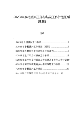 2023年乡村振兴工作总结及工作计划汇编(8篇)目录1.2023年乡村振兴工作总结22.2023年乡村振兴工作总结(村级)53.2023年乡村振兴工作总结及工作计划.64.2023年上半年乡村振兴工作总结..125.2023年上半年乡村振兴工作总结及下半年工作计划196.2023年第三季度实施乡村振兴战略工作总结227.2023年乡村振兴工作总结.298.xx市医疗保障局2023年乡村振兴工作总结322023年乡村振兴工作总结一、政府工作报告重点任务完成情况防返贫监测帮扶方面,我们县乡联动、部门协同,真抓实干坚守不发生规模性返贫的底线。一是突出联动预警。围绕三保障一安全等方面突出问题和关键信息,组织教育、医保、民政、住建等xx家行业部门筛选比对预警信息x.xx万条,反馈至乡镇、村研判核实;二是突出集中排查。组织驻村工作队、村干部、网格员采取全面排查+重点突出的方式,对全县xx.x万户农户进行全面排查,对新识别整户低保、突发严重困难户等对象重点核查,2023年已新增监测对象xxx户xxx人,制定并落实措施xxxx条,有效化解了各类返贫风险;三是突出重点帮扶。紧盯人均纯收入低于x万元和较上年下降的脱贫人口两类重点群体,实行一户一策帮扶。三保障一安全上,今年实施农村危房改造xx户,资助困难学生x.xx万人次、xxxx.x万元,脱贫户、监测户基本医保参保率xxx%,实施农村安全饮水工程xxx处改善提升xx.xx万人饮水质量。衔接资金项目管理方面,我们紧盯目标、求变创新,强化工作指导力促项目提质增效。一是立足优势资源抓好项目谋划。围绕县委、县政府提出的重点支持两茶一虾基地建设,培育创建产业园、田园综合体等乡村振兴示范的要求,坚持集中力量办大事原则,牵头组织开展2024年衔接资金项目库建设,会同财政、农业等行业主管部门开展项目论证评审,共组织项目入库xxx个、资金x.x亿元;二是加强过程监管推进项目实施。按照x月底xx%、x月底xx%、xx月底xxx%的进度要求,加强督导和调度,确保项目资金尽快发挥效益。今年共批复衔接资金项目xxx个,下达中央、省市县四级衔接资金x.xx亿元,其中产业项目xxx个、资金x.x亿元,项目实施进度和资金支出进度均达到省市考核的时序进度;三是健全联农带农机制规范资产管理。按照巩固一批、提升一批、盘活一批、另起炉灶一批的要求,健全完善项目资产运营监管和联农带农机制,开展项目资产清查、问题排查整改,进一步优化资产运营处置工作方案。有序开展了2022年项目资产确权登记,纳入资产台账管理的项目资产xxx个、项目资金金额x.x亿元。二、重点工作开展情况我们紧盯脱贫人口稳定增收,强化产业和就业帮扶,兜牢防贫基础。一是抓好务工就业。全县共有x.xx万人脱贫劳动力(含监测对象x.xx万人)外出务工就业,超省定年度目标x.xx个百分点。按照每人xxx元标准兑现发放跨省务工交通补贴xxx.xx万元。全县开发公益性岗位xxxx个,在运营就业帮扶车间xx个,共计带动脱贫劳动者xxxx人就近就业。制定出台《宿松县创建乡村振兴宜业工坊实施方案》,组织认定第一批宜业工坊xx家;二是抓好金融帮扶。为有产业发展需求的脱贫户、监测户提供贷款,今年新增贷款xxxx户xxxxx万元,较去年增加xxx.x%,小额信贷贷款余额达x.xx亿元,户贷率为xx.x%。三是抓好光伏帮扶。压实光伏电站运维管护责任健全日常管护和市场化运维机制,巩固提升光伏电站帮扶成效,今年累计兑现村级收益xxx万元、脱贫户收益xxx余万元。我们强化帮扶职责,凝聚社会合力,共推帮扶工作成效。一是驻村帮扶方面,今年,xx名县级领导联系脱贫村,充分发挥示范引领作用,xx个村驻村工作队、xxx名干部下沉一线,推深做实六项行动,严格落实双包责任,精准制定一户一方案、一人一措施,持续做好帮扶工作。二是定点帮扶方面,今年,四级定点帮扶单位围绕巩固脱贫成果目标,为帮扶村发展直接投入资金xxxx万余元,帮助引进各类资金xxxx万余元,直接购买和帮助销售帮扶村农副产品xxx余万元,四级定点帮扶单位领导干部赴帮扶村考察累计达xxxx人次。三是县域结对帮扶方面,与xx区x个结对乡镇互派干部挂职,县教育、卫健部门选派专技人员到xx区挂职、跟班学习