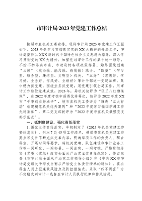 市审计局2023年党建工作总结按照市直机关工委安排,现将审计局2023年党建工作汇报如下。2023年是学习贯彻落实党的XX大精神的开局之年,审计局坚持以XXX新时代中国特色社会主义思想为指导,深入学习贯彻党的XX大精神,加强党对审计工作的集中统一领导,不折不扣落实市委、市政府的各项决策部署,始终围绕创建三强(政治强、能力强、绩效强)班子、四型(学习型、服务型、廉洁型、文明型)机关、五好(思想好、学习好、业务好、作风好、业绩好)审计干部这一党建品牌,集中精力抓党建,围绕业务抓党建,用党建引领全局工作,用审计工作检验党建成效。2023年,局机关被评为区三八红旗集体,在2022年度考核中获得优秀等次,被评为2022年度XX市干事创业好班子,被市直机关工委评为推进五大行动创建模范机关优秀案例和2022年度学习强国学用工作先进集体,第二党支部被评为2022年度市直机关最强党支部示范点。一、抓制度建设,强化责任落实1.强化主体责任落实。年初制定了《2023年机关党建工作安排意见》,列出7类45项工作清单,根据市直机关党建工作要点等文件不断充实完善内容,明确每项工作的负责人、配合科室、开展时间等要求,将机关党建、队伍建设和审计业务工作等一同研究、一同部署、一同落实、一同考核。严格贯彻落实《党委(党组)落实全面从严治党主体责任规定》。修订完善《市审计局全面从严治党工作领导小组》和《中共XX市审计局党组关于印发全面从严治党主体责任清单的通知》,要求科室人员上报廉政风险点及防控措施表,采取四不两直方不定期式到审计一线督查审计人员执行纪律和作风情况。2.加强意识形态工作的领导。审计局党组深刻认识加强意识形态工作的重大意义,以高度的政治自觉、有力的政策措施落实意识形态工作的各项任务,牢牢掌握意识形态工作的领导权、管理权、话语权。全面履行意识形态工作的领导责任,成立了意识形态工作领导小组,印发了《XX市审计局意识形态工作责任清单》,明确党组全面领导责任和党组成员一岗双责责任。研究2次意识形态工作,不断完善意识形态网格化建设,及时补齐补强支部网格员,按季度及时报送了舆情信息,5月25日接受了市委宣传部组织的意识形态专项督查。二、抓思想建设,强化能力提升1.注重政治引领。将全面学习贯彻落实XXX新时代中国特色社会主义思想、党的XX大精神、XXXXXX对内蒙古重要指示批示精神以及XXXXXX关于审计工作的重要论述等作为首要政治任务,重点学习了XXXXXX在内蒙古XX考察并主持召开加强荒漠化综合防治和推进三北等重点生态工程建设座谈会精神。按照党组成员、科长和普通干部三个层次专题学习研讨党的XX大精神,围绕学习什么、如何领会,学习的感想体会和如何贯彻落实进行三次专题研讨。坚持每月开展一天集中学习、三会一课和公众号第一笔杆主题党日活动。目前开展集中学习6次,主要领导讲专题党课3次,围绕七大思维三多三少三慢三能干部等专题研讨4次,邀请市委党校老师讲授全市经济工作会议精神1次,开展主题党日5次。2.注重民族团结。深入学习XXXXXX关于民族工作的重要论述,紧扣中华民族一家亲,同心共筑中国梦总目标,围绕共同团结奋斗、共同繁荣发展主题,深入推进民族团结进步创建工作。一是成立民族团结进步创建工作领导小组,坚决扛起民族团结进步政治责任。二是重温XXXXXX两次考察内蒙古、五次参加十三届全国人大XX代表团审议的讲话精神,并开展党组书记讲铸牢中华民族共同体意识党课1次。三是在机关内部选拔上注重少数民族干部的培养。今年1名少数名族干部被提拔为机关副科级干部。3.注重学习实效。坚持节后充电。组织开展了年初和年中两次集中培训,在全局范围内组织开展党的XX大专题学习和大讨论大落实,开展了党的XX大专题测试以及线上知识竞赛;开展了1次青年干部学习XX大精神报告会等各项专题测试。坚持逢学必考。结合应知应会知识和上一次的学习内容,在每次中心组学习时,明确一名主持人(班子成员)进行辅导,由主持人现场提问5人学习内容,学习完成后再提问2人根据学习内容谈收获感想,3人回答问题,对于不能正确回答问题的干部,考核时扣科室和个人得分。4.注重年轻干部培养。一是为加快年轻干部成长,提升其专业水平和能力,印发了《XX市审计局2023年传帮带实施方案》《XX市审计局2023年度年轻干部学习和职称考取计划的通知》,对年轻干部的学习计划提出、考取职称目标、年中督查考核以及年底学习收获总结进行了详细的规定;二是组织通过竞争选拔的形式选出政治意识强、业务知识硬、个人作风好的年轻干部担任事业中心副主任。5.注重微学习。继续鼓励和支持审计人员通过互联网+党建方式,利用学习强国、中国审计数字在线、继续教育和执法易通行等平台,每季度对学习强国