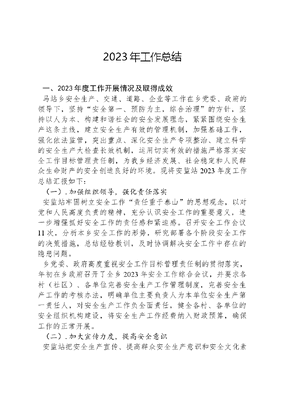2023年工作总结一、2023年度工作开展情况及取得成效马站乡安全生产、交通、道路、企业等工作在乡党委、政府的领导下,坚持安全第一、预防为主,综合治理的方针,坚持以人为本、构建和谐社会的安全发展理念,紧紧围绕安全生产这条主线,建立安全生产有效的管理机制,加强基础工作,强化依法监管,突出重点、深化安全生产专项整治、建立科学的安全生产大检查长效机制,运用切实有效的措施严格落实安全工作目标管理责任制,为我乡经济发展、社会稳定和人民群众生命财产的安全创造良好的环境。现将安监站2023年度工作总结汇报如下:(一).加强组织领导,强化责任落实安监站牢固树立安全工作责任重于泰山的思想观念,以对党和人民高度负责的精神,充分认识安全工作的重要意义,进一步增强抓好安全工作的责任感和紧迫感。召开安全工作会议11次,分析本乡安全工作的形势,研究部署各个阶段安全工作的决策措施,总结经验教训,及时协调解决安全工作中存在的隐患问题。乡党委、政府高度重视安全工作目标管理责任制的贯彻落实,年初在乡政府召开了全乡2023年安全工作综合会议,并要求各村(社区)、各单位完善安全生产工作管理制度,完善安全生产工作的考核办法,明确单位主要负责人为本单位安全生产第一责任人,对安全生产工作负全面责任,健全各村、各单位的安全组织机构建设,将安全生产工作经费纳入财政预算,确保工作的正常开展。(二).加大宣传力度,提高安全意识安监站把安全生产宣传、提高群众安全生产意识和安全文化素质,作为开展安全生产工作的基础。努力宣传党和国家安全生产方针政策,法律法规和各个时期加强安全生产工作的重大举措,宣传安全生产工作的先进典型经验和通报各地因忽视安全生产而导致事故发生的教训,警钟长鸣,有效地提高广大干部职工和群众的安全意识。在中小学校开设安全知识讲座、印发学生安全手册、提高青少年识灾、防灾和自救能力。在各村有针对性地用墙报、黑板报、挂图标语,印发农村安全生产小常识材料,防火防汛防震宣传单等普及安全常识。对村干部和生产经营单位负责人采用以会代训的方式,从安全生产的重要性和长期性,法律法规,劳动技术保障和事故应急救援体系等方面进行讲解宣传培训,动员生产经营单位人员参加安监局举办的安全知识培训班。在平时的检查中,做到边检查,边宣传,宣传中检查,检查中宣传,检查与宣传相互融合、相互促进。(三).现场检查与隐患排查整改为确保全乡不出大事故,减少一般事故的发生,定期与不定期进行现场检查克服安全工中点多面广、线长的特点,及时检查、及时发现隐患、及时消除隐患,这是日常工作的重中之重,按照年初工作计划每季度到相关企业、学校、市场进行一次常规检查,随时定期不定期到相关企业检查,共进行了现场检查10余次,建立安全生产大检查长效机制企业4户。从根本上遏制事故的发生。非煤矿山方面:我乡非煤矿山企业主要有荣达碎石厂,现处于停工停业状态,但安监站执法不放松,严格执行云南省安全检查规范,要求非煤矿山企业定期向乡安监站汇报安全生产情况,乡安监站将随时现场检查,并提出整改措施。危化品及烟花爆竹方面:辖区内有危险化学品经营企业3户,烟花爆竹有证经营5户,进行了8次现场检查,做到严格管理科学管理,对烟花爆竹存放点进行隐患排查,并督促商家及时整改,确保安全。对未取得烟花爆竹经营(零售)证的商店超市严禁上架销售,做出相应处罚。公路沿线整治方面:加大宣传力度,提高全社会特别是公路沿线群众保护环境、维护秩序的意识。安排专人负责的云马路、腾板路、火山景区路等将进一步加强对这些人员的管理,督促他们积极工作,确保路容路貌干净、周边环境卫生清洁。集中清理违法建筑、乱堆乱放、非公路标志、地面构筑物和优化、美化公路路域环境,全面优化公路沿线两侧及周边环境,提升公路交通综合服务水平。,共清理乱堆弃土3堆200余方,垃圾2.2方,聘请保洁人员两名负责对市道、省道20米内的白色垃圾全年进行清捡,确保清洁。要求白草坝项目施工单位聘请保洁人员及时打扫腾板路,保证腾板路公路沿线环境质量,提升马站旅游品牌和现象。为创造一个良好的环境形象,我乡123个自然村多次组织动员乡村干部、辖区单位和广大青年,积极开展了10余次大规模的环境卫生整治活动,对全乡的环境进行了彻底整治。建筑业管理方面:建筑业是我乡支柱产业,流动性较大,安全管理具有一定难度,我乡通过充分调查研究,在总结以往经验的基础上,本着标本兼治的原则,一是每年定期召开相关人员安全生产培训会,学习安全生产相关法律法规和知识。二是每年定期、不定期到施工工地进行跟踪督促检查,并召开工地施工现场安全培训会,全面阐述了安全生产与生产效益之间的辨证关系,让农民工真正认识到安全第一的重要性。三是与施工企业签订安全生产责任状,从而使业主深刻认识开展安全生产工作的重要性、必要性和紧迫性、主动性和自觉性,履行好企业的责任