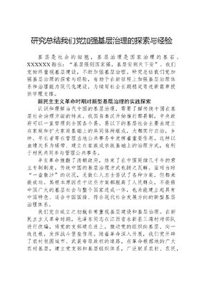 研究总结我们党加强基层治理的探索与经验基层是社会的细胞,基层治理是国家治理的基石。XXXXXX指出:基层强则国家强,基层安则天下安。我们党始终重视基层建设,不断加强基层治理。研究总结我们党加强基层治理的探索与经验,有助于在新征程上加强基层治理体系和治理能力现代化建设,为续写社会长期稳定奇迹新篇章提供学理支撑。新民主主义革命时期对新型基层治理的实践探索认识和理解当代中国的基层治理,需要了解传统中国在基层社会治理方面的特点。我国自秦汉开始推行郡县制,中央政府可以一直管理到全国各个县。县以下的基层社会主要由建立在家庭和扩大家庭基础上的共同体所组成,大都实行自治,乡绅、年长者等在管理当地公共事务中发挥着重要作用。这种以血缘关系为纽带、建立在家族或宗族基础上的治理方式,有利于村民共同参与管理公共事务。辛亥革命推翻了清朝政府,结束了在中国延续几千年的君主专制制度,传统中国的基层治理方式也随之瓦解。面对当时一盘散沙的状况,无数仁人志士尝试了各种方案,但都未能成功。其根本原因在于这些方案都脱离了人民群众,不能将中国广大的基层社会与整个国家连成一体,也未能建立起具有中国特色、适合中国国情、符合现代社会发展方向的新型基层治理体系。我们党自成立之初就非常重视基层建设和基层治理。在新民主主义革命时期,毛泽东同志在江西省永新县三湾村对部队进行改编,将党的支部建在连上,推动党的组织向基层、向一线扎根,发挥战斗堡垒作用。随着革命深入开展,我们党开辟了农村包围城市、武装夺取政权的道路,在革命根据地的广大农村基层,建立党支部和基层组织体系,广泛联系农村、农民,在根据地实现了政权建设与基层社会的紧密联结,有效解决了一盘散沙的治理难题。新中国成立后,我国建立起全新的基层治理体系新中国成立后,我们党不断加强基层建设,为巩固新生政权、恢复和发展国民经济、推进社会主义建设发挥了积极作用。在农村,我们党实行土地改革,废除了封建土地所有制,把土地分配给农民,提高了农民的经济地位、社会地位,同时加强基层党组织和村庄组织建设。1950年,政务院通过《乡(行政村)人民代表会议组织通则》和《乡(行政村)人民政府组织通则》,规定乡和行政村并存,确立了农民在乡村事务中的主体地位。在城市,我们党推动建立居民委员会。1954年12月,全国人大常委会通过《城市居民委员会组织条例》,明确居民委员会是群众自治性的居民组织,主要任务包括动员居民响应政府号召并遵守法律、领导群众性的治安保卫工作、调解居民间的纠纷等。这样一来,我们党在全国范围逐步建立起全新的基层治理体系,主要包括两个方面:一是基层党组织建设,即在农村和城市基层社区建立党小组或党支部;二是城乡居民自治组织建设,即村(居)民委员会。村民委员会在上级党组织领导下联系村里每一户家庭;居民委员会接受上级党组织领导,联系社区内每一户家庭和居住者。这一基层治理体系将党的领导与居民自治有机结合,将党的路线方针政策更加直接地传递给每一个居民,为现代国家政权打下了坚实的基层治理基础。在中国这样一个人口规模巨大的社会,这一基层治理体系极大激发了广大人民群众参与国家建设的积极性,有利于实现动员群众、服务群众的目标。比如,新中国成立后不久我国开展的爱国卫生运动,就充分检验了这一基层治理体系的动员性和高效性。通过基层治理体系,组织动员人民群众清除垃圾、疏通沟渠、填平洼地、改善饮水、合理处理粪便、捕鼠、灭蝇等;大力进行卫生宣传教育,普遍提倡勤洗衣、勤洗澡、不喝生水、不吃生菜生肉、不随地吐痰便溺等良好的个人卫生习惯;等等。这些措施广泛宣传了卫生知识,纠正了不卫生、不文明行为,有效控制了传染病流行,大大降低了我国初生婴儿死亡率,提高了人均预期寿命。20世纪60年代初,浙江枫桥干部群众创造了依靠群众就地化解矛盾的枫桥经验,成为我国基层社会治理的金字招牌。改革开放后,基层治理创新不断激发社会活力党的十一届三中全会以后,我们党团结带领人民解放思想锐意进取,创造了改革开放和社会主义现代化建设的伟大成就,实现了从高度集中的计划经济体制到充满活力的社会主义市场经济体制、从封闭半封闭到全方位开放的历史性转变。社会主义市场经济体制的建立和完善,极大激发了经济发展与社会进步的活力,社会流动规模扩大、速度加快,社会群体日益多元、利益诉求更加丰富,人民群众参与社会建设的机会更加丰富、自治的积极性日益提高。适应这一变化,我们党与时俱进推动基层治理体制机制改革与创新。1993年,党的十四届三中全会提出加强政府的社会管理职能,保证国民经济正常运行和良好的社会秩序;2004年,党的十六届四中全会提出加强社会建设和管理,推进社会管理体制创新建立健全党委领导、政府负责、社会协同、公众参与的社会管理格局;2006年,党的十六届六中全会作出《中共中央关于构建社会主义和谐社会