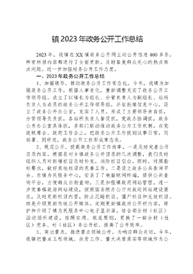 镇2023年政务公开工作总结2023年,我镇在XX镇政务公开网主动公开信息400多条,所有栏目内容都进行了全面更新。及时答复群众关心的热点难点问题。进一步加强村务公开工作力度。 一、2023年政务公开工作总结1、加强领导,推动政务公开工作常态化。今年,我镇为加强政务公开工作,根据人事变化,重新调整充实了政务公开工作领导组。成立了以镇长为组长、分管负责人为副组长、站所负责人为成员的政务公开工作领导组,并依托镇信息中心,设立了政务公开办公室,充实了人员。形成了主要领导亲自抓,分管领导负责抓,各站所负责人督促抓,党政办协调抓,政务公开办公室具体抓,多部门联动推动政务公开工作机制。在党政联席会、政府工作会上,把政务公开工作提到议事日常,同部署、同研究,政务公开工作形成常态化。 2、规范公开,提高政务公开工作效率。一是及时完善公开目录内容。根据县对乡镇政务公开目录的几次调整,我们及时组织人员对新增栏目及时补充,消除栏目空白。同时,对照指标要求,做好其他栏目的完善工作。二是设立政务公共查询平台。在镇为民服务中心,安装了了电脑联网终端,提供公共查询平台,方便群众自助查询。三是加强镇政府网站管理。进一步完善镇政府网站建设,按照国务院办公厅对政府网站建设要求,及时更新栏目内容,防止沉睡栏目、僵尸栏目和无效栏目。四是升级更新传统公开媒体。定期更新镇政府公开栏内容,维护和升级了镇为民服务中心电子显示屏。结合部分村(社区)活动场所建设,按照实用、规范原则,更换了一部分村(社区)党务、村(社区)务公开栏,提高了公开效率。3、突出重点,推进重点领域公开。为响应群众关切,今年,我镇把重点工程领域、扶贫工作、重大决策落实等领域作为公开重点,突出公开的时效性、全面性、可读性,让群众看得明白,讲得清楚。特别对扶贫项目、扶贫资金使用进行全程监督公开,镇扶贫办在第一时间对扶贫工作事项进行公开,取得成效明显。在财政专项资金公开中,认真审核财政清单,及时调整目录,做到应公开全公开、及时公开。今年,还对镇党委政府重大决策、落实和结果等进行了详细公开,提高了政府决策、落实、结果的透明度。 2023年,我镇政务公开工作各级领导重视和镇直各部门的协同下,取得了显著成绩,我们将继续加大力度,及时总结,找出差距,认真谋划,全力抓好2024年度政务公开工作。二、下一步政务公开工作计划新的一年,我镇将继续贯彻落实上级关于政务公开工作目标要求,做到早谋划、早细化、早落实,增强抓好政务公开的自觉性。1、认真研究,制定推进XX镇2024年推进政务公开工作实施方案,细化工作计划,明确工作目标,确保政务公开工作有序推进。2、加强重点领域公开。结合党委政府年初工作计划,有针对性地开展重点领域公开,及时解决群众关注的热点、重点问题。 3、强化部门政务公开力度。2023年,我镇将根据指标体系的特性,进一步把工作目标和任务分解到各单位。同时,加强单位公开的监督检查,确保政务公开常态化。