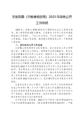 市发改委(市粮食物资局)2023年政务公开工作总结2023年,坚持以XXX新时代中国特色社会主义思想为指导,深入贯彻党的XX大精神,认真落实《中华人民共和国政府信息公开条例》,以公开为常态、不公开为例外,夯实工作基础,完善工作流程,推动重点领域信息公开,不断提高工作实效。一、抓好政务公开工作基础1.加强工作机构和专业队伍建设。成立有政务公开工作领导小组,主要负责人任组长,领导班子成员任副组长,机关各科室和委属各单位负责人任成员。2023年1月,依据人事变动及时调整了领导小组成员。5月,政务公开工作分管负责人主持召开全委政务公开业务培训会;委分管负责人采用政风行风热线形式公开解读《XX市域大交通规划》。9月,积极对接、提前谋划2024年全市发改系统政务公开工作人员业务培训工作10月,委主要负责人召开党组会议听取政务公开工作推进情况汇报。明确将政务公开工作纳入机关、事业单位科级及以下工作人员年度考核。组织开展工作实绩评价,负责任地向市政务公开办推荐2022年度先进个人,充分调动职工参与政务公开积极性。2.落实法定主动公开要求。为落实《中华人民共和国政府信息公开条例》第二十六条属于主动公开范围的政府信息,应当自该政府信息形成或者变更之日起20个工作日内及时公开的规定,督促各相关科室、各县区发改委(粮食物资局)按月发布行政权力运行结果信息。3.不断完善工作制度。2023年专门印发《政府网站集约化平台子站管理实施细则》《政务新媒体管理实施细则》。严格落实信息发布三审制,层层签审《市发改委(市粮食物资局)信息发布底稿》,办公室存档。同时指导各县区发改委落实信息报送签审制度。切实把好信息公开内容政策关、导向关、保密关。二、加强工作部署和整改落实2023年,相继印发《XX市发改委(市粮食物资局)关于开展政务公开重点工作提升行动的通知》《XX市发改委(市粮食物资局)关于开展2023年重大建设项目领域、粮食安全领域基层政务公开标准化规范化定期评估工作的通知》等文件。根据市政务公开办季度测评反馈问题等,制作交办单,督促相关科室整改后及时公开整改报告。向省粮食和物资储备局报送《XX市粮食和物资储备局关于XX市粮食和物资储备系统政务公开工作情况的报告》。反馈《省发展改革委关于开展重点领域信息公开专项提升行动的通知(征求意见稿)》意见,并在正式文件下达后及时进行部署。公开发布《XX市发改委(市粮食物资局)政务公开工作领导小组办公室关于XX市2023年度政务公开重点工作清单贯彻落实情况的报告》等。三、完善政务公开工作流程1.加强政府信息管理。严格执行政府信息公开属性源头认定规定,每月发布一次非主动公开文件目录。每月组织相关重点科室发布一次年度重点工作指标序时进度完成情况。2.加强解读回应。规范性文件全部配套七要素文字解读,及时发布政策图解。12345回应群众关切,使用XX市协同办公系统XX市网上留言办理审核单发起,由经办科室负责人、分管负责人、主要负责人层层签审后回复,留言办理质效有保障。2023年已办结110条,群众满意度较高。3.加强依申请公开。2023年已办结依申请公开件30次。XX市发改委(市粮食物资局)依申请公开流程包括受理、签批交办、承办科室答复、合法性审查、行文审签、送出。办公室统一受理,并提出拟办意见、制作政府信息依申请公开办理批办单交分管负责人签批,承办科室根据办公室提供的省政务公开办统一模板、常用条文一览表、历史答复书等资料,结合业务实际制作答复书(送审稿),法规科介入审查并出具法制审查意见,办公室使用XX市协同办公系统发起上行文发文流程,由承办科室负责人、分管负责人、主要负责人层层签审后,编号、盖章,并根据申请人需求,采取邮寄、邮箱等方式发出答复。截至目前,未发生行政复议或者行政诉讼。4.多渠道发挥好政务公开平台作用。2023年,组织上线政风行风热线2次,新闻发布会3次。政务微博、政务微信账号XX市发展和改革委员会发布发布的内容涵盖发展改革、粮食、价格等各种主题。四、积极推动重点领域信息公开1.集中公开行政规范性文件。公开有效规范性文件54件,废止、失效规范性文件10件,提供Word版和PDF版两个版本,方便公众查阅下载。落实政策文件颗粒化要求,开展规范性文件政策标签认定、兑现指南填写等工作。2.推动基层政务公开标准化规范化建设。重点围绕粮食安全领域指标设置情况、公开内容准确性、公开频率等三个方面顺利完成2次测评。通过推动测评反馈问题整改,各县区调整了部分栏目,制度上增加了发布频率,删除了一些错误表述、信息,总体情况有了很大改善。3.不断加强信用信息归集共享应用。督促各地各部门及时、全量归集信用信息。主动开展数据对接,实现交通、公安、市场监管、住建、人社、招投标等领域的信息对接市信用平台数据库,全年