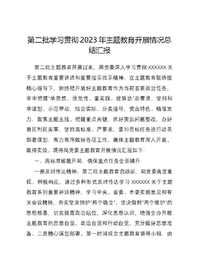 第二批学习贯彻2023年主题教育开展情况总结汇报第二批主题教育开展以来,局党委深入学习贯彻XXXXXX关于主题教育重要讲话和重要指示批示精神,在主题教育联络组精心指导下,始终把开展好主题教育作为当前首要政治任务,牢牢把握学思想、强党性、重实践、建新功总要求,坚持科学谋划、示范带动,结合实际、分类指导,突出特色、精准发力,聚焦主题主线、把握重点关键,抓好突出问题整改,办好惠民利民实事,坚持高标准、严要求,紧扣目标任务进行动员部署谋划,有力有序做好各项工作,确保主题教育深入开展、取得实效。现将局党委主题教育开展情况汇报如下:一、高标准破题开局,确保重点任务全面铺开一是及时传达精神。第二批主题教育启动后,局党委高度重视、积极响应,通过多种形式及时传达学习XXXXXX关于主题教育系列重要讲话精神,学习中央、省委、市委实施意见和有关会议精神,夯实坚定拥护两个确立、坚决做到两个维护的思想根基,切实提高政治站位,深化思想认识,增强全办开展主题教育的思想自觉、政治自觉和行动自觉,充分做好思想准备。二是精心谋划部署。第一时间成立主题教育领导小组,由主要负责同志任组长,其他领导班子成员任副组长,各处室主要负责同志为成员,领导小组下设办公室,做到人员到位、组织到位、责任到位,建立健全组织领导体系,层层压实工作责任,抽调精干力量组建办机关主题教育工作专班,健全群策群力、协商共议机制,构建上下贯通、整体联动的工作格局,做好组织上充分筹备。三是抓好任务落实。把握学思用贯通、知信行统一的根本任务,根据中央、省、市有关要求,结合系统实际,谋划制定主题教育工作方案和任务安排,将重点任务落实到周,明确到天,制定党委、各党小组和党员个人学习计划,一体推进理论学习、调查研究、推动发展、检视整改各环节,在完成规定动作的同时谋划推进青年干部座谈会、清风课堂等特色做法,做好行动上的充足准备。二、高质量理论学习,确保理论学习贯穿始终一是坚持第一议题专题学。把严格落实第一议题制度作为学习贯彻XXX新时代中国特色社会主义思想的重要举措,及时跟进学习XXXXXX最新讲话精神和关于本系统的重要讲话指示批示精神,推动学习贯彻XXX新时代中国特色社会主义思想往深里走、往心里走、往实里走,不断用新时代党的创新理论凝心铸魂,切实增强忠诚核心、拥戴核心、维护核心、捍卫核心的政治自觉、思想自觉、行动自觉,用党的创新理论统一思想、统一意志、统一行动。二是利用专题会议集中学。党组利用《党的XX大报告辅导读本》、《XXX新时代中国特色社会主义思想专题摘编》、《XXX著作选读》等辅导材料,依托党组中心组、三会一课、主题党日等党建基本制度,采取党组书记、党支部书记领学,干警交流学等方式,做深集中学习,确保学有所得、学有所获。利用周例会大会集体学习X次,各党支部按照学习计划安排开展主题教育集中学习X次。三是通过读书班研讨学。在主题教育启动后,该院政治部制定主题教育学习计划表,紧紧围绕中央明确的书目,采取领导干部原文领学、全局大会集体学、党支部研讨交流等边学边讲边研讨的学习方式,让党员干部集中起来学、静下心来悟、敞开心扉谈,切实加深对党的创新理论的理解和把握,不断筑牢信仰之基、补足精神之钙、把稳思想之舵,坚决防止形式主义。共组织开展X期读书研讨班,参与X人次,研讨X人次。四是带动全局党员自主学。党员们干部积极发挥自身的主动性,充分利用好八小时之外的时间,围绕主题教育明确的必读书目、学习强国等学习平台,并结合线上学习等方式,根据部门业务必需、个人能力亟需的知识,针对个人的短板弱项等开展个人自学,确保学习计划有序、内容精准,促进学习提质、能力增效。三、高水平服务群众,确保以学促干落到实处局党委班子带头,落实大兴调查研究之风相关要求,深入基层一线,坚持问计于民、问需于民,着力解决人民群众急难愁盼问题,实实在在办好惠民利民实事。一是办好办实关键小事。坚持把四下基层作为重要方法和关键举措,敢于接烫手山芋、钻矛盾窝,多到困难多、群众意见集中、工作打不开局面的地方去,真诚倾听群众呼声、真实反映群众愿望、真情关心群众疾苦,通过深入调研把情况摸清、把问题找准、把对策提实,真正把惠民生、暖民心、顺民意的工作做到群众心坎上。以支部为单位,把立足岗位激发干事热情作为主题教育有效落实的重要抓手之一,主动延伸为民服务半径,切实把我为群众办实事作为联系群众、服务群众的重要桥梁,以提升服务为标,依托窗口服务阵地和党员先锋岗,积极回应群众关切,用心解决民生难题,用力办好民生实事、用情写好民生答卷,打通服务群众的最后一公里,真心为百姓办实事、解民忧。二是真查实改突出问题。坚持当下改与长久立相结合,把自己摆进去、把职责摆进去、把工作摆进去,增强检身若不及的自觉、发扬动真