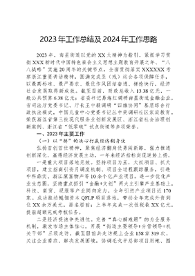 2023年工作总结及2024年工作思路2023年,南星街道以党的XX大精神为指引,紧抓学习贯彻XXX新时代中国特色社会主义思想主题教育开展之年、八八战略实施20周年的关键节点,全面贯彻落实XXXXXX考察浙江重要讲话精神,圆满完成亚(残)运会各项保障任务,以最高标准、最严要求、最优作风团结奋进、拼抢快行,经济社会发展取得新成效。截至目前,财政总收入13.38亿元,一般公共预算6.38亿元;省委书记易炼红调研南星街道金融企业,省司法厅党委书记、厅长王中毅调研四维协同基层综合行政执法模式,中国儿童中心党委书记丛中笑调研社区家庭教育,荣获浙江省第三批现代服务业创新发展区、浙江省社会治理创新案例、浙江省低零碳试点街道等多项荣誉。一、2023年主要工作(一)以拼的决心打赢经济翻身仗弘扬首创首位精神,聚焦经济翻身仗勇闯新路,强力推进创新深化,赢得经济发展主动,一年来经济指标实现逆势上扬。一是重大项目落地见效。坚持项目为王,大抓项目、抓大项目,建立招商引资月调度机制、项目全过程跟踪服务,引进中科鼎实、浙江廪富物产等10余个亿产业项目。进一步优化产业生态圈,坚持重点招引金融+文创两大主引擎产业基础上,科技、商贸、现服等产业同向发力,全年引进产业项目近170家。成功推动鲲翎资本QFLP项目落地,带动全年完成外资到位XX余万美元,排名居前;上半年完成一次性税收XX亿元,提前超额完成考核任务。二是经济提速争先进位。完善真心解难题的为企服务机制,激发市场主体信心,开展街道主要领导+分管领导+机关干部三级走访,截至目前共走访规上企业158家319次,关注企业需求、解决发展困境,协调毛戈平总部项目用地、图强工程材料融资困难等难题26个,有力促进企业健康发展,带动街道各项经济指标提升进位。截至三季度,地区生产总值增幅达5.8%、社会消费品零售总额增幅达28.61%、建筑安装工程投资完成额增幅达62.78%,均位居全区首位;建筑业增加值增幅达6.63%、限上零售业销售额增幅达53.54%、限上餐饮业销售额增幅达39.59%,均位居全区第二,其他固投等多项指标增幅位居全区前列。三是产业基础全面提升。以助力基金小镇打造2.0升级版为契机,在优化金融产业链上不断发力,成功推动全市首个QFLP项目落地基金小镇,为外资进入国内参与私募等金融活动开启新通道。着力推动灵慧人工智能等项目落地,拓展小镇企业智能投资顾问平台、金融产品和金融科技服务平台,进一步完善金融产业业态。参与推进杭州金玉上城现代金融创新发展区,构建431现代金融生态圈,成功入围浙江省第三批现代服务业创新发展区,优化金融营商环境、助力服务业扩大开放做法入选省营商环境2023年第三批最佳实践案例。(二)以抢的状态勇当改革排头兵始终领改革风气之先,着力完善深层次体制机制,以营商环境一号改革工程为突破,把南星打造成创新创业的沃土、现代治理的范本。一是创新打造四维协同执法体系。牢固树立增值化服务理念,强化系统思维,打造整体优势,依托服务、监管、解纷、普法四维协同增值手段,深入推进大综合一体化行政执法改革融入基层治理,创新首违不罚等工作机制,助力执法提质增效,打造一流法治营商环境。实施以来,执法频次同比减少23.6%,综合查一次实施率突破80%,食品安全产品质量、经营扰民等重点领域投诉举报较去年下降32.1%。相关经验做法获省司法厅党委书记、厅长王中毅调研指导、胡伟副省长批示肯定。二是创新塑造五星协理治理机制。积极开展五社联动探索实践,统筹各方资源、同心携手共建,以睦邻友好、邻里互助促进多元共治,探索形成家校政企社五星协理治理新模式,吸纳机关干部、两新党员、楼道长、学校、亲子家庭等参与社区三大提升行动,小区全覆盖开展清洁家园、亲近邻里活动12场;辖区能人贤才主动参与扮靓家园行动、亚运志愿活动,涌现出迎亚运藤艺墙等最美地标及阳台营造师等小区达人;发起我在南星当明星微笑收集计划,打造南星里遇见微笑·遇见自己笑脸墙,展现笑in南星,好客主人别样风采。三是创新推进三维共治维稳模式。构建指挥领治、平台联治、网格微治三维共治模式,一体联动、快速反应,各类网格事件、非警务事件处置率达100%。实行1+8+N的街社两级矛调中心运行模式,积极发挥街道法律服务点、共享法庭等机制,深入开展网格巡回调解,将矛盾纠纷吸附在属地,信访交办件同比下降20%。抓实重点人、事、隐患和场所的四张清单动态管控,建立隐患、措施、责任、时限督办机制,推动安全生产大排查大整治重大事故隐患专项排查整治落实企业安全生产主体责任年行动,共排查各类企业(场所)8168家,发现隐患8746处,整改率100%,确保社会面总体平稳。(三)以优
