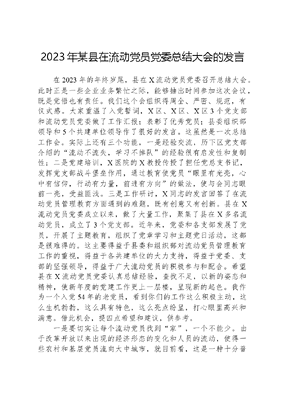 2023年某县在流动党员党委总结大会的发言在2023年的年终岁尾,县在X流动党员党委召开总结大会。此时正是一些企业业务繁忙之际,能够抽出时间参加这次会议,既是觉悟也有责任。我们这个会组织得周全、严密、规范,有仪式感。大家重温了入党誓词,X区、X区、X区3个党支部和流动党员党委做了工作汇报;表彰了优秀党员;县委组织部领导和5个共建单位领导作了很好的发言。这虽然是一次总结工作会。实际上还有三个功能,一是经验交流,历下区党支部介绍的流动不流失,学习不掉队的经验很有启发性和复制性;二是党建培训,X医院的X教授传授了担任党总支书记,发挥党支部战斗堡垒作用,通过教育使党员眼里有光亮,心中有信仰,行动有力量,前进有方向的做法,使与会同志眼前一亮,受益匪浅。三是工作研讨,X同志的发言回答了在流动党员管理教育方面遇到的难题,既有创意又有创新。县在X流动党员党委成立以来,做了大量工作,聚集了县在X多名流动党员,成立了3个党支部。近年来,党委和各支部发展了党员,开展了主题教育,组织了党章学习和主题党日活动,这都是很难得的。这主要得益于县委和组织部对流动党员管理教育工作的重视,得益于各共建单位的大力支持,得益于党委、支部的坚强领导,得益于广大流动党员的积极参与和配合。希望县在X流动党员党委认真总结经验,查找不足,以新的姿态和精神,使新年度的党建工作更上一层楼,呈现新的起色。我作为一个入党54年的老党员,看到你们的工作这么积极主动,这么生机勃勃,这么具有特色,这么亮点纷呈,打心眼里高兴和满意。借此机会,提四点希望和建议,供参考。一是要切实让每个流动党员找到家,一个不能少。由于改革开放以来出现的经济形态的变化和人员的流动,使得一些农村和基层党员流向大中城市,就目前看,这是一种十分普遍的现象。据了解,这部分流动党员数量不少,仅县统计在X就有200多名,邹城市统计在X有350余名。屈指一算,市各县市在X至少有流动党员2000多名。这是一支必须重视的力量,也是新形势下党的建设值得研究的问题。县委组织部在X组建流动党员党委,就是力求通过党的组织和党员管理上的探索,在实践中回答和解决加强流动党组织建设问题。这是富有前瞻性的举措。前不久,我参加了邹城市在X流动党员的一个座谈会,了解到,这些流动党员在X多是在民企打工的,也有当保洁和保姆的,还有捡废品和给子女带小孩的。他们多数对找到党组织的期望比较高,特别是一些大学生毕业后在民企打工,民企没有党组织,只好把党的关系放在自己家乡农村,每月寄去党费,其他什么活动也没有。这给我们一个很大提醒,在中国共产党如此强大的今天,竟然还有这么多党员找不到党,乍一听是笑话,仔细一琢磨,这是不易解决的问题。县流动党员党委成立3年了,还有100多个流动党员没有联系上,能说这是轻而易举就可以办好的事情吗!现在,县流动党员党委开了个好头,星星之火,可以燎原,我们就要把这件事抓紧抓好,希望X在X流动党员党委再把另外100多名流动党员联系上,使他们找到家,我们流动党员党委就要担负起流动党员之家的责任。我们常讲:唱支山歌给党听,我把党来比母亲。党是翻身老百姓的母亲,更是党员的母亲。我们流动党员党委要代表党尽好母亲的责任,这是光荣而神圣的任务,要有一个不能少的担当,把本县在X的流动党员全部组织起来,凝聚起来,切实发挥好党员的先锋模范作用!二是要确保流动党员的教育学习,一个不掉队。要从实际出发,组织分散在市的县流动党员开展教育和党日活动,如果线下有困难,就采取线上线下相结合的办法。这一点,你们已经积累了一些经验。下一步,要普及好、推广好。尤其要搞好沟通和交流,采取检查、考评、表彰等多种形式,保证教育质量、活动效果、制度落实不走样、不变味、不降低水准和质量,使流动党员人人受教育,人人有收获,没有一个掉队的。三是要与时俱进地研究改进流动党员的管理教育工作,一直走在前列。流动党员的教育管理工作不是一蹴而就的事情,而是根据出现的新情况新问题,与时俱进的研究和改进,要不断地在学习、学习、在学习实践、实践、再实践研究、研究、再研究改进、改进、再改进中,不断创新,不断完善,以更好地适应新时代的要求,使我们流动党员的管理和教育工作,先在X站住脚,而后推向全省,走向全国,为新形势下加强基层党的建设和党的领导,尤其是做好分散、流动情况下党员的教育管理工作,闯出一条新路,使我们县在X流动党员党委的工作,一直向前、向前、再向前!四是县委要像抓本地党建工作那样抓好在X流动党员党委工作,一如既往地给予重视和支持。从县在X流动党员党委这一个点来看,我们县委的党建工作肯定是做得好的。希望县委和组织部包括县委县政府其他部门,要像抓本县其他单位党建工作那样,抓好流动党员党组织的建设。一个是,部署到全局上的党建工作任务和活动要同时部署到流动党员