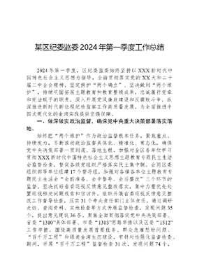 某区纪委监委2024年第一季度工作总结2024年第一季度,区纪委监委始终坚持以XXX新时代中国特色社会主义思想为指导,全面贯彻落实党的XX大和二十届二中全会精神,坚定拥护两个确立、坚决做到两个维护,持续巩固拓展主题教育和教育整顿成果,忠诚履行党章和宪法赋予的职责,深入开展党风廉政建设和反腐败斗争,纵深推进新时代新征程纪检监察工作高质量发展,为全面推进中国式现代化的金湾实践提供坚强保障。一、做深做实政治监督,确保党中央重大决策部署落实落地。始终把两个维护作为政治监督根本任务,聚焦重点、持续发力,不断推动政治监督具体化、精准化、常态化,确保党中央决策部署一贯到底、落地生根。加强对全区各单位学习贯彻XXX新时代中国特色社会主义思想主题教育专题民主生活会监督检查,督促各级党组织严格落实民主集中制。会同区委组织部等单位组建17个督导组,加强对各镇各单位主题教育专题民主生活会会前准备、会中督导、会后整改三个环节的监督。坚决抓好省委巡视反馈意见整改落实,集中力量优先处置巡视移交问题线索和信访件。组织开展省委巡视反馈意见整改工作督导检查,压实31个牵头责任部门主体责任,通过调研走访、查阅资料、实地检查等方式开展监督检查,发现问题35个,提出意见建议36条。聚焦全面贯彻落实党中央决策部署、省委1310具体部署、市委1313思路举措以及区委1312工作举措,围绕高质量发展首要任务、群众急难愁盼问题、百千万工程和绿美金湾生态建设,有针对性强化监督检查。期间,开展百千万工程监督检查31次,发现问题74个,提出意见建议43条;开展绿美金湾生态植树活动中的形式主义突出问题专项监督检查,发现问题15个,提出意见建议3条。二、纵深推进反腐败斗争,坚决铲除腐败滋生的土壤和条件。持续保持惩治腐败高压态势。坚持态度不变、力度不减、重心不偏,继续紧盯重点问题、重点领域、重点对象、新型腐败和隐性腐败。坚持向基层延伸,瞄准教育、就业、医疗等民生领域的痛点难点开展集中整治,着力查处群众身边蝇贪蚁腐。严肃查处红旗镇综合行政执法办公室协管员梁某乾严重违法问题,推动以案为鉴、以案促改、以案促治工作在基层执法领域落地见效,不断增强群众获得感、幸福感、安全感。加大案件查办力度。研究制定《某区纪委监委室组联动监督室组地联合办案协作配合机制暂行办法》,有效整合办案力量,提升办案能力。完善纪检监察专责监督体系,持续推进纪律监督、监察监督、派驻监督、巡察监督统筹衔接常态化制度化。在全市率先探索建立镇纪检监察监督与内部审计监督工作协作机制。充分发挥派驻监督探头作用,运用室组地交叉办案等机制,依规依纪依法开展案件办理工作。持之以恒净化政治生态。强化对重点领域和部门政治生态的分析研判,研究出台《某区纪委监委廉政档案管理制度(试行)》,按一人一档的原则对535名区管干部和32名非区管干部建立了廉政档案。三、持续推进作风建设常态化长效化,筑牢中央八项规定精神堤坝。紧盯形式主义、官僚主义突出问题。研究制定《某区纪委监委关于加强监督推动思想大解放、能力大提升、作风大转变、工作大落实的实施方案》,紧紧围绕区委1312工作举措,深入开展十三大专项行动,以有力监督推动全区上下围绕区委确定的十二个重点领域谋在实处、干在实处、成在实处。按照省、市纪委监委部署,组织区建设局、区发展改革局文可居文库——海量学习资料,手机电脑均可下载www.wenkeju.com等重点职能部门对照新形象工程9类突出问题表象,对2021年以来实施的党建设施、民生、文旅、数字化系统、乡村建设等领域项目开展排查整治,教育引导全区党员干部和公职人员树立正确的权力观、政绩观、事业观,坚决防止半拉子工程面子工程政绩工程。通过听取汇报、座谈交流、查阅资料、实地督导等方式,认真开展农村集体资产清产核资、涉企奖补扶持资金专项监督检查。持续重拳整治享乐主义、奢靡之风突出问题。坚守节点纠治四风,元旦、春节期间,督促全区各级党组织及其一把手牢牢扛起作风建设主体责任,发送廉洁过节提醒4次,转发《新春纪语》系列微视频6期,做到早教育、早提醒、早预防。强化室组地联动,通过四不两直方式,对各镇、各单位节日期间落实中央八项规定精神及安全生产、值班值守等情况开展监督检查62次,层层压实责任,发现问题或隐患26个。严肃查处党员干部和公职人员酒驾醉驾、赌博问题3起,给予党纪政务处分3人。开展会风会纪监督7次,发现22个问题,通过责令立行立改、提醒谈话等方式,督促参会人员严格遵守会风会纪十五个不,以良好的会风促进工作作风转变。四、全面加强党的纪律建设,推动形成遵规守纪的高度自觉。以学习贯彻新修订《中国共产党纪律处分条例》为契机加强纪律教育。认真开展党