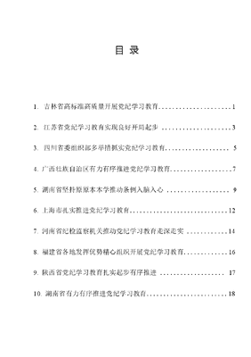 目录1. 吉林省高标准高质量开展党纪学习教育12. 江苏省党纪学习教育实现良好开局起步 ..33. 四川省委组织部多举措抓实党纪学习教育. 54.广西壮族自治区有力有序推进党纪学习教育75.湖南省坚持原原本本学推动条例入脑入心96.上海市扎实推进党纪学习教育..127.河南省纪检监察机关推动党纪学习教育走深走实 148.福建省各地发挥优势精心组织开展党纪学习教育.169.陕西省党纪学习教育扎实起步有序推进 . 1710.湖南省有力有序推进党纪学习教育1811. 江苏省各地各部门扎实开展党纪学习教育..1912.河北省直单位推动党纪学习教育扎实有效开展 .2313. 甘肃省组织系统扎实开展党纪学习教育.2514. 吴忠市推动党纪学习教育走深走实 .2715. 固原市对标对表推进学习教育2816. 石嘴山市扎实推进党纪学习教育深入开展 .2917. 扎赉特旗推动党纪学习教育走深走实 ..3018. 各地检察机关扎实推进党纪学习教育31文可居文库——海量学习资料,手机电脑均可下载www.wenkeju.com吉林省高标准高质量开展党纪学习教育党纪学习教育启动以来,吉林省深入学习贯彻XXXXXX关于党纪学习 教育的重要讲话和重要指示精神,站在深刻领悟两个确立的决定性意义, 坚决做到两个维护的高度,切实把思想和行动统一到党中央部署上来,紧 密结合吉林实际,精心研究谋划,周密组织推进,高标准高质量开展党纪学习教育。一、坚持以上率下,第一时间启动部署中央《关于在全党开展党纪学习教育的通知》印发后,省委高度重视党纪 学习教育工作,坚决扛起政治责任,牢牢把握目标要求,确保全省党纪学习教 育高质量开局起步、高标准扎实推进。4月12日,省委书记景俊海主持召开省委 常委会会议,审议《吉林省党纪学习教育实施方案》,对全省党纪学习教育进 行动员部署。会议强调,要切实把思想和行动统一到XXXXXX重要讲话重 要指示精神上来,把抓好党纪学习教育作为坚定拥护两个确立、坚决做到 两个维护的实际行动,作为纵深推进全面从严治党的重要举措;要突出重 点、把握主线,真正把新修订的《中国共产党纪律处分条例》学懂弄通、学深 学透、学出实效;要把开展党纪学习教育同落实党中央重大决策部署、深化党 的自我革命吉林实践五项行动、抓好党员干部日常教育管理、开展狠抓 落实年活动、整治形式主义为基层减负结合起来,引导广大党员干部始终做 到忠诚干净担当。全省各级党委(党组)迅速传达中央有关精神和省委部署要 求,通过召开党委(党组)会、党的建设工作领导小组会议等方式,进行党纪 学习教育启动部署,指导所属基层党组织采取三会一课、主题党日等方式,对党纪学习教育作出安排。二、选优配强工作力量,精心谋划各项任务组建省委党纪学习教育工作专班,加强统筹协调和调度指导,市县两级党 委按照精简、精干的原则组建工作专班。深入学习领会党中央《通知》和中央 党的建设工作领导小组会议精神,精心制定实施方案;注重体现吉林特色,用 好已有的警示教育会议、廉政讲堂、 新时代e支部、吉林云文可居文库——海量学习资料,手机电脑均可下载www.wenkeju.com党校等 有效载体,巩固和深化党的自我革命吉林实践;注重突出实效性,紧扣党中央《通知》明确的学习要求,融入日常、抓在经常,明确责任分工、完成时限,做到两手抓、两不误、两促进。加强工作指导调度,制发《党纪学习教育重点任务落实情况调度表》,按照五化闭环工作法,对全省《实施方案》进行文可居文库——海量学习资料,手机电脑均可下载www.wenkeju.com分解,明确工作措施、时间进度和责任人,定期开展调度,注重宣传引导,营造浓厚学习氛围。三 、紧扣目标任务,推进学习教育有序开展坚持原原本本学、认认真真悟,省委常委认真学习XXXXXX关于党的 纪律建设的重要
