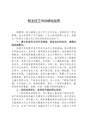 班主任工作总结与反思转眼间,我从事班主任工作已半年有余,其间经历了很多事情,也从中获得了不少经验,工作上也逐渐得心应手。现将这一时间本人班主任工作的具体情况总结如下:一、建立和谐民主的平等制度,营造良好的班风,增强班级的凝聚力。和谐平等是使学生自信参与各项工作的基础,是处理班级各项的出发点,是学生、教师相互信任的基石,也是调动学生积极性,培养班级凝聚力源动力。在这个群体中,老师只不过是领头雁而已,大家都是班级的小主人,我们班级大小事靠的是大家。班规大家讨论制定,执行时,人人都是裁决者,都有发言权,共同监督管理班级事务。这样一来,谁也不愿去违反自己作出的规定,即使犯了规也甘心受罚并力争少犯。在管理过程中,优秀学生犯了规,要严肃处理,差生心理脆弱,本身就有自卑感,又最易犯错,因而处事过程中,更要心平气和地说理教育,要学会用放大镜看他们的优点。及时给予鼓励赞扬,让他们找回自信。平时多走近他们,谈心交流,了解他们的思想,走进他的心灵。扮演好教师、朋友、父母等多重角色,赢得同学们的尊重、信赖,形成—股强大的班级凝聚力。二、组织培养学生,发挥班干部的带头作用。一个班的集体面貌如何,很大程度上是由班干部决定的。班干部对班集体有着以点带面和以面带面的作用,他们是班主任的左右手。所以我认为,唯有慎重地选拔和培养班干部队伍,才能使班主任工作逐渐从繁重走向简单与轻松。因此从学期开学之初,在班干部任命上我就进行了以下改革。大致分三步进行,先是自荐,然后是民主测评,最后是三分钟的任职演讲。选择有能力、肯付出、得到学生认可的人选。同时在日常工作中,不仅让他们为班级管理献计献策,而且大胆放手让他们开展工作,例如班级会议、主题班会、编排座位表、卫生值日、课前准备、等有关工作基本上由以他们为首的几个班干主管,并做到责任到人,各负其责。必要时我就从旁指导,每项工作完成后,都及时找他们来总结,给予肯定和鼓励,这样不仅提高了孩子们的工作热情,同时也提出存在问题及改善措施,使班干部能力得到提高。三、注重批评的技巧,使学生与老师心连心。批评是班级管理工作中必不可少的一个内容。批评的难处常常不在于内容的尖刻,而在于形式的巧妙。为达到既教育好学生,又不伤害师生间的感情的目的。我在批评学生时还是注重了一定技巧的。我提倡个别进行批评,集体批评时最好是只说现象不点名。因五年级的学生都有了很强的自尊心。他们把老师的肯定看作一种精神需要,一种上进的动力。我们应力求满足学生这一心理需要。一般情况下,不要把学生带到人多的地方训斥,更不应动不动就把学生叫到办公室。不在家长面前痛陈学生的不足之处。面对学生家长,应先充分肯定学生的优点,然后委婉带出学生美中不足的地方,紧接着与家长一同商讨教育方案。这样做既不损家长的面子,也调动了家长的教育积极性,更重要的是学生认为老师够朋友,心甘情愿地听从老师的教导。总之,班级管理工作千头万绪,也非一朝—夕的事情。必须用爱心去浇灌,用耐心去说服,用信心去培育,用恒心去管理,要从心灵深处去唤醒学生去感化学生,去激发学生,只有坚持不懈地走下去,我坚信必定会有丰硕的果实。现在的我走过了疲惫,走过了忧伤,相信以后的路会更坦然实在,我还存在着诸多不足,但我会更加努力,不求最好,但求更好!文可居文库——海量学习资料,手机电脑均可下载www.wenkeju.com