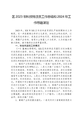 区2023年科技特派员工作总结和2024年工作思路谋划2023年,XX市XX区科技特派员团队严格按照相关工作制度,进一步提高群众科学文化素质,加快农业科技进步,以开展实用技术培训、发展农业科技项目、建设特色农业优势产业、调整产业结构、培育乡土致富人才为抓手,大力实施乡村振兴战略,着力推进农业高质量发展。一、科技特派员工作情况(一)基础工作情况。XX区科技特派员团队切实加强农村实用技术指导、培训,积极推广新品种、新技术。科技特派员团队根据自身特色优势产业现状,在关键季节及时间内组织技术指导服务。今年三月科普活动月、五月科技活动周期间,各团队积极组织农村实用技术培训及新品种、新技术推广运用。1.稻药产业科技服务团队:一是推广优良品种,全区水稻优质稻种植率达到95%以上;二是大力推广水稻工厂化育秧、优化定抛栽培、机插秧、无人机病虫害综合防治、杂交水稻制种无人机授粉、机械化烘干、精量播种、大豆玉米带状复合种植等节本增产新技术;三是在川芎生产的关键季节及时组织服务指导,利用现场会、短训班、田间指导和印发技术资料等形式,开展集中和分散培训指导,主要针对收获后的机械化烘干技术进行示范推广,解决环保污染问题。2.柑橘产业科技服务团队:一是组织技术人员分镇(街道)开展桔桔生产技术培训,特别是对贫困村进行了重点培训,并对标准化生产、科学用药、合理施肥、病虫防绿色防控进行了入户指导;二是加大柑橘新品种、新技术推广力度。3.葡萄产业科技服务团队:一是利用四川省葡萄协同技术推广、新型职业农业培训等项目,采用课堂教学、现场培训、网络培训等方式,邀请四川省农科院园艺所研究员、国家葡萄产业技术体系、成都综合试验站站长刘晓、XX区葡萄产业带头人、土专家杨志明等集中开展实用技术培训;二是持续不断地为种植户提供田间技术指导,只要有种植户反映遇到问题,都会到田间查看原因,找到并解决问题。4.猕猴桃产业团队:一是邀请省上专家到园区、田间开展技术指导;二是组织区域内专家开展技术指导及实用技术培训。5.标准化养殖科技服务团队:一是加强水产标准化、健康养殖宣传,建立水产健康养殖示范点,加强渔业尾水治理的监督、宣传、检查和指导,大力推广池塘浮床水稻种植、微生物制剂和生石灰调水改底、严格落实养殖尾水排放申报许可制度;二是推广水产健康养殖,推广浮床水稻种植,微生物制剂和生石灰调水改底。(二)整合资源,提升产业竞争力。科技特派员团队结合各自优势,整合资源,扩大、规范产业规模、提升品质,增强产业竞争力。一是落实强农惠农政策,利用一切可以利用的条件与资源,广辟资金来源,积极筹措,整合家庭农场、科技入户等项目资金,支持本地专合社扩大经营、服务范围,提升技术水平,推动专业化服务和规模化经营;二是支持大户进行土地的流转,开展规模化、标准化生产。(三)加大品牌培育,规范产业园区、基地建设。各产业科技特派员分团队进一步加强产业品牌培育,加大产业园区、基地建设,规范产业园区、基地标准化。1.稻药产业科技服务团队:一是培育稻药种植大户和专业服务组织:二是进一步推进产业规模化、标准化经营及安全生产。2.柑桔产业科技服务团队:一是协助组团打造柑桔品牌,现有柑桔无公害农产品8个,绿色食品证3个,武阳春・见已作为XXXX柑桔的区域公共品牌。结合XX区本土特色商标彭祖,增报了彭祖寿柑、彭祖寿橘、彭祖三月山三个彭祖系列商标;二是规范柑橘现代产业园区3个,(黄丰镇柑橘产业园区,以晚熟柑桔生产为主,柑桔初加工及乡村旅游融合发展;凤鸣街道柑橘产业园区,以晚熟柑桔生产为主,乡村休闲旅游为辅;李密故里柑橘产业园区,以晚熟柑桔生产为主,生产性服务、批发零售仓储服务、电商服务配套发展);三是通过高接换种、种养循环、有机肥替代化肥、水肥一体化、绿色防控,完成改造老果园5000亩。3.葡萄产业科技服务团队:一是大力推进葡萄现代产业化建设;二是做好品牌培育及品质提升;三是做好产业园区、基地、示范及农产品安全等。截止目前,全区已建成特色葡萄产业基地2.3万余亩,控产后平均亩产1250—1500公斤。4.猕猴桃产业科技服务团队:一是加大猕猴桃产业园区建设;二是做好做好产业园区示范及食品安全等。5.标准化养殖科技服务团队:一是加强养殖安全;二是加大标准化养殖基地建设力度。(四)加大科技宣传力度,做大做强特色优势产业,营造良好的科技下乡、科学种养殖氛围。科技特派员团队结合XX区特色优势产业特性,主要在今年三月的科普活动月、五月的科技活动周期间及在平时下乡、村开展技术指导、培训期间积极宣传:一是宣传三农政策;二是宣传做好种、养殖标准化、规模化、生态化,;三是宣传特色优势产业新品种、新技术运用、推广。二、取得成效(一)2023年,科技特派员服务团队开展相关技术培训50余期,3000多人次,培训乡、村技术干部800余