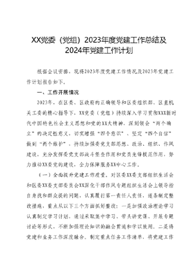 XX党委(党组)2023年度党建工作总结及2024年党建工作计划根据会议安排,现将2023年度党建工作情况及2023年党建工作计划报告如下。一、工作开展情况2023年,在区委、区政府的正确领导和区委组织部、区直机关工委的精心指导下,XX党委(党组)持续深入学习贯彻XXX新时代中国特色社会主义思想和党的XX大精神,深刻领会两个确立的决定性意义,切实增强四个意识、坚定四个自信做到两个维护,持续加强委党支部思想、政治、组织、作风建设,充分发挥委党支部战斗堡垒作用和党员先锋模范作用,努力推动XX委党的建设,全力保障服务XX中心工作。(一)全面提升党建工作质量。对区委XX委支部组织生活会和区委XX委支部委员会XX深化干部作风专题组织生活会上领导指自身找和群众提的问题,认真履行第一责任人责任,逐条制定整改措施,重点从以下三个方面抓好整改:一是加强政治理论学习认真制定学习计划,通过采取集中学习、带头讲党课、开展专题讨论等形式,不断加强理论知识的融会贯通和学以致用。二是将党建和业务工作深度融合。制定重点任务工作清单,将党建工作和中心工作同部署、同落实、同检查,以党建工作高质量发展推进全区XX中心工作更好地服务经济发展大局。三是持续加强干部队伍建设。建立健全《区委XX党支部议事规则》、规范会议工作流程,以作风助推干部队伍建设,不断提升党员干部责任意识、担当意识。(二)夯实思想政治建设根基。始终把加强学习作为提高素质、增长才干、科学决策的重要途径,带头抓好理论学习,提升政治素养,在深刻领悟、全面把握党的创新理论上先学一步、学深一层,走在前列、作出表率。一是持续开展理论学习。坚持将学习XXX新时代中国特色社会主义思想、党的XX大精神、《XXX谈治国理政》、《中国共产党XX工作条例》《中国共产党党和国家机关基层组织工作条例》以及省市区各项决策部署作为第一议题,逢会必学,教育引导党员自觉把政治标准和政治要求内化于心、外化于行,进一步强化理论武装,引导全体党员干部树牢四个意识、坚定四个自信、坚决做到两个维护。衷心拥护两个确立。二是不断拓宽学习载体。充分利用理论中心组、XX办公会、工作例会、支委会、支部党员大会等线下学习方式和学习强国XX省党员干部网络学院线上学习平台,不断拓展学习载体,适时更新学习书目,细化学习内容,做到学有方向、看有内容。2023年以来,共开展理论中心组学习XX次、交流研讨XX次、XX委员(扩大)会议XX次,通过线上线下相结合的学习方式,积极引导全体党员干部及时跟进学习XXX总XX指示批示精神和各级政策方针,进一步提高机关干部抓XX工作的理论基础。三是抓学习教育常态化。坚持把学习贯彻XXX新时代中国特色社会主义思想作为政治建设的根本任务,完善支部学习、集中宣讲、个人自学等制度,把政治理论学习贯穿于履职全过程,切实推动解决一大批群众、XX最关心最直接最现实的问题。结合XXXX系统大走访,持续推进XX党委(党组)为群众办实事活动。(三)有效履行主体责任职责。一是认真履职尽责。始终坚持XX抓、抓XX,全面抓、抓全面,带头履行好抓党建工作第一责任人职责,其他班子成员履行一岗双责,共同耕好党建责任田,形成了职责明确、齐抓共管的工作格局。全年共主持召开支委会XX次,全体党员大会XX次,给全体党员上党课X次。不断提高支部全体党员干部的思想政治素质,把旗帜鲜明讲政治放在首位,教育引导党员干部衷心拥护两个确立、树牢四个意识、坚定四个自信,做到两个维护。二是强化党员管理。严格党员发展及管理工作,年内对XX名入党积极分子按程序转入发展对象阶段,接收XX人入党申请。开展谈心谈话XX次,及时了解党员干部思想、学习、工作和生活情况,落实全体党员签订中国共产党党员不信教参教承诺书、个人无涉黑涉恶问题承诺书等,进一步规范党员干部管理。三是严肃政治生活严格贯彻执行《关于新形势下党内政治生活的若干准则》,落实科级以上党员领导干部参加双重组织生活制度,严格落实三会一课、组织生活会、民主评议党员等制度,持续抓好主题党日活动,不断推动党内政治生活严起来、实起来。2023年,开展主题党日活动XX次,为XX名党员举行了过政治生日活动。(四)不断抓牢重点工作任务。一是夯实党建基础,筑牢执政之基。坚持把党建工作与区委XX委中心工作同研究、同安排、同考核。先后召开XX办公会议XX,专题研究党建工作XX次,严格落实党支部联系点制度。二是持续深化党支部标准化建设。坚持以党支部标准化建设促全面规范,以XX党委(党组)为群众办实事实践活动为着力点,比学赶超,通过XX认领,切实解决群众的急难愁盼问题,确保把群众的好事办实、实事办好着力打造叫得响、立得住、群众认可的党支部,持之以恒提升党建工作质量