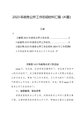 2023年政务公开工作总结材料汇编(4篇)目录1.卫健委2023年政务公开工作总结22.经信局2023年政务公开工作总结.53.统计局2023年政务公开工作总结和2024年工作思路84.市场监管局2023年政务公开工作总结17卫健委2023年政务公开工作总结xxxx年,在区委、区政府的坚强领导下,在区电子政务中心的关怀指导下,区卫健委紧紧围绕政务公开工作要点和重点工作任务分工,秉持以公开为常态,不公开为例外的原则,不断深化公开内容,各项工作更加规范、有效。现将xxxx年度政务公开工作总结如下:一、加强重视,强化领导委高度重视政务公开工作,把做好政务公开列入重要议事日程。为确保高效抓好政务公开工作,明确由分管办公室的副主任负责,做到领导、机构、人员三到位。根据工作要求,注重抓好调度和跟进培训工作,通过不定时召开具体工作人员碰头会议的形式,及时完成公开要求。二、加强制度,规范公开以制度为抓手,拓宽公开范围,细化公开内容,规范公开渠道,使政务公开工作制度化、科学化、规范化。一是不断完善政务公开规章制度,建立健全主动公开,依申请公开、保密审查、统计报送等多项政务公开基本工作制度。二是进一步健全信息发布制度,为形成高效畅通的信息公开渠道,确保本部门信息发布的及时性、准确性,健全宣传和信息报送管理办法等制度,建立突发事件应急处理机制及舆情工作机制,做到用制度规范政务公开工作,提高政务公开工作水平。三、公开渠道、增强实效一是完善信息公开发布。及时发布工作职能、权责清单、机构设置、办公地址、办公时间、联系方式、负责人姓名等信息,构建和完善重大行政决策预公开机制,对重大决策实行公众意见征集和反馈,为决策部门合理制定政策提供参考依据,提高部门文件质量,所有公开的政策文件均列有文号、成文日期、发布时间、有效性等信息,并提供PDF和WORD文本下载功能。二是加大政策文件宣传解读和社会热点回应。按照省市区政务公开工作要求,采取文字解读、图片解读、媒体解读、召开新闻发布会等多种形式,增强解读回应效果,对深化医改等重点工作进行宣传解读,深入解读政策制定背景、起草过程、工作目标、主要内容、创新举措和下一步工作考虑,提高群众知晓率。xxxx年主动公开信息xxx条。其中,政策法规类信息xx条,政策解读类信息xx条,规划计划类信息xx条,行政权力运行类信息xx条,财政资金、三公经费类信息xxx条,新闻发布会类信息x条,重点领域基本医疗卫生类信息xx条,均能做到第一时间发布。三是加强跟踪评估,推进基层政务公开标准化规范化建设根据《xx省人民政府办公厅关于印发xx省全面推进基层政务公开标准化规范化工作实施方案的通知》、《xx省卫生健康领域基层政务公开事项指引目录(试行)》文件通知,及时主动向上级卫生健康行政部门请示汇报基层政务公开目录编制情况,并按照任务分工完善目录及时上传信息。四是重视培训学习,提高政务公开工作水平。将新修订的《政府信息公开条例》作为重要内容进行专题学习贯彻,积极参加各类业务培训,进一步提升信息公开人员对信息公开理解、认识、衔接、运用和落实能力、为高标准、高质量完成政府信息公开工作打下坚实基础。四、xxxx年工作打算一是持续开展规范性文件工作。进一步提高规范性文件公开质量,严把文件公开关,规范性文件做到文号、成文日期、发布时间、有效性等信息齐全,并提供全文下载。二是进一步强化政策解读。做好重大政策解读工作,坚持政策解读方案和解读材料同步组织、同步审签、同步部署,利用各种形式,加大解读力度,尝试用群众听得懂的语言看得到方式公开信息。三是进一步抓好重点领域信息公开。按照规定对行政事项进一步公开办事程序、办事标准、办事结果,不断增强工作透明度,提升办事群众满意度。积极借鉴和学习省内其它地市医疗服务信息公开工作的经验和做法,全面系统梳理我委各类服务信息,及时规范全面公开重点领域信息。经信局2023年政务公开工作总结xxxx年,县经信局在县委、县政府的领导和县政务公开办指导下,推进政务公开工作取得一定实效。现将年度政务公开工作总结如下:一、工作开展情况全年共发布主动公开政府信息xxx条。在主动公开的信息中,政务动态类信息内容主要包括:政策法规、规划计划、机构设置、人事信息、财务信息、年度工作、政策解读等;业务管理类信息内容主要包括:建议提案办事、领导活动、回应关切、双随机一公开、回应关切等。一是落实责任,政府信息管理进一步细化。健全了局政务公开领导机制。调整充实了局政务信息公开工作人员,明确了分管领导,由办公室统筹协调做好局政务公开工作。健全了局政府信息发布的保密审查机制,明确审查程序和责任人,做到了无泄