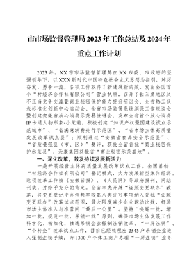 市市场监督管理局2023年工作总结及2024年重点工作计划2023年,XX市市场监督管理局在XX市委、市政府的坚强领导下,以XXX新时代中国特色社会主义思想为指引,踔厉奋发,勇争一流,各项工作取得了新进展新成效。发出全国首个村经济合作社有限公司营业执照,召开了长三角地区反不正当竞争交流暨商业秘密保护能力提升研讨会、全省热工仪表标准化创新中心启动会、全省市场监管系统消保工作座谈会暨创建安徽省放心消费示范县推进会,发布全省首个放心消费IP卡通人物形象-小茉莉,积极创建知识产权强国建设试点示范城市、省满意消费先行示范区、省市场主体高质量发展改革试点县;顺利通过安徽省食品安全示范县、省质量强县(市、区)复评,获批全省首批商业秘密保护示范县,天康集团获批省商业秘密示范基地。一、深化改革,激发持续发展新活力一是开展经营主体高质量发展改革试点工作。全国首创 村经济合作社有限公司登记模式,大力发展新型集体经济。这项改革工作被《安徽日报》、《人民网》等政府报刊、网站刊载,并给予充分的肯定。全省率先开展证照变更联办改革,将变更登记中办件频率较高八类许可事项纳入首批证照变更联办改革试点范围,最大限度减少企业跑动次数,打通市场主体准入与准营间最后一公里。坚持唤醒一批,增加一批,规范一批,吊销一批原则,确保市场主体发展工作科学化、精细化,推进吊销企业强制注销改革、一屏注销、个转企改革试点工作,目前已经梳理出2345户吊销企业进入强制注销手续,为1300户个体工商户办理一屏注销业务办理12户个转企业务。全年办理各类市场主体设立登记10891户,其中企业设立登记4008户,个体工商户开业登记6837户,农民专业合作社设立登记46户,在稳增量、优存量的同时、更加注重提质量,有效激发持续发展新动力。二是纵深推进双随机一公开信用监管。全面推行一业一查部门联合抽查模式,共建立一业一查部门联查任务181项,帮助市场经营主体信用修复630条。探索行政处罚决定书、信用修复告知书两书同送工作模式,完善随机抽查一单两库。创新视频连线、授权代办等企业年报模式,对年报工作分类管理,推行差异化帮扶指导,各类市场经营主体报率达到98%以上,均在全省排名前列,得到了上级部门及广大市场主体的肯定。全面落实公平竞争审查制度,全年共清理存量政策措施168件,审查增量政策措施112件,不予通过政策措施5件,修改政策措施4件。查处不正当竞争案件4件,罚没款XX万元。三是全面推进满意消费先行示范区建设。健全完整的消费投诉信息公示制度体系,开发建成安徽首个放心消费智慧管理数治云平台,创新投诉举报预警快报机制。制定放心消费示范区创建地方标准,实施放心消费示范市创建活动,培育示范点,扩大影响面,进一步提振消费信心;加强消费维权服务站建设,实施线下购物无理由退货承诺单位倍增计划,全年发展新增线下无理由退货单位300家,申报XX市级放心消费示范单位31家,滁州市级放心消费示范单位9家、示范行业和示范街区各1家、无理由退货示范单位4家。全年共接受咨询和来访235人次;受理并办结消费者投诉举报咨询2671件,其中投诉2005件、举报658件、咨询8件。已新发展ODR企业15家,转ODR企业自行和解411件。为消费者挽回经济损失约89万元。二、守好底线,三品一特安全更加牢固一是食品安全监管全面加强。推动食品安全两个责任落实,顺利完成县、乡、村三级分层分级认领工作,摸排食品生产经营主体8742户,数量为滁州各县市区之首。完成责任平台一、二、三季度平台督导录入率100%、督导问题整改率100%。开展食安守护专项行动,出动执法检查人员2060人次,检查各环节食品生产经营者1675户次,发现风险隐患260个,立案查处215起,结案186起,罚没金额XX万元。开展食品监督抽检1529批次,食用农产品共抽检527批次,合格505批次,不合格22批次。深化制止餐饮浪费专项行动,指导检查餐饮单位落实光盘行动2893家次,推广反餐饮浪费简案快办执法模式,及时公布典型案例,通过简易程序处罚51家。创新工作举措,依托新时代文明实践火流者志愿者平台,广泛实施你光盘我赠券活动,建立正向激励机制,发挥消费者和商户的主动性,有效制止餐饮浪费。开展食品生产企业和包保干部落实两个责任法规知识竞赛,帮扶网络订餐服务经营单位开通厨房直播,创建两个责任及食药安全示范街区,先后投入94.5万元经费,创建以我市千秋街道园林路为中心辐射周边的示范街(区),形成点、线、面相结合的多层次、全方位、全业态的食品安全示范群体。二是药品安全保障水平有效提升。以医疗器械质量安全专项整治行动、药品安全巩固提升行动方案为主线,结合日常监督检查、开