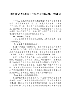 区民政局2023年工作总结及2024年工作计划今年来,区民政局紧紧围绕XXXXXX关于民政工作重要指示、批示精神和中央、省、市、区重大决策部署,以确保兜住底、兜准底、兜好底为工作目标,着力保障和改善民生,提升服务水平和依法行政能力,加强社会管理和社会服务,在建设核心引领区和首善之区中展现了民政担当,现将工作开展情况及后段工作重点汇报如下:一、2023年工作成效今年,我们全局干部职工同心同德,立足民政职责,取得了较好的成效。(一)基本民生保障持续加强。1.进一步提高了保障标准。将城乡低保标准分别提高到XX元/月和XX元/年,特困人员基本生活标准提高到845元/月均达到或超过省市实事任务标准;孤儿生活补助标准提高到XX元/月,残疾人两项补贴标准分别提高到80元/月。2.进一步加大了保障力度。今年,共通过一卡通发放城乡低保、特困供养、临时救助、残疾人两项补贴、慈善救助、孤儿和事实无人抚养儿童生活补助等民生保障资金XX万元。3.进一步加强了底线工作。每月以四不两直方式对全区11家养老机构安全生产工作开展情况进行全面督查,现场指出了存在的问题并限期整改,并针对养老领域的金融诈骗和非法集资加强了宣传防范,确保了老年人生命财产安全。(二)基层社会治理持续深化。1.大力提升基层治理服务水平。一是进一步规范了基层事务事项。出台了XX区基层群众性自治组织《依法自治事项指导目录》《依法协助政府工作事项指导目录》《活动场所挂牌指导目录》和《不应由基层群众性自治组织出具证明事项指导目录》;二是加强社区工作者能力建设。开展了社区工作者业务培训264人次,根据适岗要求对85名社区专职工作者进行了调整;三是进一步激发社区工作者工作热情。按照三岗十六级薪酬调整社区专职工作者岗位津贴,对社区(村)进行了按季度综合绩效考评,召开了2023年度社区(村)工作者大会评选了网格之星。2.扎实开展未成年人保护工作。一是建立保护机制。出台了《XX区未成年人保护工作实施方案》;开展未成年人保护宣传工作26场,发放助学礼包300份;二是开展部门联动。与区委政法委联合开展利剑护蕾﹒2023未成年人预防性侵专项行动,夜间巡查暗访53次;在全区各学校开展阳光护蕾防性侵警示教育,加强了问题少年矫正工作;三是做好源头防护。对4名收养儿童家庭进行收养能力评估。3.切实规范管理社会组织。引导社会组织参与社会治理,加强了社会组织登记管理,今年共批准成立社会组织、民非组织81家,办理变更24家,注销登记6家,完成年度检查350家。(三)基础社会服务持续优化。1.养老服务高质量发展。一是坚持大力扶持养老服务企业发展。为全区8家社会力量运营的养老机构与3家社区老年食堂发放了社会办养老服务专项补贴XX万元;二是做好社会困难老年人帮扶。投入XX万元,为222户特殊困难老年人进行了居家适老化改造;三是贯彻落实老年人福利政策。为1700名老年人发放经济困难失能半失能老年人基本养老服务补贴、高龄津贴、百岁老人长寿金各项补贴政策共计XX万元;四是关爱孤寡老人。投入XX万元,为分散供养的特困供养老人(孤寡老人)提供家政服务、精神慰藉、生活照料等社会工作服务,及时帮他们解决生活中遇到的困难,使我区困难老年人实现了老有所依、老有所养、老有所乐。2.婚姻登记优质高效。一是规范婚姻登记服务。以创群众满意的窗口单位为目标,登记员全部做到着装整齐、持证上岗、挂牌办公、文明用语、礼貌待人、行为规范、服务周到;二是坚持依法登记。截止到10月31日,共办理结婚登记3565对,补发登记证书932本,办理离婚申请登记3458对,办理冷静期后离婚登记1649对,出具婚姻档案证明7000余份,登记合格率达到100%;三是做好婚姻档案信息化建设。完成历史婚姻档案电子化录入20万份。3.殡葬服务事业快速发展。一是做好墓地供应保障。投入XX万元,在白鹤陵园新建了一片墓地,占地1800平方米,可容纳墓穴2000个;二是推进节地生态安葬。增加投入X万元,全面完善了骨灰楼配套设施建设,为明年正式启用骨灰楼奠定了基础。(四)中心工作落实落细。1.全力推动乡村振兴战略实施。开展监测户排查,对符合条件的817人给予了低保救助、13人给予了特困供养救助,12人纳入低保边缘家庭动态监测,开展了社会救助兜底回头看,做到了应保尽保、应退尽退。2.全面抓实重点民生实事。一是提高标准。从今年1月起,残疾人两项补贴标准提高到XX元/人/月、孤儿基本生活保障标准达到XX元/人/月、城乡低保标准分别达到XX元/月和XX元/年,均已达到实事任务要求;二是改善特困老人供养环境。投入XX万元,对郭镇敬老院进行了提质改造;三是做好社会困难老年人帮扶。投入XX万元,为222户特殊困难老年人进行了居家适老化改造。3.全面推进殡葬秩序整治工