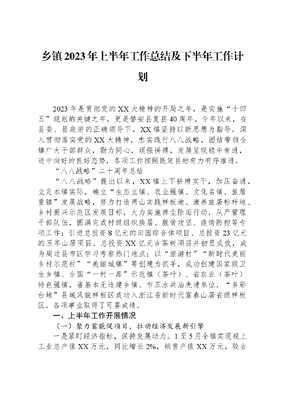 乡镇2023年上半年工作总结及下半年工作计划2023年是贯彻党的XX大精神的开局之年,是实施十四五规划的关键之年,更是磐安县复县40周年。今年以来,在县委、县政府的正确领导下,XX镇坚持以新思想为指导,深入贯彻落实党的XX大精神,忠实践行八八战略,团结带领全镇广大干部群众,勠力同心,顽强拼搏,发展呈现稳中有进,进中向好的良好态势,各项工作按照既定目标有力有序推进。八八战略二十周年总结八八战略提出以来,XX镇上下拼搏实干,加压奋进,立足本镇实际,确立生态立镇、农业强镇、文化名镇、旅居重镇发展战略,努力打造两山实践样板地、康养旅居标杆地、乡村振兴示范区发展目标,大力实施掸尘除垢行动,从严管理干部队伍,圆满完成村级组织换届、脱贫攻坚、疫情防控等专项工作;引进总投资8亿元的田园综合体项目、总投资23亿元的玉岑山居项目、总投资XX亿元古茶树项目并初显成效,成为周边县市区学习考察热门地点;以旅游村新时代美丽乡村示范村美丽城镇等创建为抓手,成功创建国家级卫生乡镇、全国一村一品示范镇(茶叶)、省农业(茶叶)特色强镇,省基本无违建乡镇、市五水共治先进单位,多彩台地县域风貌样板区成功入浙江省新时代富春山居省级样板区,各项事业取得了可喜成绩。一、上半年工作开展情况(一)聚力蓄能促项目,拉动经济发展新引擎一是紧盯经济指标,保持发展动力。1至5月全镇实现规上工业总产值XX万元,同比增长2%,销售产值XX万元,较去年同期增长3%;固定资产投资完成XX万元,同比增长XX%。完成财政收入XX万元,同比增长XX%。二是聚焦项目建设,打响康养品牌。XX镇紧密围绕康养旅居标杆地建设目标,全力服务保障玉岑山居和田园综合体两大项目,创新发展露营经济。玉岑山居项目新增投资XX万元,完成3#村落95%以上别墅主体建设,完成排水排污等配套设施30%,完成1#2#酒店装修初步设计,完成3#4#村落道路毛路建设。五一期间,民宿度假区日均订房量维持在40栋以上,吸引杭州、上海、宁波等外地游客3000余人次;田园综合体项目完成水稻种植2900余亩,项目完成验收入库;仰望星空露营基地作为吴宁-XX共建结对的龙头项目今年新增投资XX万元,新建了水上乐园、丛林穿越、多彩滑草等8个游乐项目,初步完成多功能露营基地打造,并于4月26日成功举办露营节活动和高海拔山区露营经济协商研讨会。三是着眼文化基础,发展文旅产业。通过讲述《A在浙江》的封面故事,实施宋韵文化传世工程,深入挖掘茶文化底蕴,提炼形成以茶立德、以茶励志、以茶促廉文化内涵,打造红色教育基地,争创省委党校干部教育现场教学基地。同时,创新公共文化服务形式和内容,在古茶场、中华舞龙故乡景区等地,发挥第二课堂作用,开展茶艺拓印点茶等研学体验活动,采取茶文化与研学文化相融合的发展模式,建立特色茶文化研学基地。(二)服务民生不止步,满足人民群众新期待一是千塘百库整治成效显著。上半年汝牛坞等7座山塘6月底前全面完成除险加固工程,一方面提升汛期防洪能力,一方面实行山塘蓄水,有效缓解我镇灌溉用水紧张的问题。二是农村公路改造建设持续推进。方镜线改建工程自4月21日动员会召开以来,组建工作专班合力推进,于清明前全面完成涉及的15户36穴坟墓搬迁工作,方镜线XX段红线内87.49亩土地已完成丈量并同步开展政策处理工作。今年我镇计划完成农村道路白改黑3条(岭口—新艳,中心街隔水路段,西坑畈—小溪头),新建联村公路1条(岭口马家坞—大田门),完成道路大中修1条(新艳—上蒋),目前所有路段均完成设计,西坑畈—小溪头白改黑已完成。三是养老服务水平不断提升。投资XX万元完成XX敬老院院内停车位(休息区)、不锈钢护栏、食堂、无障碍休息区、主楼1-3楼走廊扶手、一楼房间卫生间、无障碍柜台、应急辅具、信息无障碍辅具等9项内容的无障碍改造。四是农村饮用水提质工程扎实开展。10个行政村的1750余户农户的一户一表改造工作,政策处理和农户自筹资金费用上缴于4月底前全面完成。林宅村、向头村、西坑畈、月坑村四个村已完成一户一表安装,珍溪村、佳村正在施工中,预计10月份全面完成全镇各村一户一表安装工作。五是惠民资金及时发放。上半年共救助临时困难群众6人,发放临时救助资金XX元,保障了困难群众的基本生活。新增低保8户16人,发放补助金XX万元。春节慰问活动期间走访了全镇60周岁以上退役士兵182人人,发放慰问金XX元。(三)多措并举抓治理,打造平安XX新格局一是积极化解矛盾纠纷。半年来,全镇共解决疑难纠纷起涉案调解金额XX多万元,涉及民工32人,解决民工工资拖欠XX余万元。办结信访案件43起,其中领导信箱3起、来信信访7起、便民代办33起。二是全力抓好安全生产百日攻坚行动。行动开展以来,率先建立安全生产责任网格,明确职责分工,