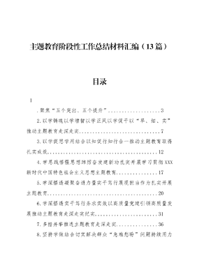 主题教育阶段性工作总结材料汇编(13篇)目录1.聚焦五个突出、五个提升.32.以学铸魂以学增智以学正风以学促干以早、细、实推动主题教育走深走实73.以学促思学用结合以知促行知行合一推动主题教育取得扎实成效..124.学思践悟强思想踔厉奋发建新功扎实开展学习贯彻XXX新时代中国特色社会主义思想主题教育175.学深悟透凝聚奋进力量实干笃行展现担当作为扎实开展主题教育..206.学深悟透实干笃行务求实效以高质量党建引领高质量发展推动主题教育走深走实纪实..317.多措并举推进主题教育走深走实368.坚持学做结合切实解决群众急难愁盼问题持续用力推动主题教育深入扎实开展.429.履行双重责任,一体推进主题教育走深走实为高质量发展继续走在前列凝聚组织力量.4510.扎实开展主题教育团结动员全市职工为推进xx振兴建功立业.5111.扎实高效推进主题教育走深走实(集团公司)..5512.学思想破难题促发展着力推进主题教育提质增效5913.走好新时代红色育人路(高校)62聚焦五个突出、五个提升自学习贯彻XXX新时代中国特色社会主义思想主题教育开展以来,xx党委坚决贯彻落实党中央、xx省委的部署要求,在xx省委主题教育第xx巡回指导组的指导下,坚持高站位部署安排、高标准组织实施、高质量推进落实,在学习贯彻XXX新时代中国特色社会主义思想上努力走在前、做表率,在推动高质量发展上积极争当先行者和排头兵。坚持高站位部署,确保主题教育深入开展、走深走实。牢牢把握学思想、强党性、重实践、建新功总要求,xx党委紧紧锚定坚持学思用贯通、知信行统一的根本任务,以xx省最大国有企业必须走在全省主题教育前列的高站位,抓好顶层设计,确保主题教育深入开展、高效推进。按照规定动作守正、自选动作创新,xx党委统筹谋划学习培训、中心组专题研讨、调查研究等举措,各项工作一体推进、全面开展。xx建立两级党委理论学习中心组学习、基层党支部三会一课学习、党建云课堂党员学习的三级学习体系,切实在深学细悟中锤炼党性、强化忠诚。截至目前,xx两级党委理论学习中心组开展专题学习研讨xx余次,xxxx个基层党支部依托三会一课开展学习,xxxxx余名党员参与党建云课堂学习。xx领导班子成员承担了发挥区位调整后发优势、完善技术创新体制机制等x个重点课题,从五一节期间开始深入基层调研。目前,xx各级领导干部共确定调研课题xxx项,开展调研xxxx余人次。此外,xx还结合在全集团开展的学习贯彻党的XX大精神百千万宣讲活动(百名党员干部、先进典型带头宣讲,组织上千次党的XX大精神宣讲场次,覆盖数万名党员开展学习),把宣讲作为开展主题教育的重要抓手,营造了浓厚的主题教育学习宣传氛围。坚持高标准组织,确保实现五个突出、五个提升目标xx党委聚焦主题教育的目标要求,结合企业面临的新形势、新任务、新要求,把主题教育贯穿到集团转型升级和高质量发展全过程,高标准设定五个突出、五个提升的目标。突出以XXX新时代中国特色社会主义思想凝心铸魂,提升政治忠诚度。xx全面系统学习领会XXX新时代中国特色社会主义思想的科学体系、核心要义、实践要求,增强忠诚捍卫两个确立的政治自觉、思想自觉、行动自觉。突出以新发展理念引领高端化、智能化、绿色化转型升级提升发展高质量。按照高端化、智能化、绿色化发展方向,xx使主题教育成为激发干事创业活力、增强攻坚克难本领的新动能,切实把学习成果转化为推动xx高质量发展的实干效果。突出以研发投入三年上、五年强专项行动推进科技创新、机制创新,提升价值创造力。xx深入实施创新驱动发展战略、人才强企战略,将先进技术成果转化为降本增效、智能制造、绿色低碳的具体应用,在用活机制中激发干部队伍的创新意识、创新勇气和创新作为,不断释放创新创效活力。突出以解决急难愁盼问题为重点,为职工群众办实事办好事,提升职工获得感。xx深化开展我为群众办实事实践活动,把为职工办实事、解难题作为主题教育的重要内容,持续提升职工队伍向心力、凝聚力、战斗力。突出以党的自我革命锤炼忠诚干净担当的政治品格,提升干部精气神。xx以刀刃向内的自我革命精神,着