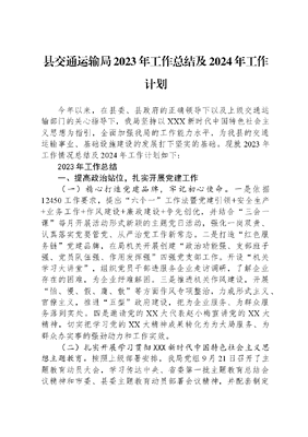 县交通运输局2023年工作总结及2024年工作计划今年以来,在县委、县政府的正确领导下以及上级交通运输部门的关心指导下,我局坚持以XXX新时代中国特色社会主义思想为指引,全面加强我局的工作能力水平,为我县的交通运输事业、基础设施建设的发展打下坚实的基础。现就2023年工作情况总结及2024年工作计划如下:2023年工作总结一、提高政治站位,扎实开展党建工作(一)精心打造党建品牌,牢记初心使命。一是依据12450工作要求,提出六个一工作法暨党建引领+安全生产+业务工作+作风建设+廉政建设+争先创优,并结合三会一课每月开展活动形式新颖的主题党日活动,强化一岗双责、认真落实党要管党、从严治党工作新常态。二是打造红色服务链党建品牌,在局机关开展创建政治功能强、支部班子强、党员队伍强、作用发挥强四强党支部工作。开设机关学习大讲堂,组织党员干部进服务企业走访调研,了解企业存在的困难,为企业纾难解困。三是推进机关作风建设,开展怕、慢、假、庸、散等方面作风专项整治,力戒形式主义、官僚主义,推进五型政府建设,把为企业服务、为群众服务落到实处。四是邀请党的XX大代表赵小梅宣讲党的XX大精神,切实把学习党的XX大精神成果转化为为大局服务、为群众办实事的强劲动力和工作实效。(二)扎实开展学习贯彻XXX新时代中国特色社会主义思想主题教育。按照上级部署安排,我局党组9月21日召开了主题教育动员大会,学习传达中央、省委第一批主题教育总结会议精神和市委、县委主题教育动员部署会议精神,并配套制定实施方案和学习计划,组织党员学习党的XX大报告、《XXX新时代中国特色社会主义思想专题摘编》、《XXX著作选读》上下卷,并做好读书笔记。(三)把控意识形态工作,做好阵地建设。一是定期研判、通报意识形态领域情况,坚持每年至少两次研究意识形态工作,适时在党员大会上通报意识形态领域情况,统一思想认识,明确工作方向。二是严格把关宣传关口,继续严格落实上级关于宣传工作的整体思路,加强对重要敏感信息的监督管理。对于确定需要对外发布的内容,严格按照三审制进行审核把关。三是做好宣传工作,截至目前我局向江西文明网大江网投送新闻稿14件、向德安生活投送宣传视频?组、向XX市交通运输局投送新闻稿90余件,在重大节假日向群众发放宣传册4000余份、悬挂宣传条幅40余条、张贴宣传海报30余份。四是建立局读书角,在全局营造热爱学习、善于思考的良好氛围,树立每个党员就是一面旗帜,把党员思想统一到学习贯彻落实党的XX大精神上来。二、科学全面谋划,夯实交通项目建设基础(一)四好农村路建设。一是开展农村公路建设15条,总投资总量约6亿元。完成宝塔至梅棠、磨吴公路南田至夏家、高丰至塘山、爱民柏树村等4条县道升级改造项目,总里程18.1公里;完成吴山红桥至料场大中修、宝山至永丰大中修、塘山至张坑大中修项目13.2公里;完成双车道项目里程3.7公里,完成车义公路3.3公里的道路白改黑工程,建设北四路东延项目里程3.5公里,建设河东大道二期里程3公里。二是我局在2023年提前一年超额完成XX市《创建四好农村路示范市三年行动方案》下达我县的任务,实现全县所有乡镇通三级路100%,县道三级及以上等级公路比例达76.5%,行政村通双车道比例达71.6%。(二)公路规划工作。一是配合县政协对磨乌公路、S304德白路丰林至吴山段进行调研,形成调研报告,对提升道路环境和改善交通压力提出科学合理建议,为我县强工兴旅战略提供交通基础保障。二是将县乡道建设规划纳入国土空间规划,和自然资源局对接,将县、乡道的拓宽建设纳入国土空间规划项目库,为今后十年的建设提供规划依据。三是全力对接德武高速项目,项目纳入XX市三大攻坚行动基础设施(交通)重大项目清单,计划2024年12月开工。我县成立由政府常务副县长担任组长,县人大常委会副主任担任副组长的工作专班,协调项目前期手续办理、项目建设模式,全力推动项目尽快开工建设。(三)落实农村公路养护工作。一是为落实农村公路养护体制改革,前往赣州寻乌县和章贡区学习农村养护模式,拟定了《县农村公路养护管理政府购买服务实施方案》,引入市场竞争机制,将农村公路养护管理向社会购买服务,实行管干分离。二是建立农村公路养护管理考评机制,对县乡道养护单位和各乡(镇)农村公路养护机构养护情况进行考核并通报考核情况。列入养护的农村公路共164.67公里,其中县道116.369公里、乡道48.3公里,养护费用概算89.14万元。三是县农村公路养护管理服务事宜,已挂网公开政府采购,将县农村公路日常养护工作步入正轨。(四)安全隐患排查工作。一是联合道路交通安全专业委员会排查县道安全隐患,下达整改函,按照县道安委对农村公路存在安全隐患的排查的函,及时对存在安
