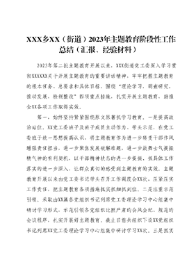 XXX乡XX(街道)2023年主题教育阶段性工作总结(汇报、经验材料)2023年第二批主题教育开展以来,XXX街道党工委深入学习贯彻XXXXXX关于开展主题教育的重要讲话精神,牢牢把握主题教育的根本任务、总要求和具体目标,围绕理论学习,调查研究,推动发展,检视整改四项重点措施,扎实开展主题教育,助推全XX各项工作取得实效。第一,始终坚持紧紧围绕原文原著抓学习教育。一是提高政治站位。XX党工委班子及班子成员主动作为、带头示范,在党工委班子统一思想提高认识,将主题教育作为进一步转变干部作风增强责任担当,进一步聚焦发展破解难题,进一步鼓舞士气提振精气神的有利契机,以干部精神状态的进一步提振、抓具体工作落实的进一步深入,让群众真切的感受到主题教育的实效。主题教育开展以来由党工委书记带头召开工作调度会XX次,压紧压实工作责任,把主题教育各项措施抓实抓细抓到位。二是注重示范引领。采取由XX属各党组织书记列席党工委理论学习中心组集中研讨学习形式,示范引领各党组织比照严肃的会风会纪、规范的会议程序,扎实开展好主题教育。截止目前共组织下设XX党组织书记列席XX党工委理论学习中心组集中研讨学习XX次。三是抓实集中研讨。在领学过程中采取原原本本学、举一反三谈、结合实际悟的方式边学、边谈、边悟,摒弃领学提纲挈领、浅尝辄止的倾向,使学习更加贴切生动、更加通俗易懂。在重点发言过程中要求结合自身工作职责、推进情况、短板问题,围绕XXX主题,谈职责、谈体会、谈措施,达到增强党性、提高能力、改进作风、推动工作的效果。现已组织XX党工委中心组学习共计XX次。各基层党支部通过三会一课、主题党日等形式开展学习共计XX次。第二,始终坚持紧紧围绕问题导向抓调查研究。一是聚焦工作短板精准选题。结合职能职责,针对乡XX振兴、农业产业结构调整、XX级集体经济发展等XXX街道重点难点工作中存在的问题和短板,确定调研主题,明确领题人。截止目前已确定调研主题XXX个。二是深入工作一线全面调研。XX党工委班子成员结合乡XX振兴、分管工作、挂XX工作,每周到XX(社区)蹲点不少于XX个工作日,深入了解民情、掌握实情,拿出破解难题的实招、硬招,推动党中央、省委、市委、区委决策部署在XXX街道落实落地落细,使调研的过程成为加深对党的创新理论领悟的过程,成为保持同人民群众血肉联系的过程,成为推动XXX街道事业发展的过程。三是力戒形式主义防止走过场。调查研究中不硬性要求召开座谈会、填报材料,不得增加XX级负担,将调查研究贯穿于平时工作开展过程中,奔着问题去、向着困难攻,确保形成切实可行的调研成果,并转化为解决问题的具体行动,在调研过程中,已共计为群众办实事XX件,解决问题XX件。第三,始终坚持紧紧围绕工作差距抓检视问题。一是紧扣担当作为检视问题找差距。按照XXX要求,把自身摆进去,由党工委书记带头查摆问题、认领差距,力求把问题找准查实,把根源剖深析透。二是紧扣工作成效检视问题找差距。XX党工委班子成员结合分管工作落实情况和落实成效,真正做到把职能职责摆进去针对工作中的短板和具体问题,实事求是的检视自身差距,深刻剖析问题产生的原因,进一步明确努力方向,制定整改措施。三是紧扣基层群众检视问题找差距。主题教育开展以来,XXX街道党工委通过设置意见箱,并召集全XX党员干部、各XX(社区)两委成员、党员群众代表等召开征求意见座谈会,充分听取基层党员干部群众对领导班子、领导干部存在问题的反映,对改进作风、改进工作的意见建议。同时,向相关上级部门发函征求意见建议,主动认领上级反馈的各种问题和意见,做到对征求到的意见建议不回避不过筛。截止目前,共收集到群众意见XXX条,梳理对班子意见XXX条、班子成员意见XXX条。第三,始终坚持紧紧围绕为民服务抓整改落实。一是聚焦乡XX振兴着力改。坚持以乡XX振兴工作统揽XXX街道经济社会发展全局,着力查找和解决XX面临的突出问题,扎实推进乡XX振兴各项任务,确保按时打赢乡XX振兴战。二是聚焦群众关切着力改。着力解决群众出行、就医、入学、住房、饮水等群众最关心、最直接、最现实的利益问题,建立问题台账,对存在的各类问题进行逐一销号整改。三是聚焦专项治理着力改。出台《XXX街道在学习贯彻XXX新时代中国特色社会主义思想主题教育中专项整治XXX工作方案》等文件,对照XXX个专项治理查摆问题,列出问题清单,明确责任,明确措施,立查立改,对一时解决不了的,明确阶段目标、限时整改,确保整改到位。XXX街道主题教育虽然取得一定成效,但仍存在学习形式不够丰富、调研不够全面等问题。在下步工作中,我XX将继续深入扎实开展主题教育,用乡XX振兴等工作实绩来检验主题教育成效,不断推动高质量发展取得新的更大成效。