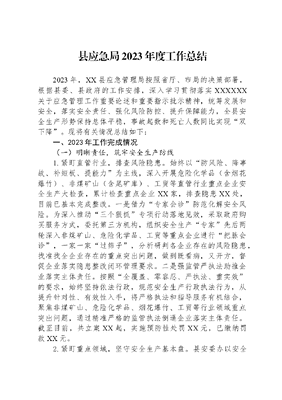 县应急局2023年度工作总结2023年,XX县应急管理局按照省厅、市局的决策部署,根据县委、县政府的工作安排,深入学习贯彻落实XXXXXX关于应急管理工作重要论述和重要指示批示精神,统筹发展和安全,落实安全责任、强化风险防控、提升保障能力,全县安全生产形势保持总体平稳,事故起数和死亡人数同比实现双下降。现将有关情况总结如下:一、2023年工作完成情况(一)明晰责任,筑牢安全生产防线1.紧盯直管行业,排查风险隐患。始终以防风险、降事故、补短板、提能力为主线,深入开展危险化学品(含烟花爆竹)、非煤矿山(含尾矿库)、工贸等直管行业重点企业安全生产大检查,累计检查重点企业XX家,排查隐患XX处,目前已基本完成整改。一是借力专家会诊防范化解安全风险。为深入推动三个狠抓专项行动落地见效,采取政府购买服务方式,委托第三方机构,组织安全生产专家先后两轮深入非煤矿山、危险化学品、工贸等重点企业进行把脉会诊,一家一家过筛子,分析研判各企业存在的风险隐患,找准找全企业存在的重点突出问题,做到既看病,又开方,督促企业落实隐患整改闭环管理要求。二是强监管严执法助推企业落实主体责任。按照全覆盖、零容忍、严执法、重实效的要求,始终坚持依法行政,规范安全生产行政执法行为,从提升针对性、有效性入手,将严格执法和指导服务有机结合,聚焦非煤矿山、危险化学品、烟花爆竹、工贸等行业领域重点突出问题,通过精准严格的监管执法倒逼企业落实主体责任。截至目前,共立案XX起,实施预防性处罚XX元,已缴纳罚款XX元。2.紧盯重点领域,坚守安全生产基本盘。县安委办以安全生产三个狠抓专项行动为抓手,组织协调各成员单位按照统一领导、属地管理、行业监管的原则,种好各方责任田,有效防范化解各类安全风险隐患。一是推进重大事故隐患专项排查整治2023行动。将重大隐患排查整治工作作为压实企业主体责任、部门监管责任和地方党政领导责任的着力点,建立勤通报、勤交办、勤督查工作机制,加强日常调度、责任倒查、精准执法,推动风险隐患真查真改真销案。截至目前,各地各有关单位累计开展安全生产检查XX次,检查场所(企业)XX家(次),排查隐患XX个,完成整改XX项。二是挂牌督办两批重点突出问题。县安委会坚持每季度对安全生产领域重点突出问题实行挂牌督办,自年初以来,已挂牌重点突出问题2批,多次组织召开重点行业领域安全形势分析会和挂牌督办安全生产领域重点突出问题调度会,面对面点对点调度挂牌隐患的整改进展情况。三是统筹推进安全专项整治。县安委办组织开展了有限空间作业专项整治、一厂多租专项整治、醇基燃料等新型液体燃料安全整治、动火作业专项整治等专项督查,下发专项督查通报3份。有限空间作业:累计排查企业541家,发现隐患XX个,完成整改XX个,立案查处企业3家,行政处罚XX万元。一厂(园)多租:县安办在印发方案的基础上,下发工作提示函,对专项整治升温加压。经查,全县涉及一厂(园)多租的出租企业XX家,承租企业XX家,各出租方与承租主体均签订了安全管理协议,立案查处企业1家,行政处罚XX万元。城镇燃气专项整治:扎实开展燃气安全再排查再整治活动,共排查餐饮行业燃气用户XX户,由住建局牵头委托第三方机构逐户进行验收。根据国家及省、市安委会部署,县安委会印发《XX县城镇燃气安全专项整治实施方案》,深入排查整治燃气生产、充装、配送、使用过程中的安全风险和事故隐患。动火作业:在县安委会第三次全体(扩大)会议暨重大事故隐患专项整治推进会上,再动员再部署再推进动火作业审批工作。共检查生产经营单位(个体户)共XX家,动火焊接作业人员XX人,发现隐患XX个,整改XX个。环保设施:针对前期企业自查情况,县应急局、县生态环境分局联合对部分企业环保设施开展了联合检查,对发现问题,下发交办函3份。醇基燃料:印发《全县醇基燃料等新型液体燃料安全专项整治工作方案》,先后召开整治工作调度会,1次经营企业负责人约谈会,向有关部门和乡镇(街道)下发工作交办函和工作提示函,开展整治工作专项督查,将专项整治向纵深推进。 3.紧盯宣传教育,普及安全知识。统筹推进县、乡、村三级公共安全教育培训,深入乡镇、部门、重点企业广泛开展应急科普宣传,营造全社会学法、守法、遵法、用法的法治氛围。截至目前,共宣讲XX场次,受众XX余人。围绕防范灾害风险、护航高质量发展这一主题,组织开展5.12防灾减灾宣传周、5.12防灾减灾日系列宣传,围绕人人讲安全、个个会应急安全生产月主题,扎实开展辖区内、系统内、行业领域内安全生产月和安全生产松兹行系列活动,组织县应急、科经、气象、义工协会等单位赴乡镇开展10.13国际减灾日宣传活动。发放宣传资料约XX余份,悬挂宣传横幅XX余条,开设知识讲座20场次