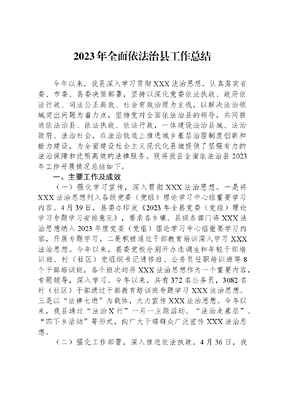 2023年全面依法治县工作总结今年以来,我县深入学习贯彻XXX法治思想,认真落实省委、市委、县委决策部署,坚持以深化党委依法执政、政府依法行政、司法公正高效、社会有效治理为主线,以解决法治领域突出问题为着力点,坚持党对全面依法治县的领导,共同推进依法治县、依法执政、依法行政,一体建设法治县城、法治政府、法治社会,在法治轨道上推进城乡基层治理制度创新和能力建设,为全面建设社会主义现代化县城提供了坚强有力的法治保障和优质高效的法律服务。现将我县全面依法治县2023年工作开展情况总结如下。一、主要工作及成效(一)强化学习宣传,深入贯彻XXX法治思想。一是将XXX法治思想列入各级党委(党组)理论学习中心组重要学习内容。4月39日,县委办印发《2023年全县党委(党组)理论学习专题学习安排意见》,要求各乡镇、县级各部门将XXX法治思想纳入2023年度党委(党组)理论学习中心组重要学习内容,开展专题学习。二是积极通过干部教育培训深入学习XXX法治思想。今年以来,县委党校分别开办选调生和年轻干部培训班、村(社区)党组织书记进修班、公务员任职培训班等8个干部培训班,各个班次均将XXX法治思想作为一个重要内容,专题辅导,深入学习。今年以来,共有372名公务员,3082名村(社区)干部通过干部教育培训班专题学习XXX法治思想。三是以法律七进为载体,大力宣传XXX法治思想。今年以来,我县通过法治X行一月一主题活动、法治走基层、四下乡活动等形式,向广大干部群众广泛宣传XXX法治思想。(二)强化工作部署,深入推进依法执政。4月36日,我县召开了县委全面依法治县工作会议。会议传达学习了中央、省委和市委相关会议精神,对今后一个时期全面依法治县工作进行了安排部署。县委书记吴明禹主持会议并对做好今后一个时期全面依法治县重点工作作了强调。6月3日,县委全面依法治县委员会印发《县委全面依法治县委员会2023年工作要点》对2023年全面依法治县工作作出全面安排部署。3月22日,县委办、县政府办印发《县党政主要负责人履行推进法治建设第一责任人职责实施细则》,为乡镇党委政府,县级部门主要负责人履行推进法治建设第一责任人职责提供基本遵循。(三)强化权力运行,深入推进法治政府建设。一是及时修订行政决策相关制度。为进一步规范县政府议事决策行为,4月2日,县十八届政府第93次常务会议对《县人民政府议事规则》《县人民政府重大行政决策合法性审查制度》进行了部分修订,确保县政府重大行政决策制度更加适应经济社会发展。二是严把合法性审查关,确保重大行政决策质量。今年以来,共出具合法性审查意见书32件、意见反馈单370余份。三是完成2022年度行政执法案卷评查工作。行政执法案卷评查工作组对36个重点县级行政执法部门随机抽取行政执法案卷共306卷(其中行政处罚94卷,行政许可32卷),从实体、程序、文书等诸多方面逐一进行评查。经过评查,评选出优秀案卷96卷。四是认真做好行政复议工作。截至目前,县政府共接收行政复议案件34件,受理29件,已办结24件,维持5件,驳回7件,调解结案3件,撤销2件,申请人主动撤回9件,正在办理中5件,法定期限内结案率300%。五是加强执法人员资格管理。认真组织2023年全县行政执法人员法律知识考试,全县677名执法人员全部通过考试。六是深入推进放管服改革,进一步优化营商环境。完成了政务服务大厅标准化升级改造,着力打造3个无差别综合服务区+9个服务专区,设立了跨省通办等窗口,梳理公布了异地通办三张清单,全面实现高频事项跨省通办目标。(四)强化改革担当,深入推进公正司法。一是强力推动生效法律文书的执行,积极推进诚信社会建设。县法院秉承善执敢执理念,组建3+N新型执行团队,围绕4+3第三方评估体系研判,大力推进快慢分道、繁简分流的执行机制。截至目前,执结案件3505件,执行到位金额8033.05万元。二是构建预先调+速裁机制全覆盖+多元化解的大速裁机制,解纷效果进一步提升。截至目前,县法院速裁收案3836件,占民事收案68.88%,结案3400件,占民事结案比70.74%。三是妥善审理民生案件,助推和谐社会建设。今年以来,县法院审理劳动争议、劳动就业、教育医疗、社会保障等案件393件;审结婚姻,抚养、扶养、赡养等家事案件3638件,调撤率64.4%。四是深入推进刑事犯罪案件适用认罪认罚从宽制度,进一步提升刑事诉讼时效。适用认罪认罚从宽制度审结266件356人,认罪认罚从宽制度适用比例为87.47%。县检察院适用认罪认罚从宽制度不起诉37人,占比30.39%;适用认罪认罚从宽制度起诉至法院的案件中,提出量刑建议206人,法院采纳量刑建议202人,采纳率为98.06%。五是积极推进公益诉讼,大力维护国家利益。截至目前,县检察院受理行政