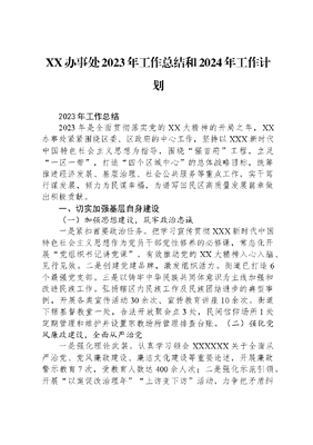 XX办事处2023年工作总结和2024年工作计划2023年工作总结2023年是全面贯彻落实党的XX大精神的开局之年,XX办事处紧紧围绕区委、区政府的中心工作,坚持以XXX新时代中国特色社会主义思想为指导,围绕强首府工程,立足一区一带,打造四个区域中心的总体战略目标,统筹推进经济发展、基层治理、社会公共服务等重点工作,实干笃行谋发展,倾力为民谋幸福,为谱写回民区高质量发展篇章做出积极贡献。一、切实加强基层自身建设(一)加强思想建设,筑牢政治忠诚一是紧扣首要政治任务。把学习宣传贯彻XXX新时代中国特色社会主义思想作为党员干部党性修养的必修课,常态化开展党组织书记讲党课,有效推动党的XX大精神入心入脑、见行见效。二是创建党建品牌,激发组织活力。街道已打造6个最强党支部。三是以铸牢中华民族共同体意识为主线加强和改进民族工作。弘扬辖区内民族工作及民族团结进步的典型事例,开展各类宣传活动30余次、宣传教育讲座10余次。街道下辖基督教堂一处,合法开放聚会点3处,民间信仰场所1处定期管理和维护并设置宗教场所管理排查台账。(二)强化党风廉政建设,全面从严治党一是强化理论武装。认真学习领会XXXXXX关于全面从严治党、党风廉政建设、廉洁文化建设等重要论述,开展廉政警示教育7次,受教育人数达400余人次;二是强化示范引领。开展以案促改治理年上访变下访活动,力争把矛盾纠纷问题解决在基层;开展诫勉谈话1人,批评教育1人,约谈4人次,党内警告处分1人;按照区纪委文件要求填报廉政档案429人。三是强化政治监督。按照一岗双责的工作要求,街道纪工委认真履行监督职责,对街道党工委三重一大决策程序执行、专题民主生活会质量、巡察整改等情况开展监督检查;开展三个是否问题专项整治工作,加强纪律监督检查。健全完善三务公开平台和机制,推动监督工作由线下转移到线上。(三)抓好党的组织体系建设一是完善领导体制机制。成立XX街道全面提升基层治理能力和水平工作领导小组,由XX街道党工委书记担任组长,先后开展强化理论武装专项学习16次。二是强化基层干部队伍建设。XX街道共有8个城市社区、3个村转居社区,目前已有3个城市社区书记完成更换;启动雏鹰计划,以培优社区两委为目标,提升社区工作者的基层治理能力和水平,各社区已全部配备90后专职副书记。三是打造示范点。以创建全国文明城市为抓手,打造2个市级文明社区,3个文明示范小区,营造共建共治共享氛围。(四)认真做好宣传和精神文明建设工作一是构建意识形态工作网络。深入贯彻落实意识形态工作责任制,召开1次意识形态部署会,分析研判会2次;建立和完善街道意识形态网格化管理机制,打造了一支高效的意识形态网格员队伍;围绕学习贯彻党的XX大精神、全国两会精神等重大主题,开展线上线下宣讲74场次,受众5000余人次;组建了15人的街道网评员队伍,开展网评员分级轮训和实战演练,增强网络舆论引导能力。二是推动信息报送工作高效化。当前19篇信息被中央级媒体采用,13篇信息及视频被自治区级媒体采用,被市级媒体采用95篇,被区级媒体采用99篇。三是打造了乐享银铃志愿服务品牌。组建了夕阳红小水滴等志愿服务队,多次荣获回民区优秀志愿服务组织,并获得呼和浩特市学雷锋志愿服务最佳志愿服务组织称号。四是增强科普服务能力。街道共发放各类科普宣传资料300多份,受众500余人。(五)落实党管武装责任,推动退役军人服务一是完善阵地建设,街道武装部按照六有标准配置三室一库,协调辖区企事业单位积极参与国防教育、民兵建设等工作。二是编强编实街道应急连、应急排民兵队伍,目前,共编建应急连15人,应急排30人,重新编排基干民兵35人。主要完成常态维稳执勤、训练、应急、防汛等任务,全力参与辖区网格化巡控。三是落实征兵宣传动员工作。利用各类平台媒介开展征兵宣传活动22余次,发放宣传材料1000余份,悬挂宣传条幅21条。2023年兵役登记120人,完成率达100%。四是打造优质服务。设立退役军人一站式服务窗口,完善街道1211工作清单,通过线上+线下宣传已采集1784人,发放优待证1215人,发放光荣牌1485块。二、重点工作完成情况(一)持续推动经济高质量发展一是营造最优营商环境。组建经济专班,定期调度分析经济运行情况,已维护经济名录库4434家,实地核查4525家,招商引资66家。扎实部署全国第五次经济普查工作。二是合理布局,打造经济发展新格局。以点连线形成XX东西为主线,工农兵路南北呼应的区位经济链条式发展。主线东侧以现有元和建材市场为基础,打造综合性建材家装商业体。同时依托XX汽车产业商圈区位优势,逐步丰富汽车产业周边业态包括文化广场、汽车停放展示、体验休闲等衍生行业,形成XX主体经济。以工农兵道路提升工程为