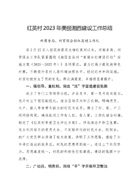 红英村2023年美丽湘西建设工作总结州商务局、州贸促会驻红英村工作队自7月27日入驻花垣县双龙镇红英村以来,州商务局、州贸促会工作队紧紧围绕《湘西自治州美丽乡村建设行动实施方案(2021—2025年)》各项要求,着力打造少数民族特色村寨,不断提升农村人居环境治理水平。经过近半年的实施,村容村貌发生了质的变化,群众满意度、幸福感显著提升。一、强领导,重机制,突出活字营造建设氛围成立了专门工作领导小组,并由支书、第一支书任双组长,包片村主干担任副组长,结合互助五兴和三长制,明确党员、大户、能人等有带头能力的村民为成员,建立了村、组、户三级网络构架,确保此项工作有人抓,有人管。工作队结合村情,制定了《红英村季度卫生评比方案》,评选清洁户和卫生寨。充分利用每月的党员大会、不定期举行的村民大会、院坝会,向广大党员群众讲清了有关政策,讲明了工作思路,描绘了今年将打造出的效果后,村民的思想得到统一。通过上下共同努力,思想高度统一,村民的积极性空前高涨,建设的氛围十分浓厚。二、广动员,明责任,围绕干字开展环卫整治建设美丽乡村,环境卫生整治是关键。红英村民勤劳朴实,卫生意识、自觉性普遍较高,村民的房前屋后卫生情况良好。但从大面上看,村子周边,规划无序,乱搭乱建,杂序无章。为此,工作队、村支两委进行了针对性部署。一是打造门面,结合11.3(即花垣县吉客节)活动,对319国道沿线沟渠进行全面硬化,并对门廊亭阁进行优化美化;二是科学规划,充分整合村域有限空间,拆除乱搭乱建200余平米,进一步优化垃圾集中清运点,并修建小型停车场一座;三是完善机制,一方面聘请环卫保洁工人,实行合同制,一年一签,工资按时兑现,另一方面利用一课一片一实践活动等契机,充分发动党员志愿者参加义务劳动,清理死角死面垃圾,确保卫生状况不反弹、常态化。三、筹资金,配设施,强化新字提升标准建设在召开全体村民大会时,我们认真征求了群众最关心、最迫切需要解决的问题,认真研究梳理,并多次向县委县政府有关部门、后盾单位作汇报。在具体工作中,我们严格按照资金跟着项目走,项目跟着规划走的实施原则,立足道路硬化、路灯亮化、河道净化、卫生洁化、村庄绿化目标,扎实在基础设施、民心工程上发力。通过几个月的精心打造,100米通组道路得到拓宽硬化,50亩严格管控区农田已翻土并播种油菜,太阳能路灯、2.5机耕道修建、1800米排水渠、稻花鱼养殖基地、党群活动中心提质改造、红英水库维护等项目均纳入县级规划,在此基础上,后盾单位还计划对个别地灾点进行堡坎,对人饮工程进行修缮。通过系列举措,极大地改善了村居环境,满足了群众日益丰富的文化休闲生活需要。四、解民意,惠民生,立足实字凝聚党心民心建设美丽乡村,目的还是为了改善农民生产生活环境,提高农民生产性收入。为此,我们在着力加强基础设施建设的基础上,充分发挥红英村离城近、交通便利的区位优势,围绕村民群众腰包鼓起来的目标,吸引有实力的投资者到村投资兴业,以此带动全镇农村改变观念,发家致富。目前,依托便捷的交通、充足的闲置土地、良好的村民素质,村支两委、工作队积极争取东晟公司107亩吴茱萸种植基地落户红英村,并计划通过土地流转,打造高粱种植基地和棕粑叶育苗基地,以产业富民举措吸引外出务工农民返村创业,进一步壮大集体经济,紧密干群关系,凝聚了党心民心。下一步,我们在美丽湘西建设中将始终注重把单项工作与整体工作整合开展,把近期目标与远景战略统筹安排,把环境整治与产业发展并重推进;注重宣传教育工作,发挥村民主体作用,推动产业多元化发展;注重村级事务管理便捷化,群众生产生活多样化,致富信息共享丰富化,确保美丽湘西建设工作走向纵深,深得民心。