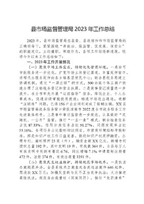 县市场监督管理局2023年工作总结2023年,县市场监管局在县委、县政府和市市场监管局的正确领导下,紧紧围绕讲政治、强监管、促发展、保安全的职能定位,主动履职、积极作为,各项工作取得新进展。现将今年以来工作总结如下:一、2023年工作开展情况(一)聚焦市场主体需求,持续优化营商环境。一是许可审批服务进一步优化。扩宽市场主体登记渠道,丰富延伸窗口,将帮代办服务延伸向各乡镇基层便民中心;联合县税务局建立协调机制,通过一屏注销的方式,500余家个体工商户快速办理了注销税务登记和营业执照。二是商事登记质量进一步提升。在全市率先开展证前指导服务,降低企业、个人办事成本,促进后续审批提质提效;畅通市场退出通道,破解注销难问题,已将156户企业顺利完成了强制注销。XX县市场监管局政务服务窗口荣获淮南市2022度全市政务服务工作先进集体称号。三是事中事后监管进一步规范。认真做好双随机、一公开监管,推行一业一查模式,联合抽查任务占比87.33%,信用分类任务占比91.27%,问题发现率占比55.16%,各项任务占比指标均达到省、市营商环境指标考核标准。四是知识产权工作日益完善。推动知识产权质押融资,办理专利、商标质押23笔(件),融资金额XX亿元。新增专利授权总量192件,其中发明19件,有效数364件,全县每万人有效发明专利拥有量达6.76,同比增幅7.1%.申请商标注册量472件,注册274件,有效注册量3291件。(二)聚焦民生权益维护,持续规范市场秩序。一是执法办案刚柔并济。全县系统共立案查处各类违法案件646起件,罚没款XX万元;加强反垄断与反不正当竞争执法;大力推进柔性执法,规范自由裁量权(同案同罚),推行免罚清单制度。二是专项整治深入推进。积极开展2023民生领域案件查办铁拳行动,共办理案件483起,罚没款合计X万元。严厉打击打击市场销售长江流域非法捕捞渔获物行为,倡导文明理性消费。常态化扫黑除恶斗争主要工作,扎实有序开展打击整治养老诈骗专项行动。三是消费环境不断改善。畅通投诉举报渠道,全年共受理处理消费者各类诉求5180件,为消费者挽回损失XX万余元;开展2022-2023年度放心消费示范单位创建工作,认定县级放心消费示范单位企业30家,申报6家市级放心消费示范单位,1家省级放心消费示范企业。(三)聚焦基本民生保障,持续筑牢安全底线。一是食品安全保障水平不断提升。开展食品安全示范县复审工作,通过省食安办复审,XX县再次命名安徽省食品安全示范县。切实推进两个责任落实,我县A级主体2家;B级主体52家;C级主体201家;D级主体5096家。深入开展食安守护专项行动和两超一非问题专项整治。聚焦重点领域全面查、重点品种靶向检。截至目前,已出动执法人员1097余人次,检查食品生产经营单位1432家次,下达责令整改通知书14份,立案查处3起。全面推进制止餐饮浪费专项行动,立案查处餐饮浪费违法行为60件,发放制止餐饮浪费告知书,印制《反食品浪费法》6000余份,印发制止餐饮浪费和光盘行动等宣传手册4000余份。邀请人大代表、政协委员开展随机查餐厅活动15次。修订完善县食品安全事故应急预案。健全信息共享机制,强化演练培训。加大食品安全违法查办案件力度。今年以来,立案查处各类食品案件376件,罚没款XX万元,移送公安部门1件。完成食品(食用农产品)快检检测41529批次,其中,不合格405批次,合格率99.02%。二是药品监管能力建设全面加强。开展药品安全风险隐患排查工作,登记药械安全风险136个,销号整改率100%。结合3.15曝光的化妆品用于注射的问题,开展化妆品美容行业大排查活动;联合卫健部门开展执业药师挂证专项整治工作,发现挂证执业药师22名,目前正在处理中;联合县医保局开展双随机检查工作;部署开展医疗器械质量安全专项整治;疫苗专项检查;儿童化妆品专项检查;化妆品标签专项检查等。共出动执法车辆1274台次,执法人员3185人次,检查药品经营使用单位690家次,检查医疗器械经营使用单位676家次,检查化妆品经营使用单位395家次。深入落实部门协同、行刑衔接工作机制,畅通药品涉刑案件假劣药评定快速通道,协助公安部门对药械开展认定工作3次,认定案件2起。截至目前,全县已立案药械化案件68件,办结61件,罚没XX万元。12315平台接收药械化投诉举报14件,立案7件,立案率50%,按时核查率100%。开展化妆品科普宣传周、医疗器械安全宣传周、爱心送考等宣传活动,印制发放《化妆品知识宣传手册》、《医疗器械宣传册》共计6000本化妆品监管APP二维码1000张。三是特种设备安全治理不断深化。制定全县特种设备使用单位监察计划,监察重点使用单位108家,推行智慧电梯96366